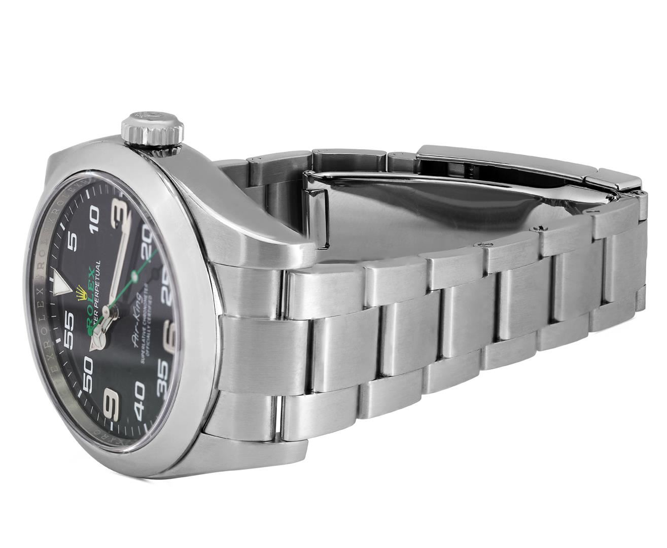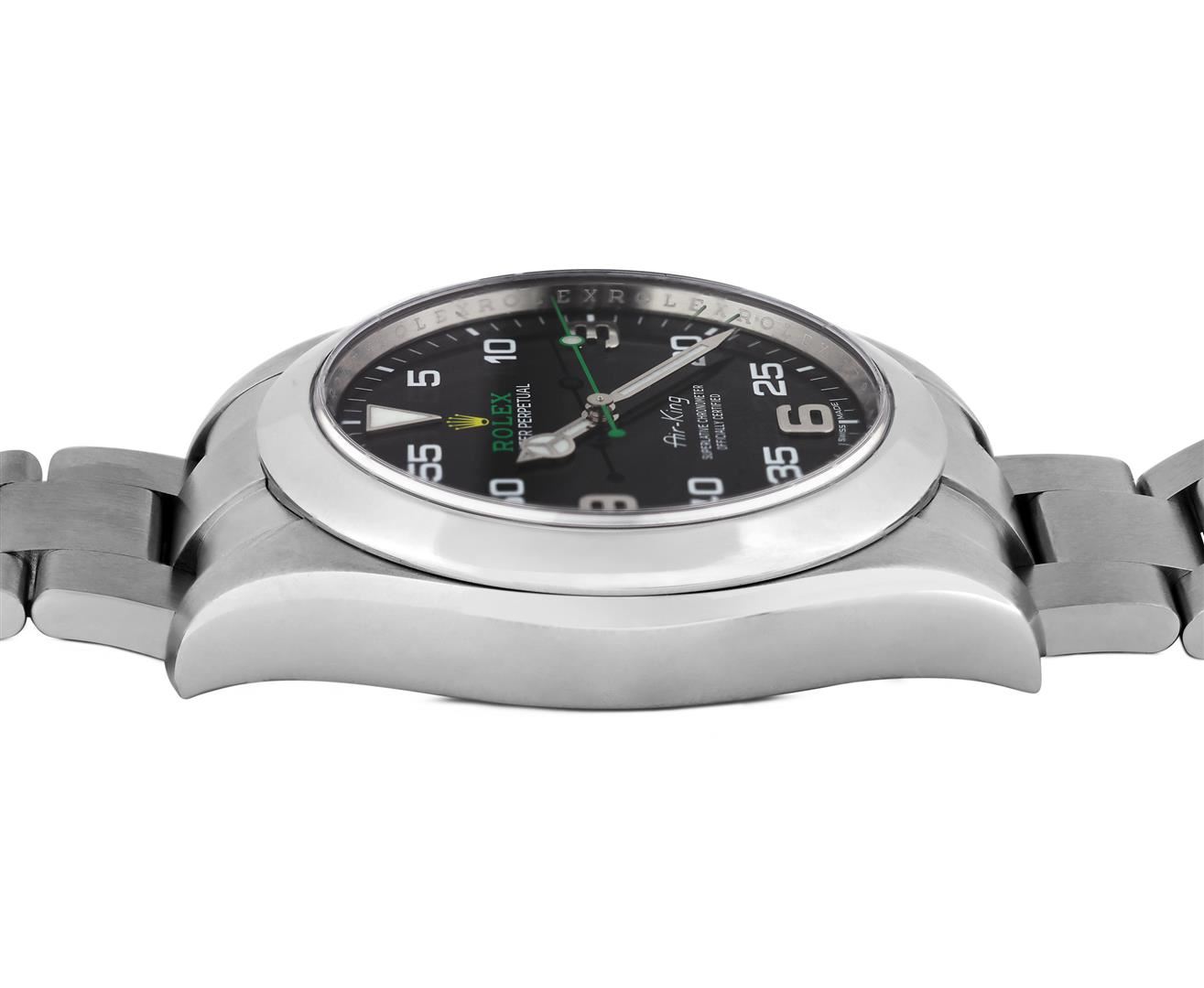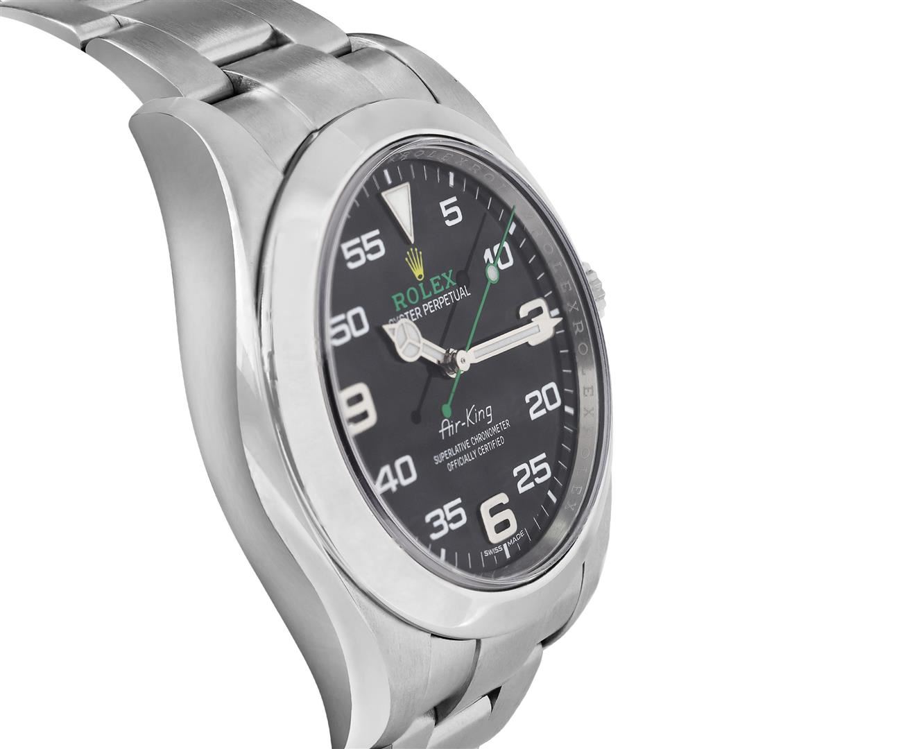 One Mens Pre Owned Stainless Steel Rolex Air King Polished, Serviced & Electronically Tested, Rolex Stainless Steel Case: 40mm, Rolex Stainless Steel Crown, Rolex Bezel: Stainless Steel Smooth Bezel. Rolex Crystal: Sapphire Crystal. Rolex Movement: Automatic Winding Movement Caliber 3131. Rolex Dial: Black Air King Dial with Arabic Hour Markers with Luminous 12 O' clock marker, and Dash Track. Rolex Hands: Luminous Air King Hands. Model: Stainless Steel Air King, Condition: G-6 Extra Fine. Rolex Bracelet: Stainless Steel Oyster Band. Bright Polish & Satin Finish. 7.0 Inch Length, Adjustable. Standard Rolex Clasp, With Rolex Logo. This Watch Comes With A Rolex Box.