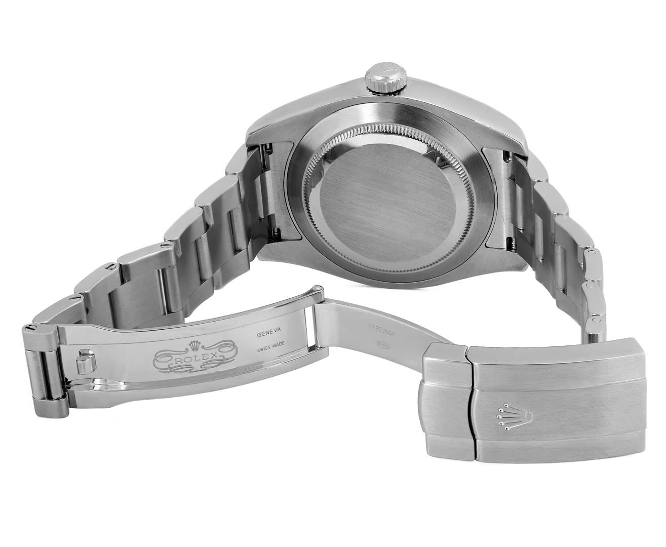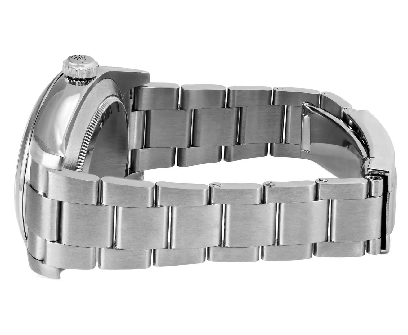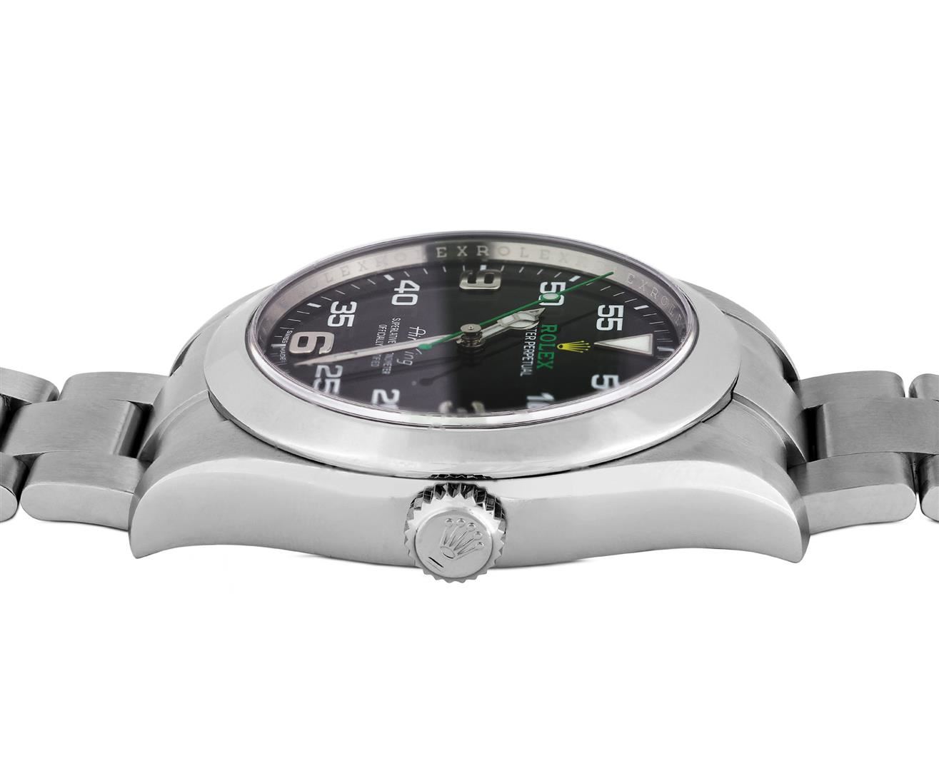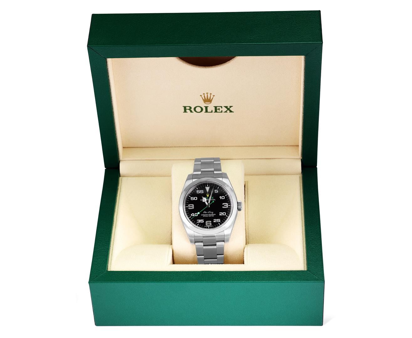 One Mens Pre Owned Stainless Steel Rolex Air King Polished, Serviced & Electronically Tested, Rolex Stainless Steel Case: 40mm, Rolex Stainless Steel Crown, Rolex Bezel: Stainless Steel Smooth Bezel. Rolex Crystal: Sapphire Crystal. Rolex Movement: Automatic Winding Movement Caliber 3131. Rolex Dial: Black Air King Dial with Arabic Hour Markers with Luminous 12 O' clock marker, and Dash Track. Rolex Hands: Luminous Air King Hands. Model: Stainless Steel Air King, Condition: G-6 Extra Fine. Rolex Bracelet: Stainless Steel Oyster Band. Bright Polish & Satin Finish. 7.0 Inch Length, Adjustable. Standard Rolex Clasp, With Rolex Logo. This Watch Comes With A Rolex Box.
