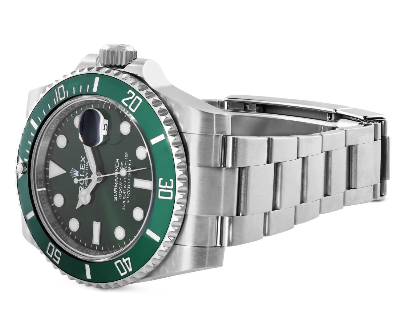 One Mens Pre Owned Rolex Stainless Steel Submariner With Date Polished, Serviced And Electronically Tested, Rolex Stainless Steel Case: 40mm, Rolex Stainless Steel Crown, Rolex Bezel: Stainless Steel Rotatable Bezel With Ceramic Green Insert. Crystal: Sapphire With Magnified Date Window. Rolex Movement: Automatic Winding Movement Caliber 3135. Rolex Dial: Green Submariner Dial with Luminous Index Hour Markers And Dash Track. Date Window: 3 O'Clock Position Date Display, Model: Date Submariner, Quickset, Condition: G-6 Extra Fine. Rolex Bracelet: Stainless Steel Oyster Band. Bright Polish And Satin Finish. 7.0 Inch Length, Adjustable. Standard Clasp, With Rolex Logo. This Watch Comes With A Rolex Box And Card.