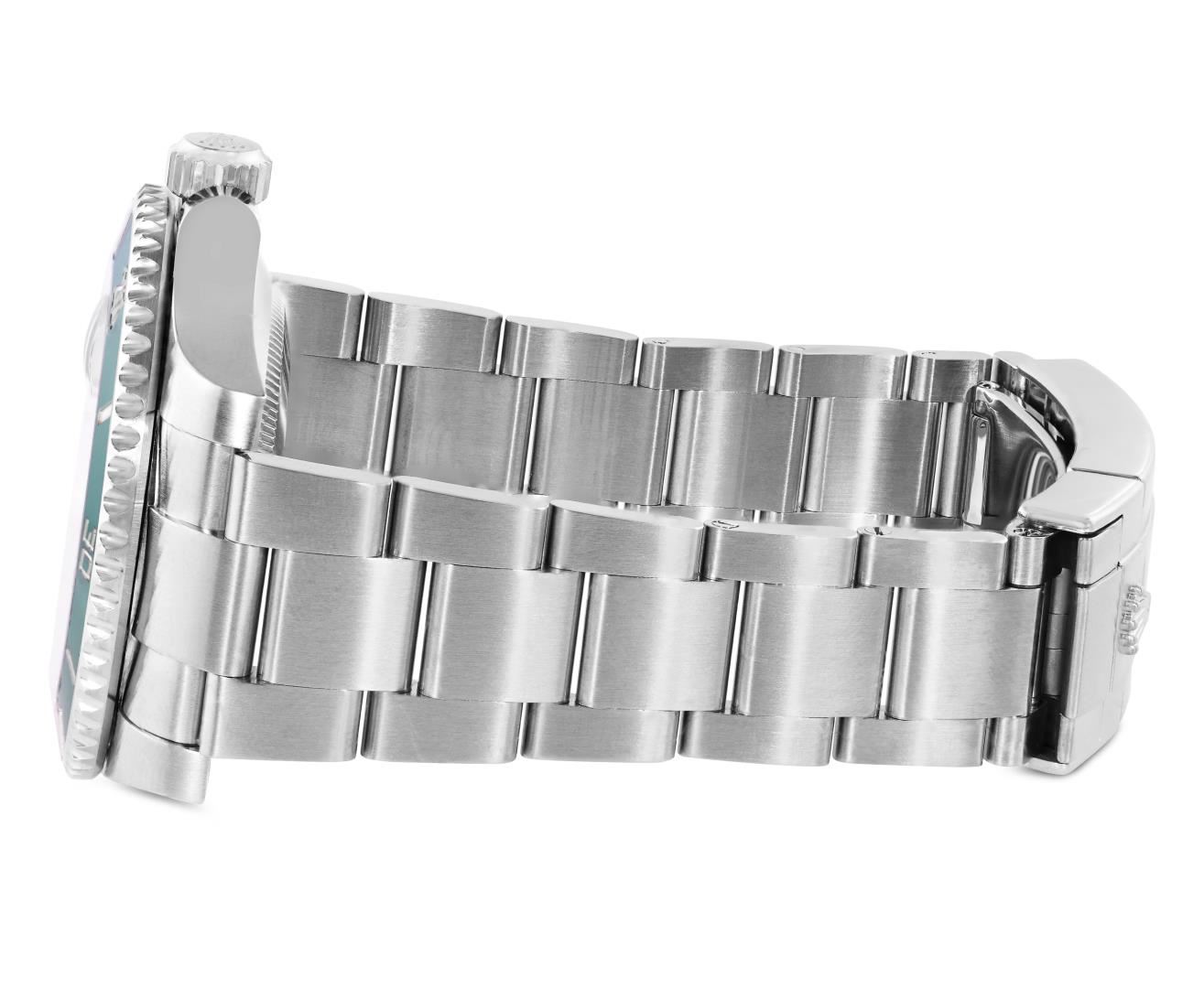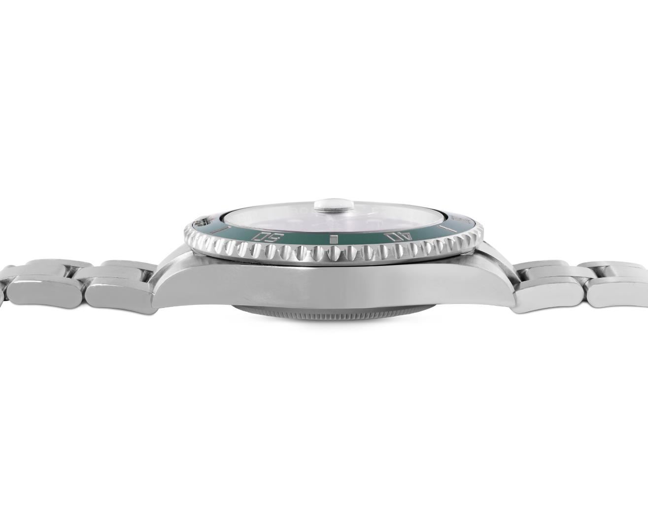 One Mens Pre Owned Rolex Stainless Steel Submariner With Date Polished, Serviced And Electronically Tested, Rolex Stainless Steel Case: 40mm, Rolex Stainless Steel Crown, Rolex Bezel: Stainless Steel Rotatable Bezel With Ceramic Green Insert. Crystal: Sapphire With Magnified Date Window. Rolex Movement: Automatic Winding Movement Caliber 3135. Rolex Dial: Green Submariner Dial with Luminous Index Hour Markers And Dash Track. Date Window: 3 O'Clock Position Date Display, Model: Date Submariner, Quickset, Condition: G-6 Extra Fine. Rolex Bracelet: Stainless Steel Oyster Band. Bright Polish And Satin Finish. 7.0 Inch Length, Adjustable. Standard Clasp, With Rolex Logo. This Watch Comes With A Rolex Box And Card.