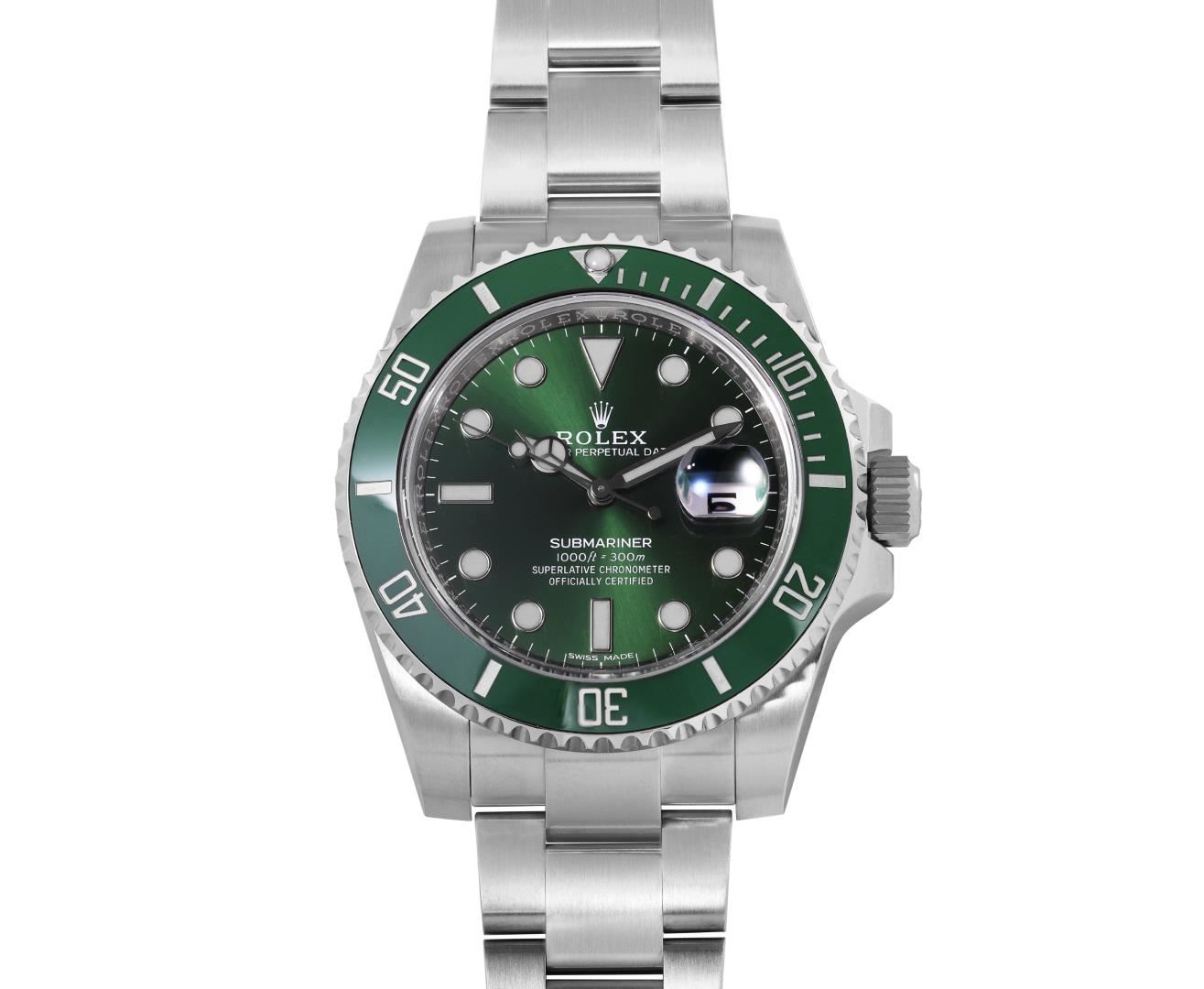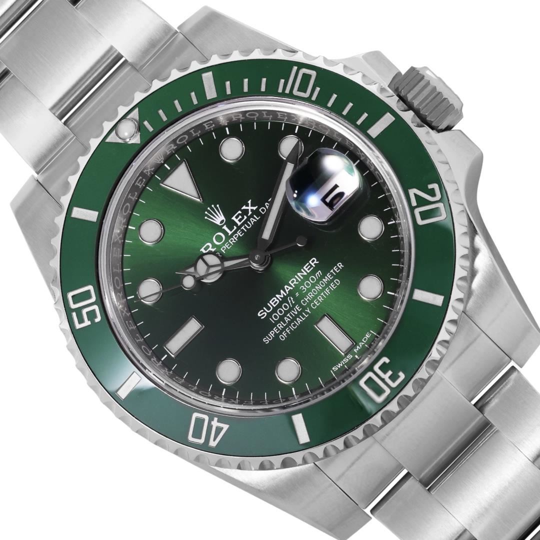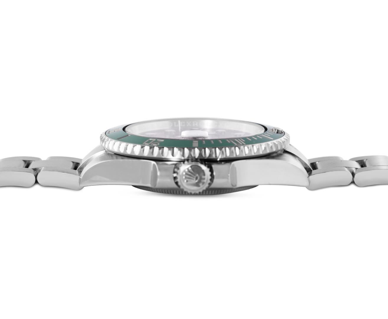 One Mens Pre Owned Rolex Stainless Steel Submariner With Date Polished, Serviced And Electronically Tested, Rolex Stainless Steel Case: 40mm, Rolex Stainless Steel Crown, Rolex Bezel: Stainless Steel Rotatable Bezel With Ceramic Green Insert. Crystal: Sapphire With Magnified Date Window. Rolex Movement: Automatic Winding Movement Caliber 3135. Rolex Dial: Green Submariner Dial with Luminous Index Hour Markers And Dash Track. Date Window: 3 O'Clock Position Date Display, Model: Date Submariner, Quickset, Condition: G-6 Extra Fine. Rolex Bracelet: Stainless Steel Oyster Band. Bright Polish And Satin Finish. 7.0 Inch Length, Adjustable. Standard Clasp, With Rolex Logo. This Watch Comes With A Rolex Box And Card.