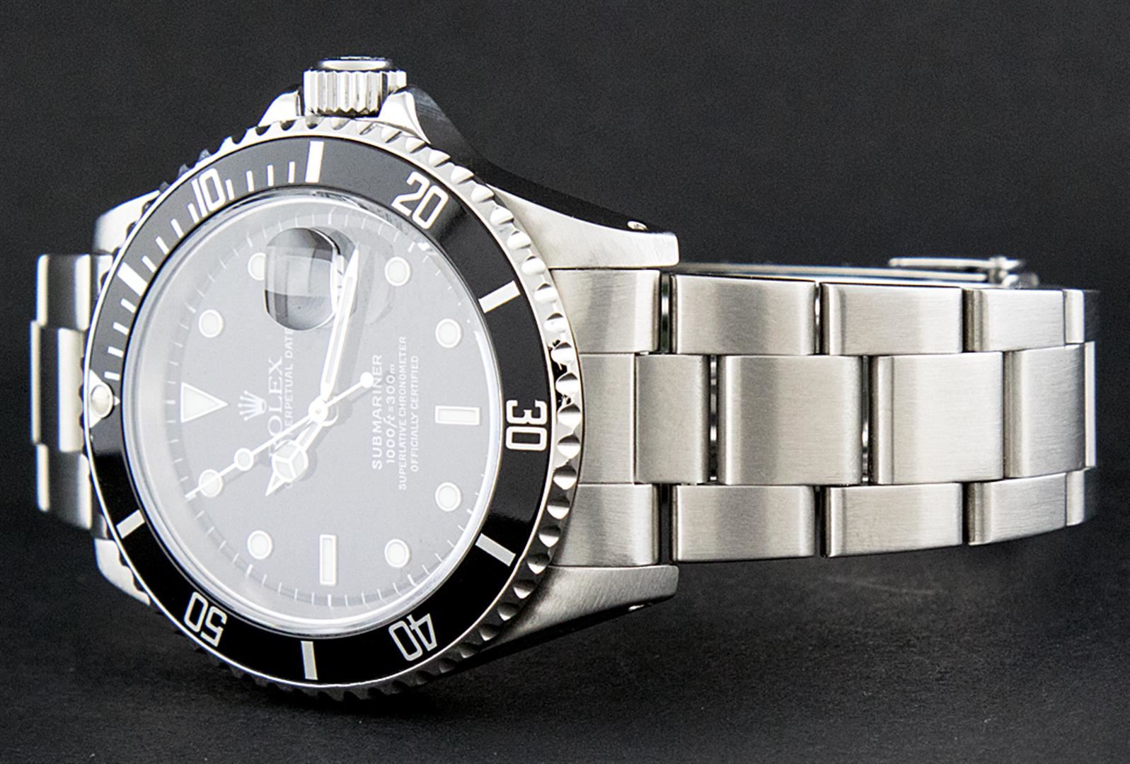 One Mens Pre Owned Rolex Submariner With Date Polished, Serviced & Electronically Tested, Rolex Stainless Steel Case: 40mm, Rolex Stainless Steel Crown, Rolex Bezel: Stainless Steel Rotatable Bezel With Black Insert. Crystal: Sapphire With Cyclops Lens. Rolex Movement: Automatic Winding Movement Caliber 3135. Rolex Dial: Black Submariner Dial, Hands: Submariner Hands. Date Window: 3 O'Clock Position Date Display, Model: Submariner, Quickset, Condition: G-6 Extra Fine. Rolex Bracelet: Stainless Steel Oyster Band. Bright Polish & Satin Finish. 7.0 Inch Length, Adjustable. Standard Clasp, With Rolex Logo.
