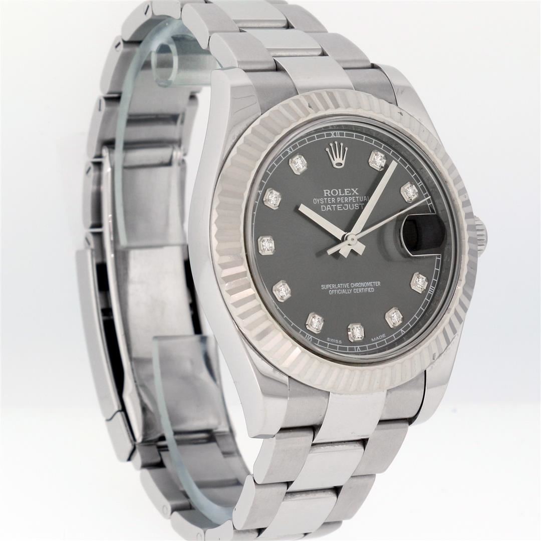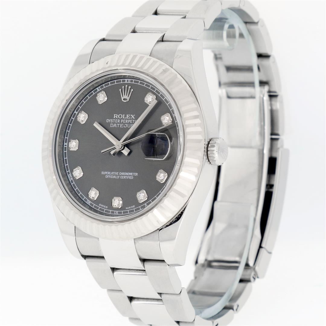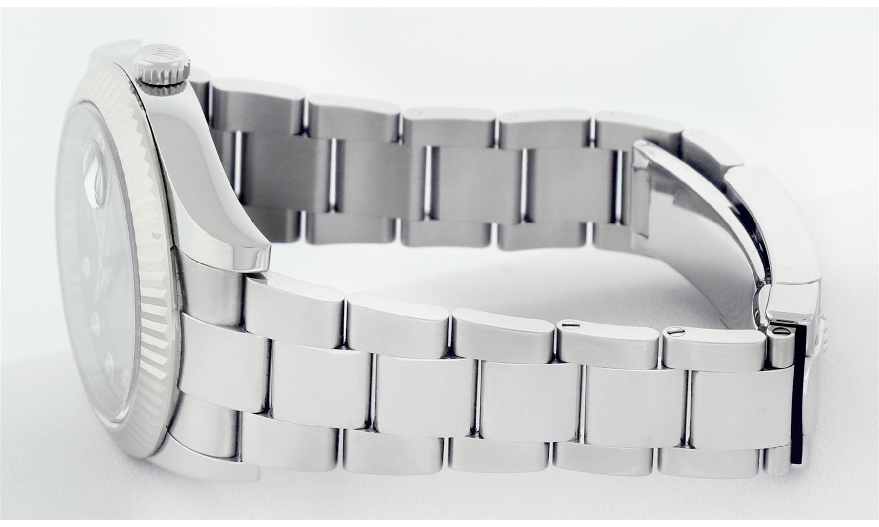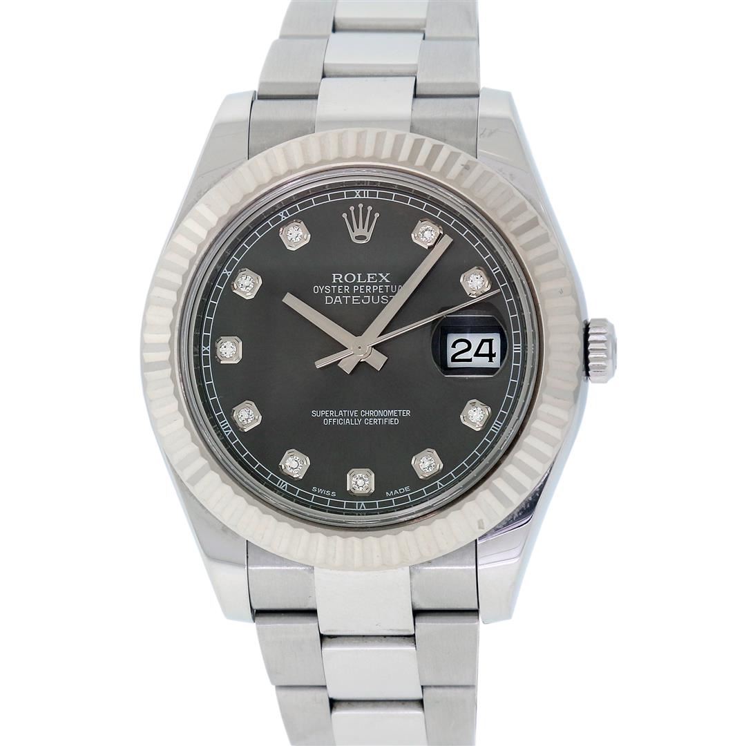 One Mens Pre Owned Rolex Datejust 2 41MM Polished, Serviced & Electronically Tested, Rolex Stainless Steel Case: 41mm, Stainless Steel Crown, Rolex Bezel: 18K White Gold Fluted Bezel, Crystal: Sapphire With Magnified Date Window. Hands: Solid Hands. Rolex