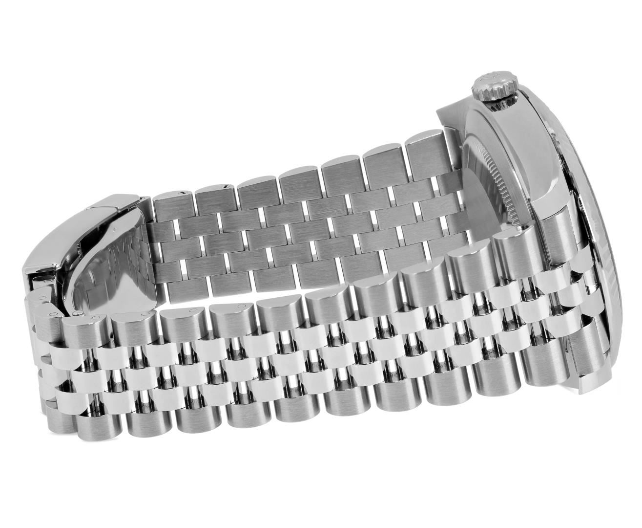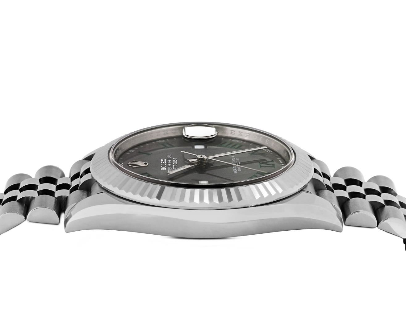 One Mens Pre Owned Stainless Steel Rolex Datejust 41MM Polished, Serviced And Electronically Tested, Rolex Stainless Steel Case: 41mm, Rolex Stainless Steel Crown, Rolex Bezel: 18K White Gold Fluted Bezel. Crystal: Sapphire With Magnified Date Window. Rolex Hands: Lumi Hands. Rolex Movement: Automatic Winding Movement 3235. Rolex Dial: Factory Rolex Wimbledon with Dark Green Roman Numeral Hour Markers. Date Window: 3 O'Clock Position Date Display, Quickset, Model: Datejust 41. Condition: G-6 Extra Fine. Rolex Bracelet: Stainless Steel Jubilee Band. Bright Polish. 7.0 Inch Length, Adjustable. Standard Clasp, With Rolex Logo. This Watch Has Been Serviced And Polished It Is Free Of All Scratches And Dents. This Watch Comes With A Rolex Box And Card.
