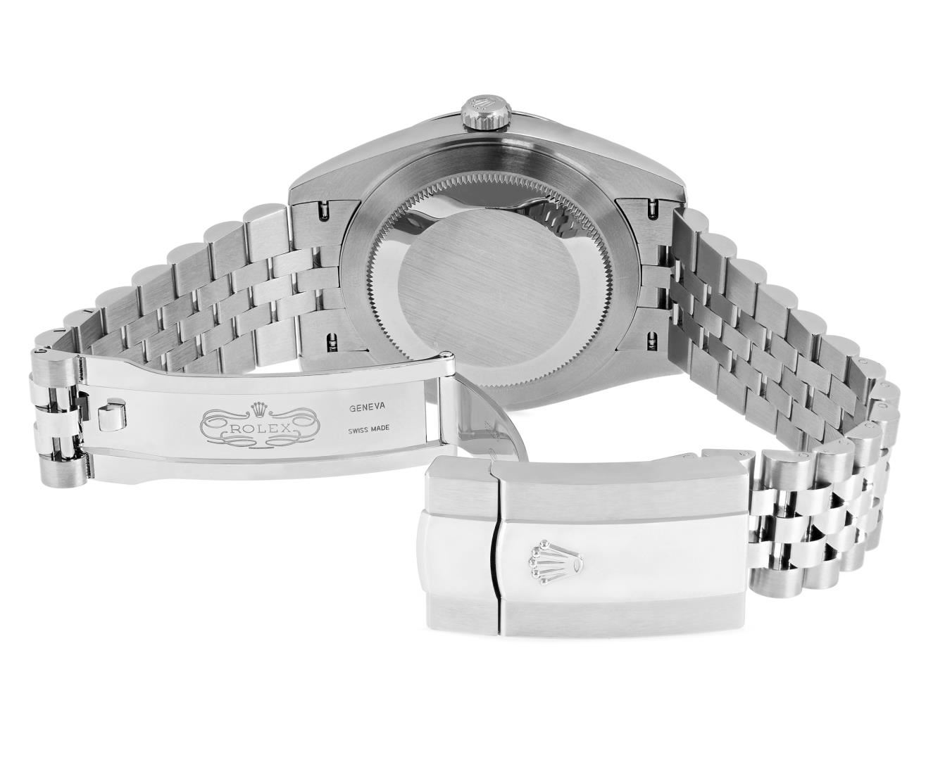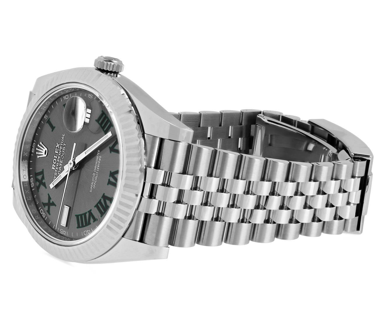 One Mens Pre Owned Stainless Steel Rolex Datejust 41MM Polished, Serviced And Electronically Tested, Rolex Stainless Steel Case: 41mm, Rolex Stainless Steel Crown, Rolex Bezel: 18K White Gold Fluted Bezel. Crystal: Sapphire With Magnified Date Window. Rolex Hands: Lumi Hands. Rolex Movement: Automatic Winding Movement 3235. Rolex Dial: Factory Rolex Wimbledon with Dark Green Roman Numeral Hour Markers. Date Window: 3 O'Clock Position Date Display, Quickset, Model: Datejust 41. Condition: G-6 Extra Fine. Rolex Bracelet: Stainless Steel Jubilee Band. Bright Polish. 7.0 Inch Length, Adjustable. Standard Clasp, With Rolex Logo. This Watch Has Been Serviced And Polished It Is Free Of All Scratches And Dents. This Watch Comes With A Rolex Box And Card.