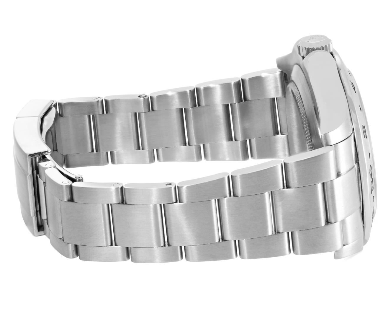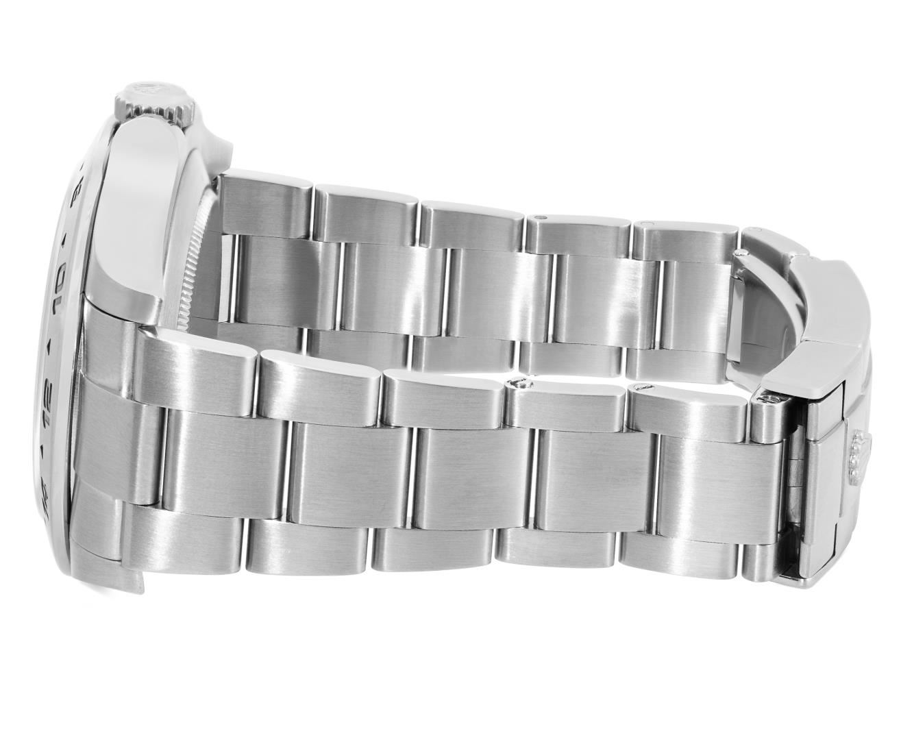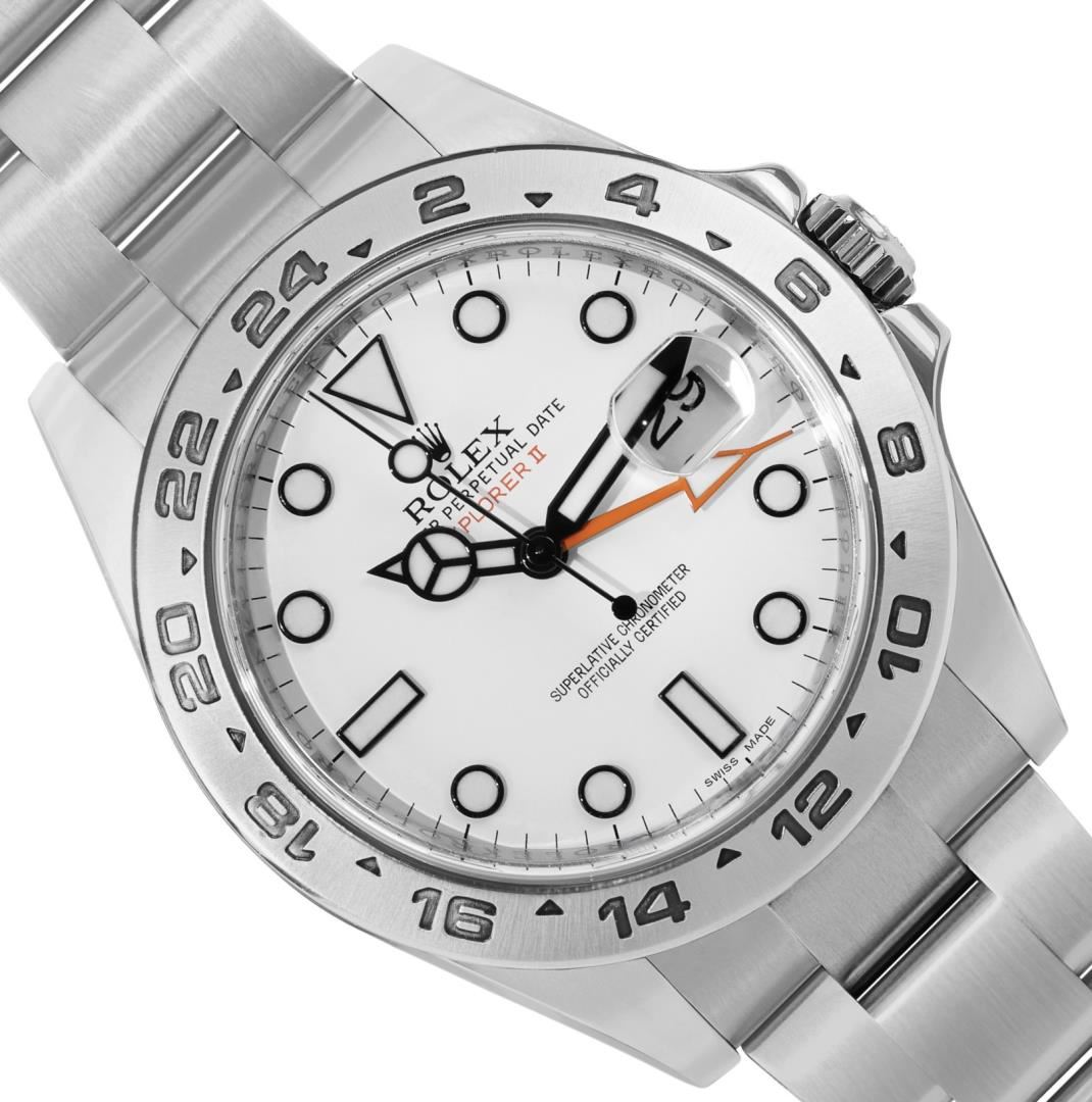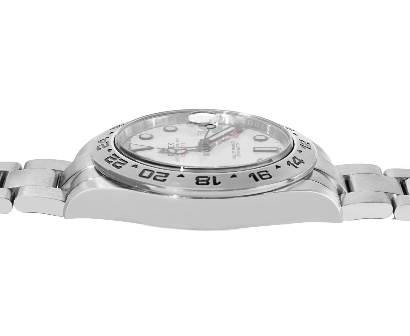 One Mens Pre Owned Stainless Steel Rolex Explorer II With Date is Polished, Serviced And Electronically Tested, Rolex Stainless Steel Case: 42mm, Rolex Stainless Steel Crown, Rolex Bezel: Stainless Steel Rotatable Bezel With Stainless Steel Insert. Crystal: Sapphire With Magnified Date Window. Rolex Movement: Automatic Winding Movement Caliber 3187. Rolex Dial: White Explorer II Dial with Luminous Index Hour Markers And Dash Track. Functions: GMT Hand. Date Window: 3 O'Clock Position Date Display, Model: Date Explorer, Quickset, Condition: G-6 Extra Fine. Rolex Bracelet: Stainless Steel Oyster Band. Bright Polish And Satin Finish. 7.0 Inch Length, Adjustable. Standard Clasp, With Rolex Logo. This Watch Comes With A Rolex Box.