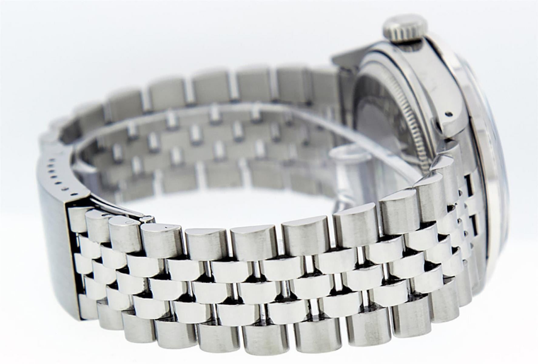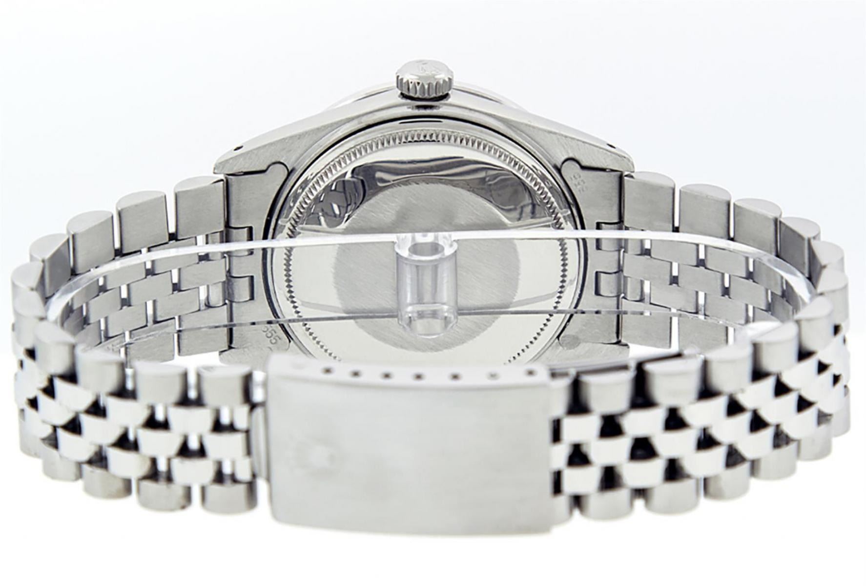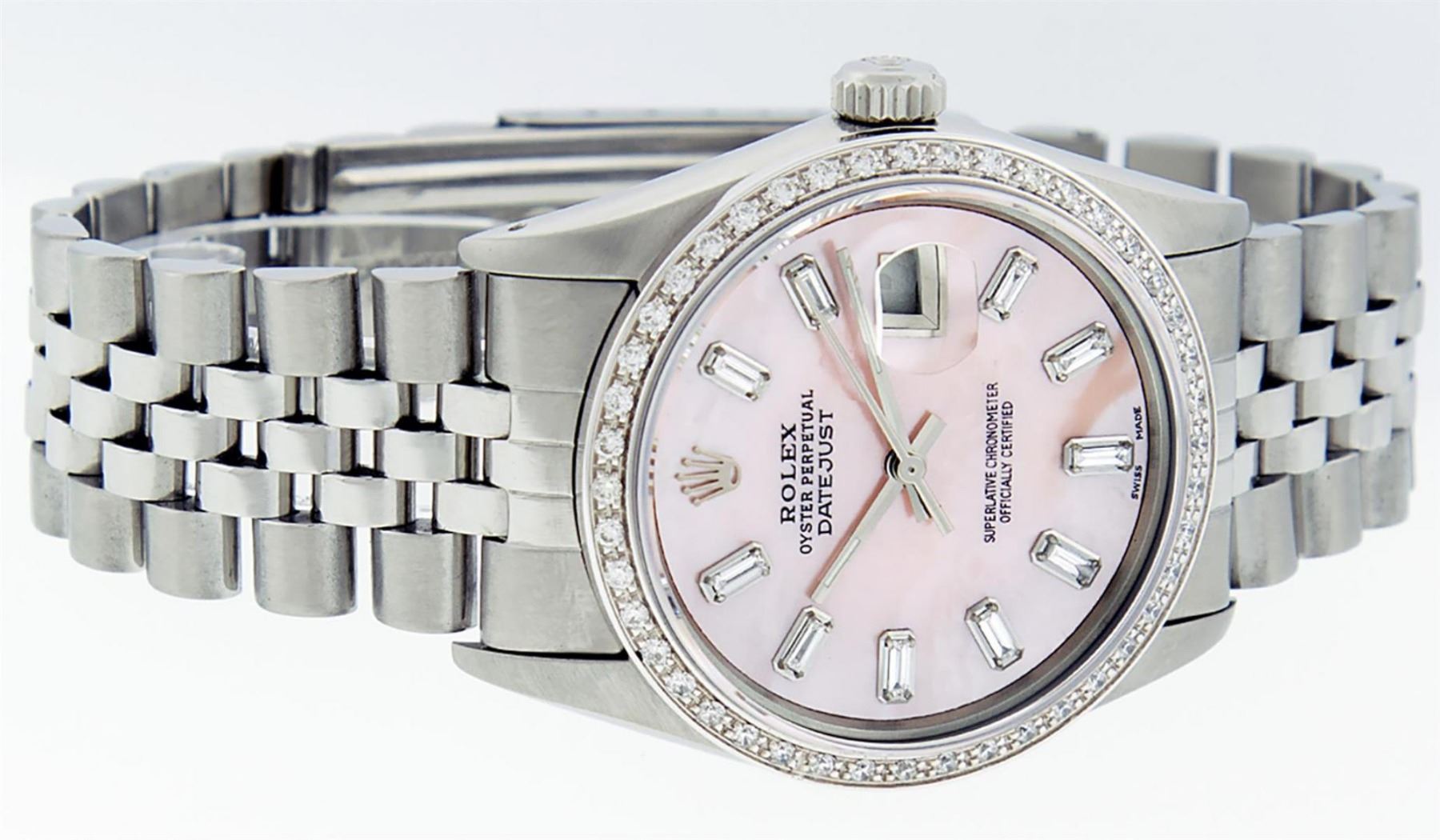 One Mens Stainless Steel Rolex Datejust Polished, Serviced & Electronically Tested, Stainless Steel Case: 36mm, Stainless Steel Crown, New Custom Bezel: 18K White Gold Beadset Diamond Bezel, Diamond Count: 44 Diamonds. Total Weight 1.00 Carat, Clarity: SI-VS, Color: G to H. Custom Crystal: New Scratch Resistant Synthetic Sapphire Cyclops Lens. Custom Hands: New Luminescent Hands. Movement: Automatic Winding Movement. Custom Dial: Light Pink Mother Of Pearl With Baguette Diamond Hour Markers, Stone Count: 10 Diamond Baguettes In Dial. G To H In Color, Clarity: SI-VS. Date Window: 3 O'Clock Position Date Display, Quickset, Model: Datejust. Condition: G-6 Extra Fine. Bracelet: Stainless Steel Jubilee. Bright Polish & Satin Finish. 7.0 Inch Length, Adjustable. Standard Clasp, With Rolex Logo. This Watch Has Been Serviced Time Tested And Is In Excellent Condition It Is Free Of All Scratches And Dents.