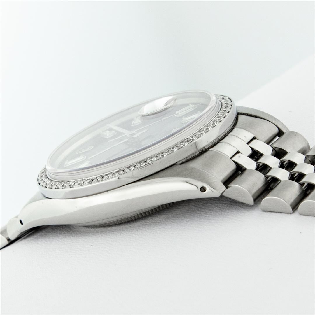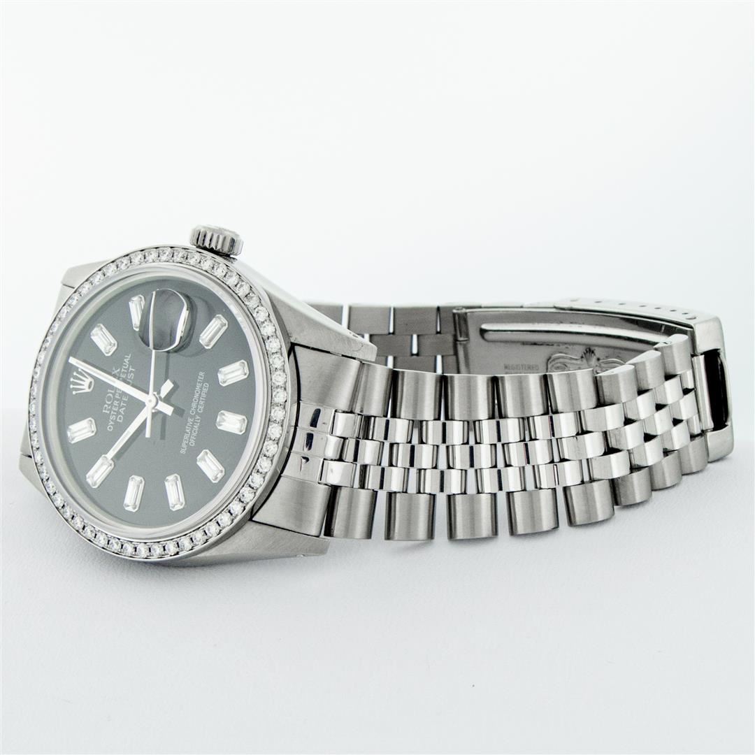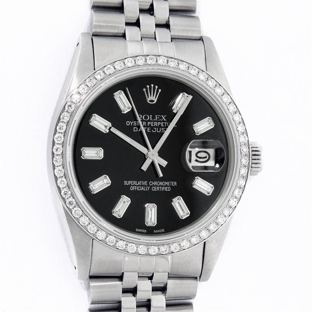 One Mens Rolex Stainless Steel Datejust Polished Bright with Satin Finish, This Watch Has Been Serviced & Electronically Tested, Stainless Steel Case: 36mm, Stainless Steel Crown, Custom Bezel: New Stainless Steel Beadset Diamond Bezel, Diamond Count: 54 Diamonds In Bezel, Total Weight 1.00 Carat, Clarity: SI-VS, Color: G to H. Custom Crystal: New Scratch Resistant Synthetic Sapphire Cyclops Lens. Custom Hands: New Luminescent Hands. Movement: Automatic Winding Movement. Custom Dial: Black Baguette Diamond Dial, Diamond Count: 10 Baguette Diamonds On Dial, Color: G to H, Clarity: VS2-SI1. Date Window: 3 O'Clock Position Date Display, Quickset, Model: Datejust. Condition: G-6 Extra Fine. Bracelet: Stainless Steel Jubilee Band. Bright Polish & Satin Finish. 7.0 Inch Length, Adjustable. Standard Clasp, With Rolex Logo. This Watch Has Been Serviced Time Tested And Is In Excellent Condition It Is Free Of All Scratches And Dents.