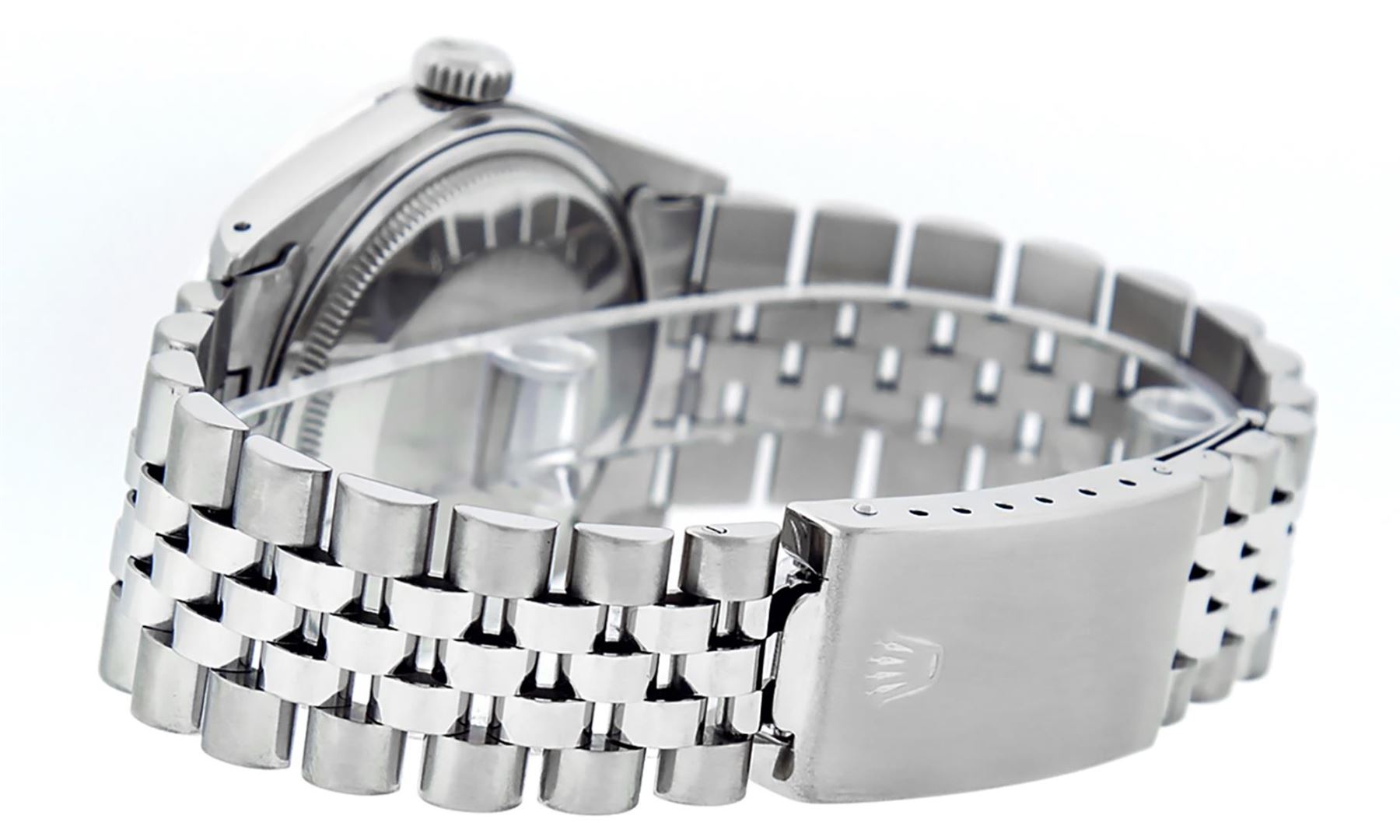 One Mens Pre Owned Rolex Stainless Steel Datejust Polished Bright with Satin Finish, This Watch Has Been Serviced & Electronically Tested, Rolex Stainless Steel Case: 36mm, Rolex Stainless Steel Crown, Custom Bezel: New Stainless Steel Beadset Diamond Bezel, Diamond Count: 54 Diamonds In Bezel. Custom Crystal: New Sapphire With Magnified Date Window. Custom Hands: New Luminescent Hands. Rolex Movement: Automatic Winding Movement 3035. Custom Dial: Custom Black With Added Diamond Hour Markers, Diamond Count: 10 Baguette Diamonds On Dial. Date Window: 3 O'Clock Position Date Display, Quickset, Model: Datejust. Condition: G-6 Extra Fine. Rolex Bracelet: Stainless Steel Jubilee Band. Bright Polish And Satin Finish. 7.0 Inch Length, Adjustable. Standard Clasp, With Rolex Logo. This Watch Has Been Serviced Time Tested And Is In Excellent Condition It Is Free Of All Scratches And Dents.