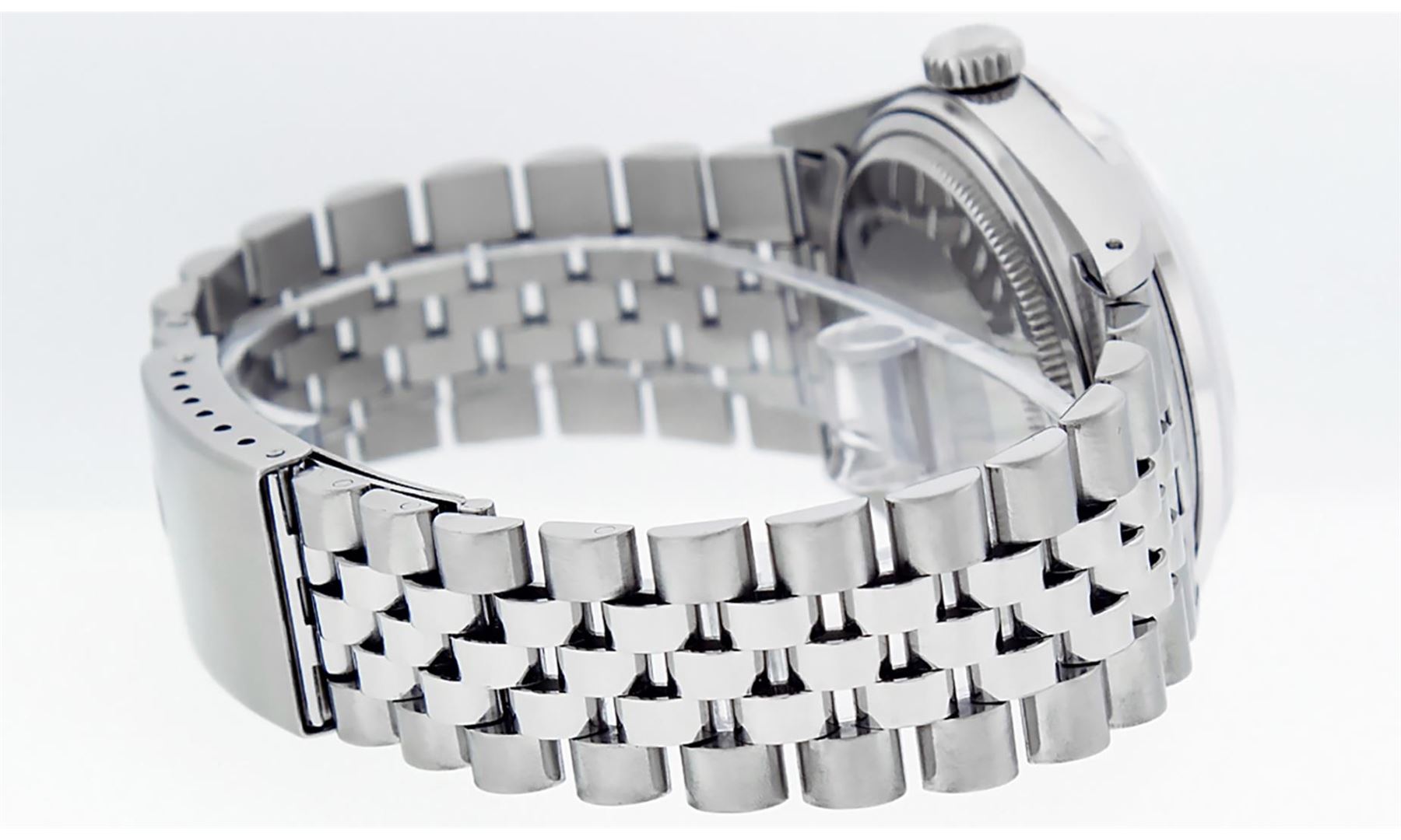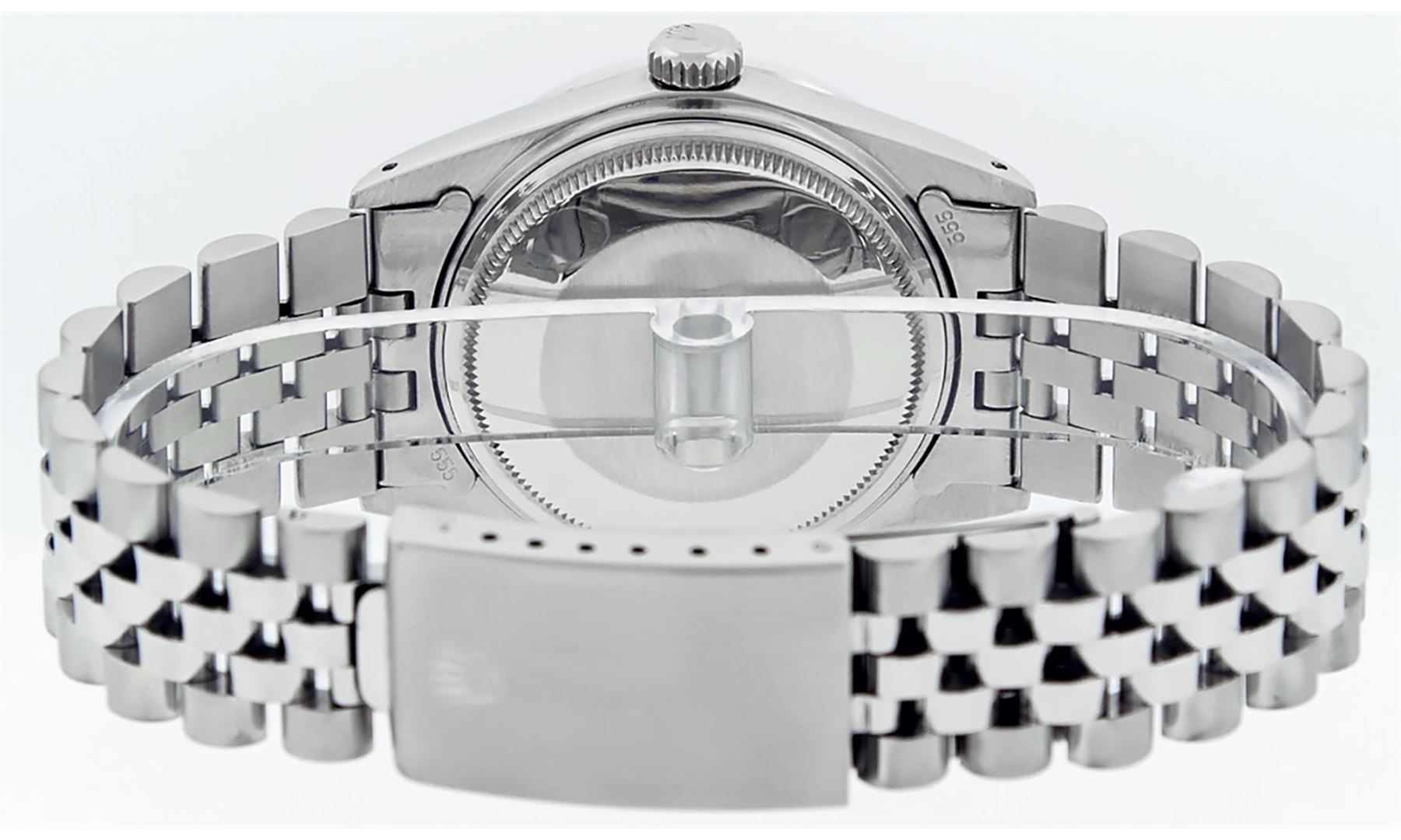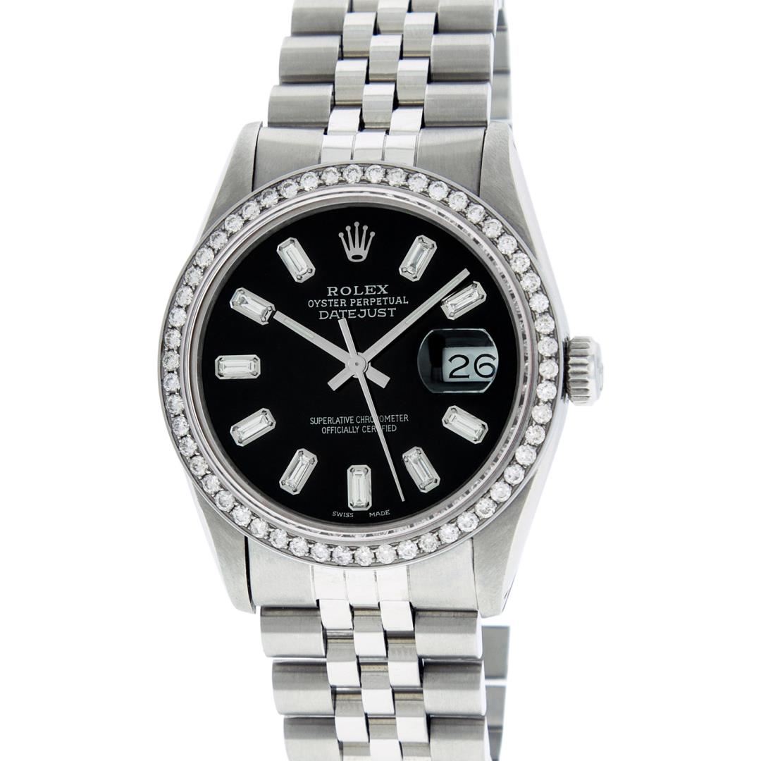 One Mens Pre Owned Rolex Stainless Steel Datejust Polished Bright with Satin Finish, This Watch Has Been Serviced & Electronically Tested, Rolex Stainless Steel Case: 36mm, Rolex Stainless Steel Crown, Custom Bezel: New Stainless Steel Beadset Diamond Bezel, Diamond Count: 54 Diamonds In Bezel. Custom Crystal: New Sapphire With Magnified Date Window. Custom Hands: New Luminescent Hands. Rolex Movement: Automatic Winding Movement 3035. Custom Dial: Custom Black With Added Diamond Hour Markers, Diamond Count: 10 Baguette Diamonds On Dial. Date Window: 3 O'Clock Position Date Display, Quickset, Model: Datejust. Condition: G-6 Extra Fine. Rolex Bracelet: Stainless Steel Jubilee Band. Bright Polish And Satin Finish. 7.0 Inch Length, Adjustable. Standard Clasp, With Rolex Logo. This Watch Has Been Serviced Time Tested And Is In Excellent Condition It Is Free Of All Scratches And Dents.