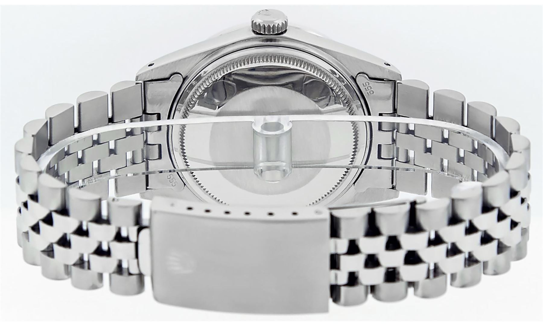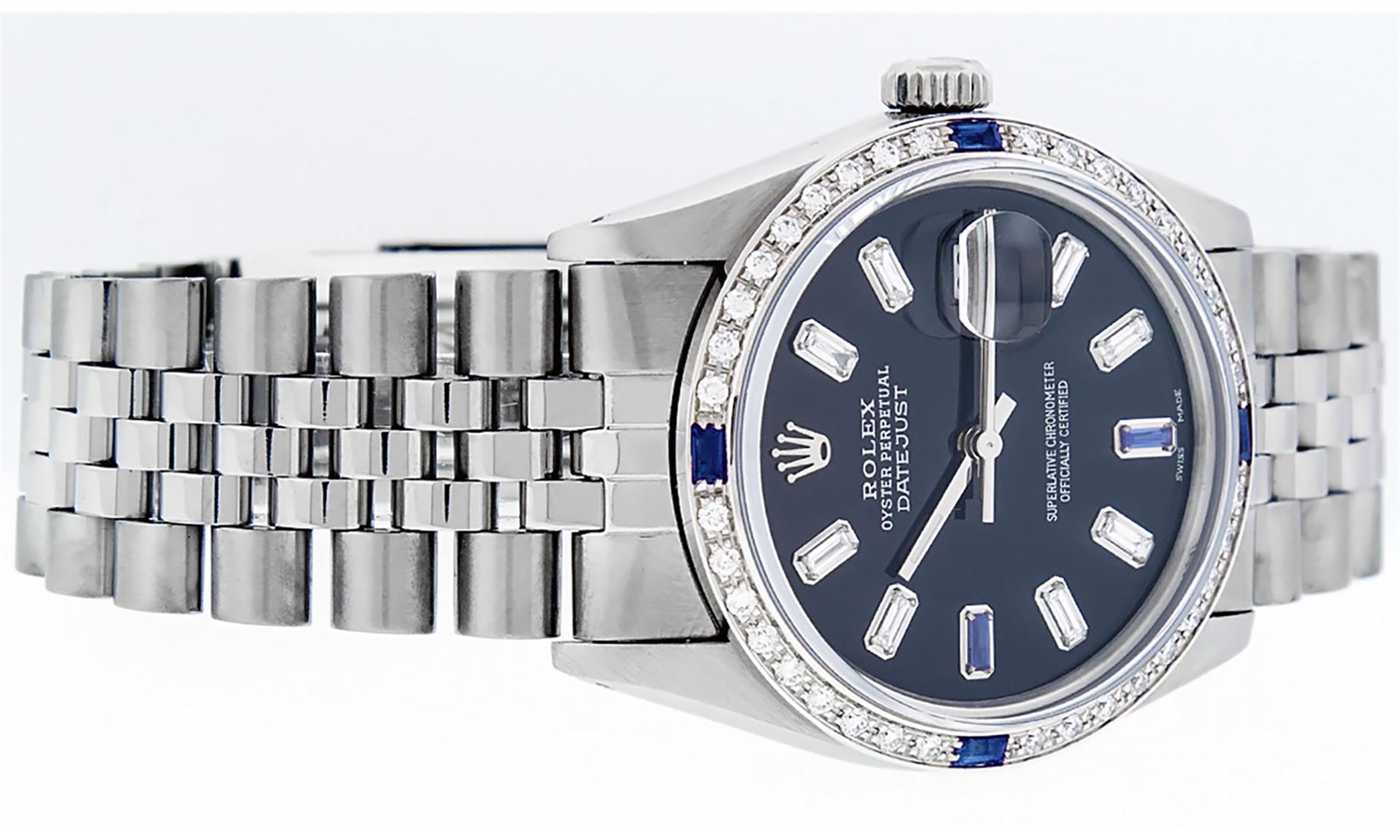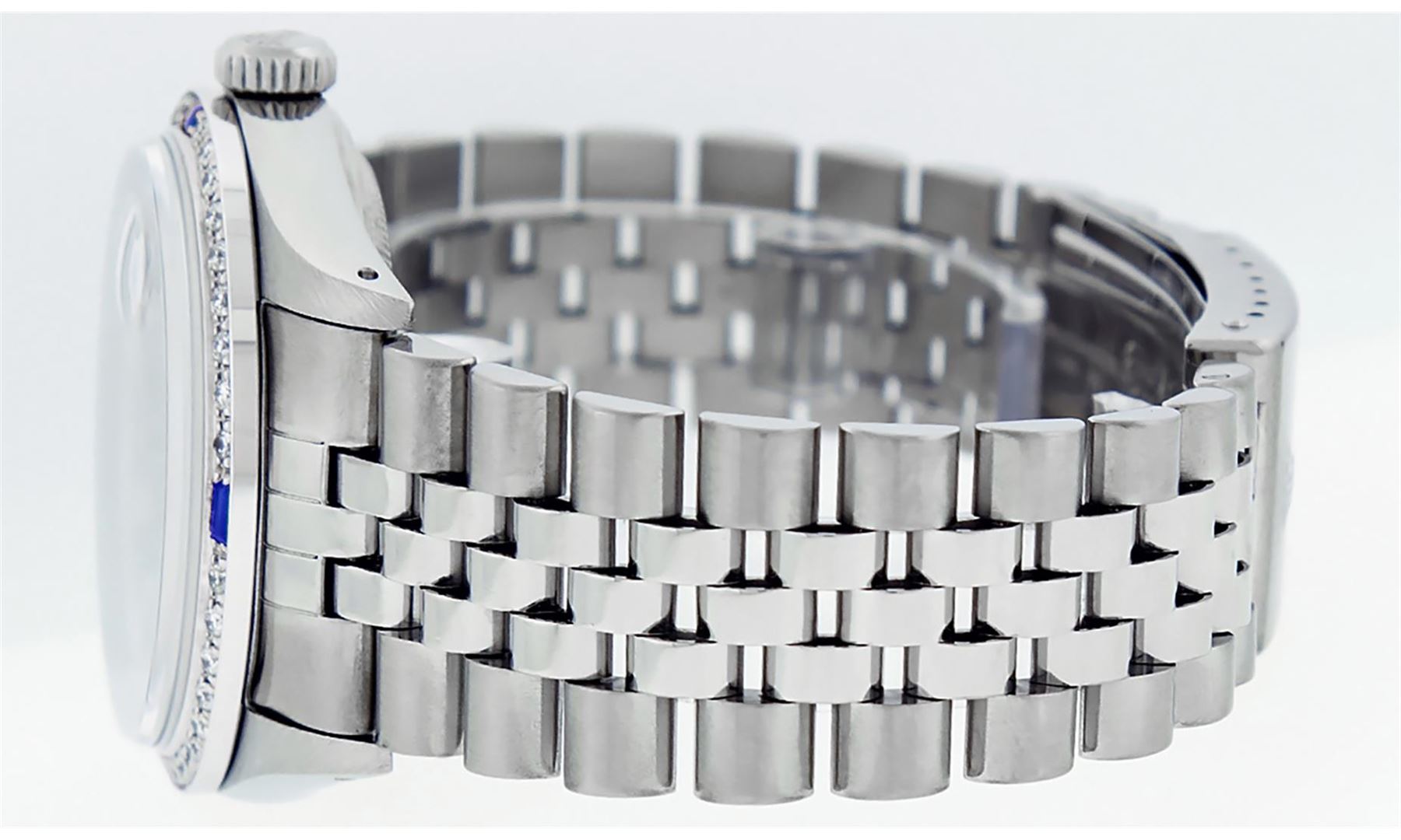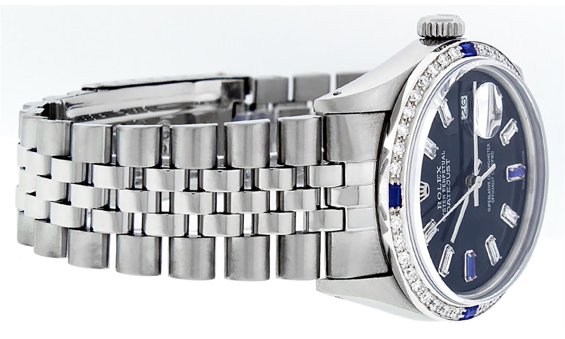 One Mens Stainless Steel Rolex Datejust Polished, Serviced & Electronically Tested, Stainless Steel Case: 36mm, Stainless Steel Crown, New Custom Bezel: 18K White Gold Sapphire Beadset Diamond Bezel, Diamond + Gem Count: 36 Diamonds + 4 Sapphires. Total Weight 1.00 Carat, Clarity: SI-VS, Color: G to H. Custom Crystal: New Synthetic Sapphire Cyclops Lens. Custom Hands: New Luminescent Hands. Movement: Automatic Winding Movement. Custom Dial: Black Baguette + 2 Synthetic Sapphire Baguette Diamond Hour Markers, Stone Count: 8 Diamonds + 2 Synthetic Sapphire Baguettes. G To H In Color, Clarity: SI-VS. Date Window: 3 O'Clock Position Date Display, Quickset, Model: Datejust. Condition: G-6 Extra Fine. Bracelet: Stainless Steel Jubilee. Bright Polish & Satin Finish. 7.0 Inch Length, Adjustable. Standard Clasp, With Rolex Logo. This Watch Has Been Serviced Time Tested And Is In Excellent Condition It Is Free Of All Scratches And Dents.