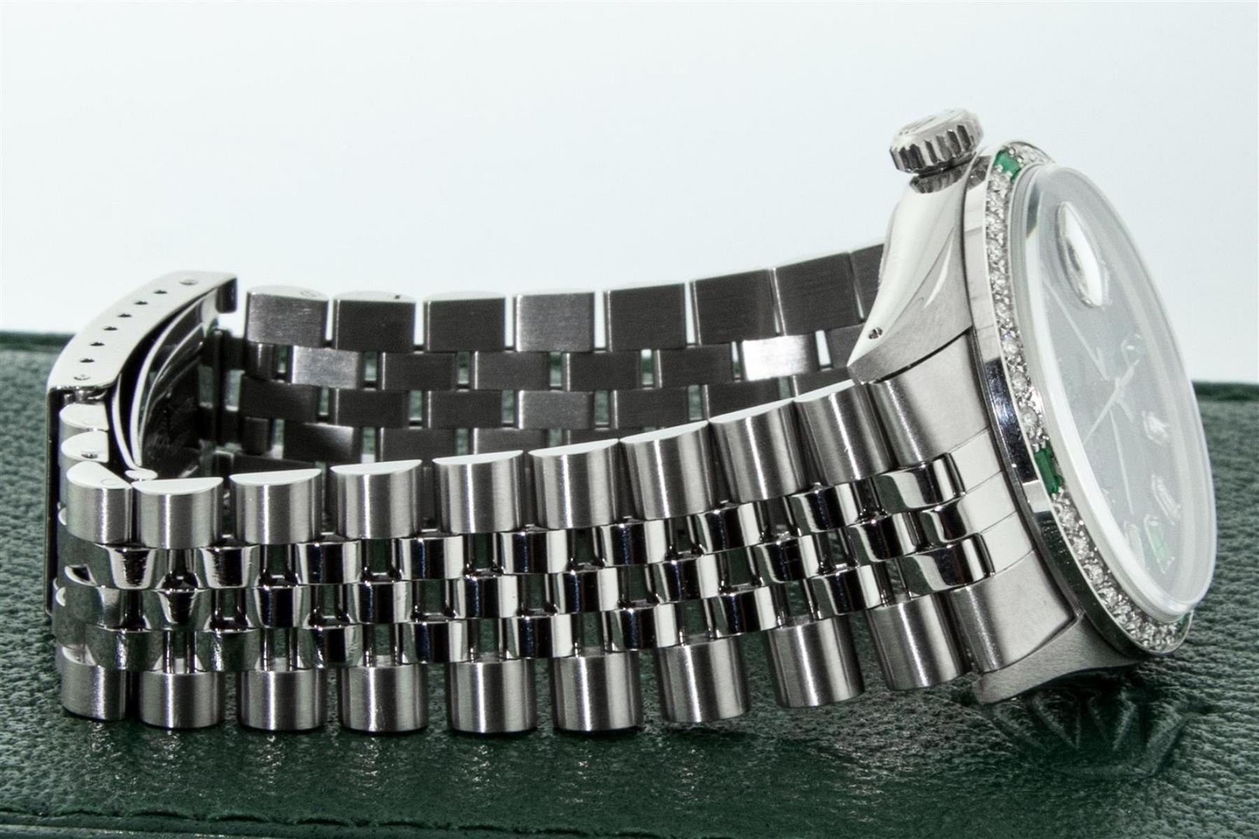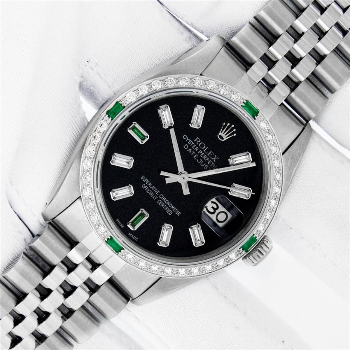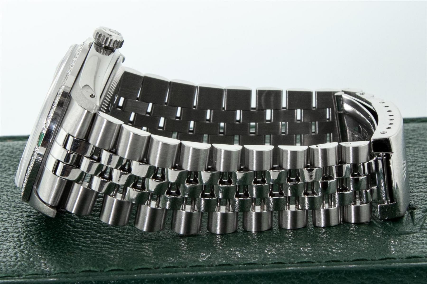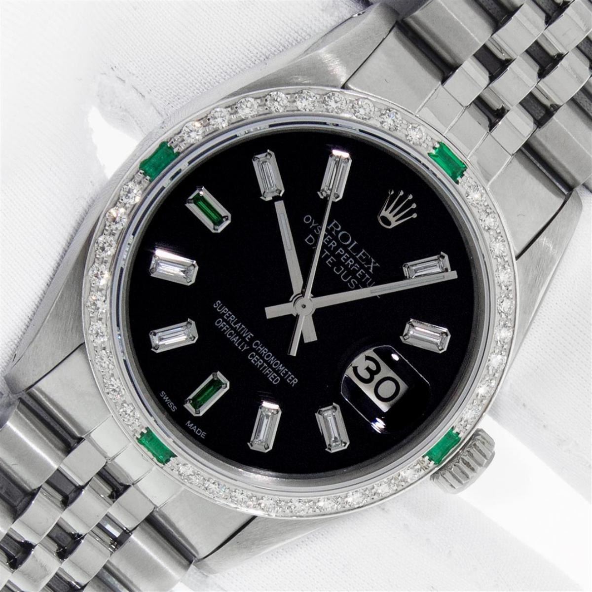 One Mens Rolex Stainless Steel Datejust Polished Bright with Satin Finish, This Watch Has Been Serviced & Electronically Tested, Stainless Steel Case: 36mm, Stainless Steel Crown, Custom Bezel: New 18K White Gold Emerald Beadset Diamond Bezel, Stone Count