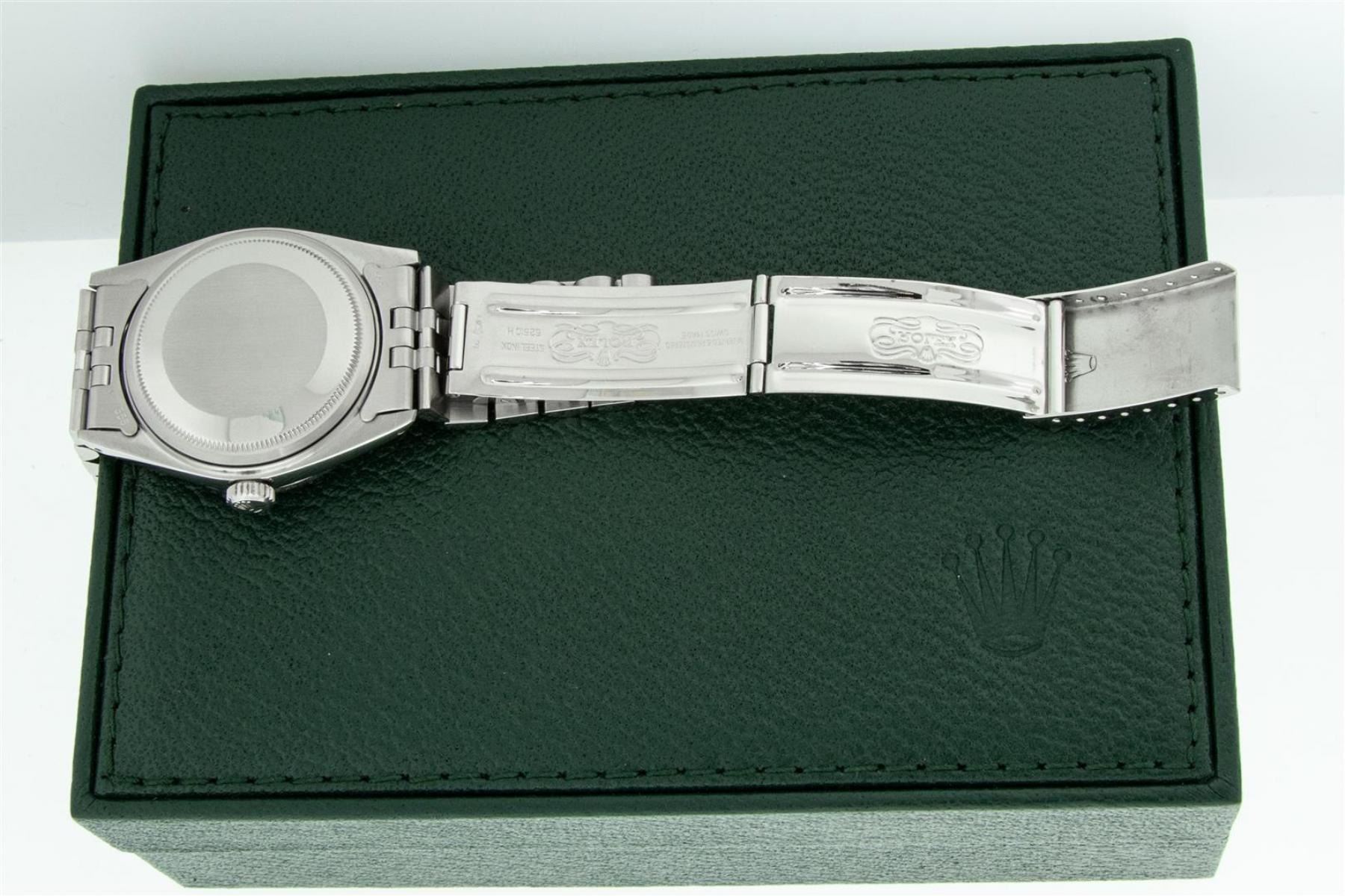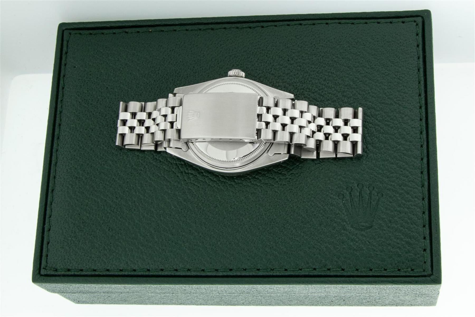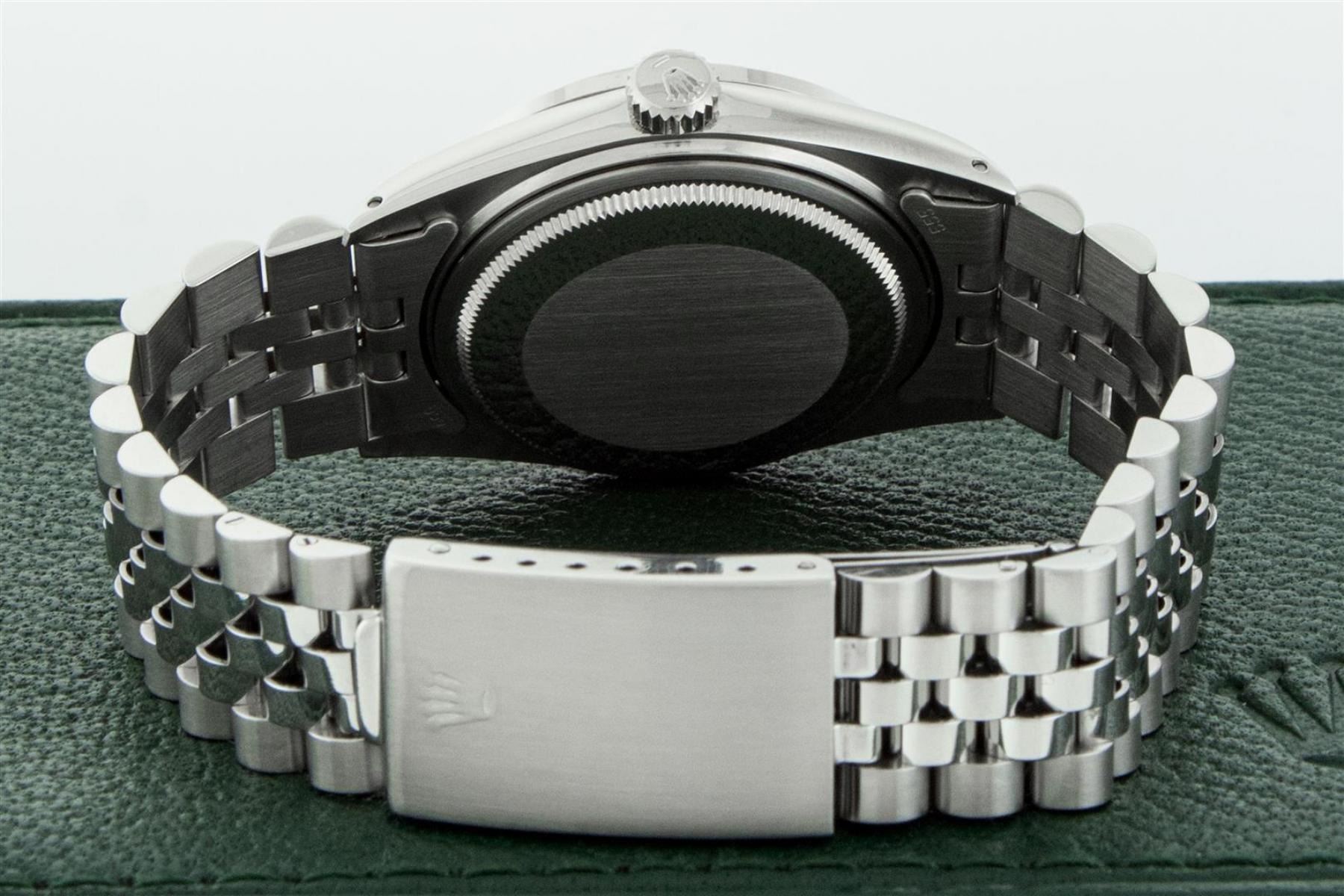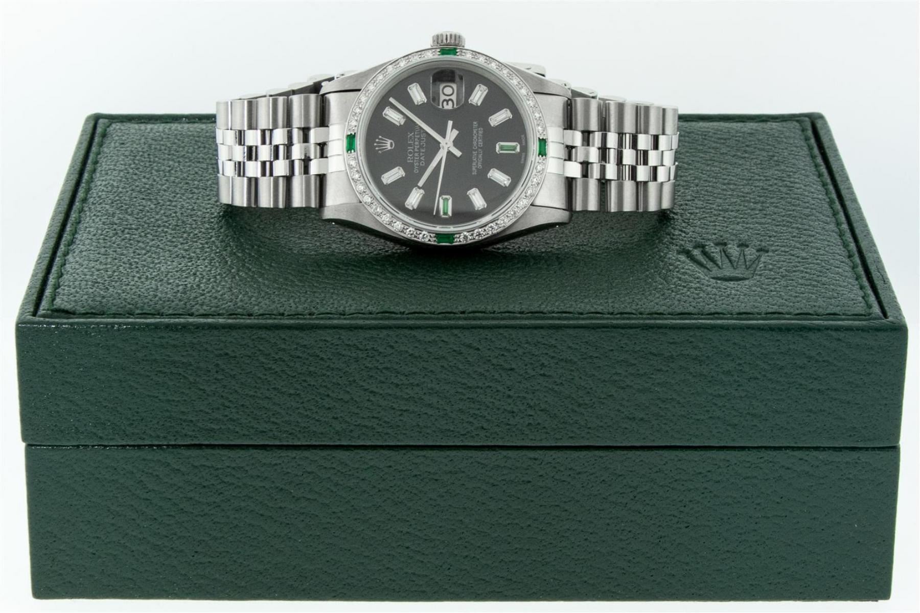 One Mens Rolex Stainless Steel Datejust Polished Bright with Satin Finish, This Watch Has Been Serviced & Electronically Tested, Stainless Steel Case: 36mm, Stainless Steel Crown, Custom Bezel: New 18K White Gold Emerald Beadset Diamond Bezel, Stone Count