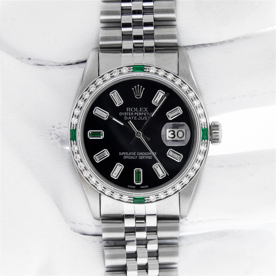 One Mens Rolex Stainless Steel Datejust Polished Bright with Satin Finish, This Watch Has Been Serviced & Electronically Tested, Stainless Steel Case: 36mm, Stainless Steel Crown, Custom Bezel: New 18K White Gold Emerald Beadset Diamond Bezel, Stone Count: 36 Diamonds + 4 Emeralds In Bezel, Total Weight 1.00 Carat, Clarity: SI-VS, Color: G to H. Custom Crystal: New Scratch Resistant Synthetic Sapphire Cyclops Lens. Custom Hands: New Luminescent Hands. Movement: Automatic Winding Movement. Custom Dial: Black Baguette Diamond + Synthetic Dial, Stone Count: 8 Baguette Diamonds + 2 Synthetic Emeralds On Dial, Color: G to H, Clarity: VS2-SI1. Date Window: 3 O'Clock Position Date Display, Quickset, Model: Datejust. Condition: G-6 Extra Fine. Bracelet: Stainless Steel Jubilee Band. Bright Polish & Satin Finish. 7.0 Inch Length, Adjustable. Standard Clasp, With Rolex Logo. This Watch Has Been Serviced Time Tested And Is In Excellent Condition It Is Free Of All Scratches And Dents.