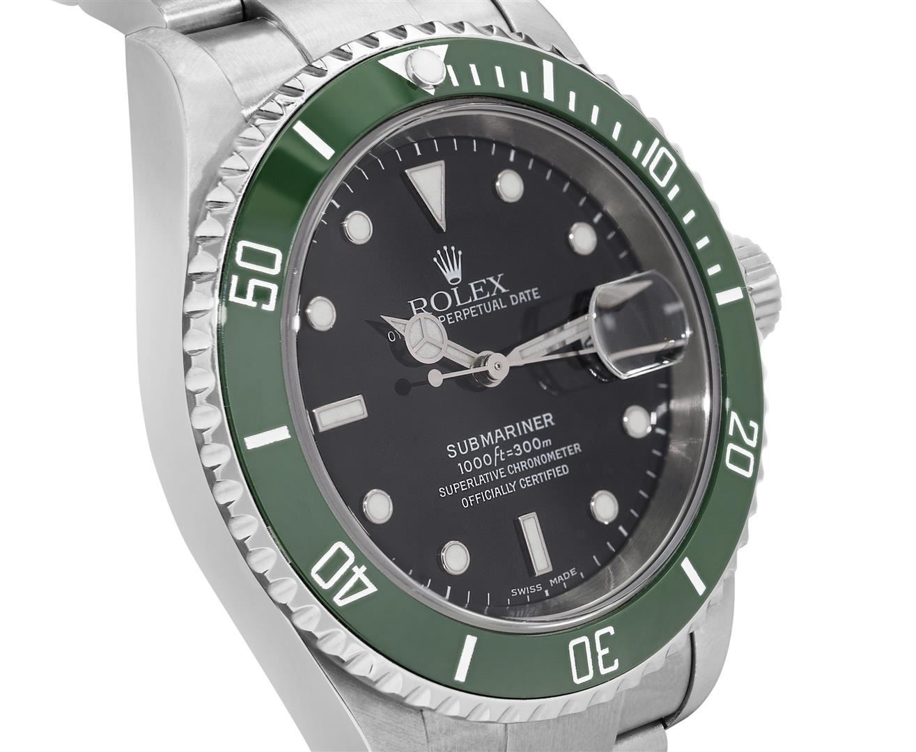 One Mens Pre Owned Rolex Stainless Steel Submariner With Date Polished, Serviced & Electronically Tested, Rolex Stainless Steel Case: 40mm, Rolex Stainless Steel Crown, Rolex Bezel: Stainless Steel Rotatable Bezel. Custom Bezel Insert: New Custom Green Ceramic Insert. Crystal: Sapphire With Magnified Date Window. Rolex Movement: Automatic Winding Movement Caliber 3135. Rolex Dial: Black Submariner Dial with Luminous Index Hour Markers And Dash Track. Date Window: 3 O'Clock Position Date Display, Model: Date No Holes Submariner, Quickset, Condition: G-6 Extra Fine. Rolex Bracelet: Stainless Steel Oyster Band. Bright Polish & Satin Finish. 7.0 Inch Length, Adjustable. Fold Clasp, With Rolex Logo. This Watch Comes With A Rolex Box.