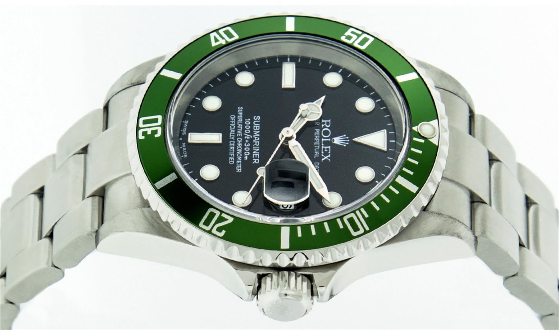 One Mens Pre Owned Rolex Anniversary Edition Stainless Steel Submariner "Kermit" With Date Polished, Serviced & Electronically Tested, Rolex Stainless Steel Case: 40mm, Rolex Stainless Steel Crown, Rolex Bezel: Stainless Steel Rotatable Bezel With Green I