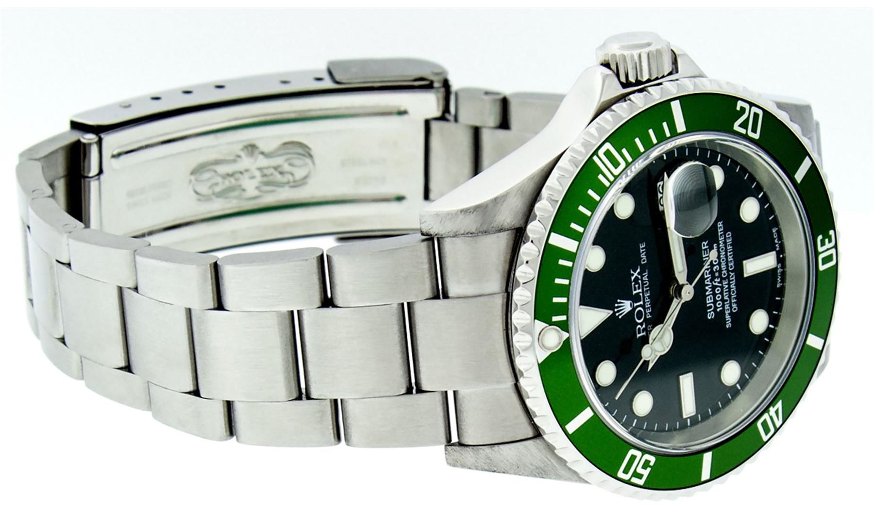 One Mens Pre Owned Rolex Anniversary Edition Stainless Steel Submariner "Kermit" With Date Polished, Serviced & Electronically Tested, Rolex Stainless Steel Case: 40mm, Rolex Stainless Steel Crown, Rolex Bezel: Stainless Steel Rotatable Bezel With Green Insert. Crystal: Sapphire With Magnified Date Window. Rolex Movement: Automatic Winding Movement Caliber 3135. Rolex Dial: Black Submariner Dial, Hands: Submariner Hands. Date Window: 3 O'Clock Position Date Display, Model: Submariner, Quickset, Condition: G-6 Extra Fine. Rolex Bracelet: Stainless Steel Oyster Band. Bright Polish & Satin Finish. 7.0 Inch Length, Adjustable. Standard Clasp, With Rolex Logo.