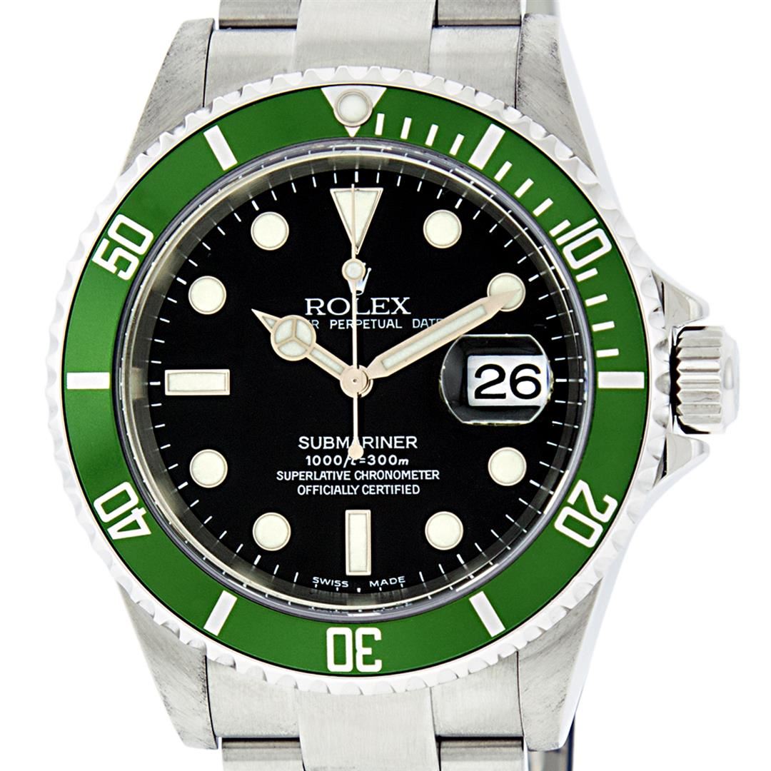 One Mens Pre Owned Rolex Anniversary Edition Stainless Steel Submariner "Kermit" With Date Polished, Serviced & Electronically Tested, Rolex Stainless Steel Case: 40mm, Rolex Stainless Steel Crown, Rolex Bezel: Stainless Steel Rotatable Bezel With Green Insert. Crystal: Sapphire With Magnified Date Window. Rolex Movement: Automatic Winding Movement Caliber 3135. Rolex Dial: Black Submariner Dial, Hands: Submariner Hands. Date Window: 3 O'Clock Position Date Display, Model: Submariner, Quickset, Condition: G-6 Extra Fine. Rolex Bracelet: Stainless Steel Oyster Band. Bright Polish & Satin Finish. 7.0 Inch Length, Adjustable. Standard Clasp, With Rolex Logo.