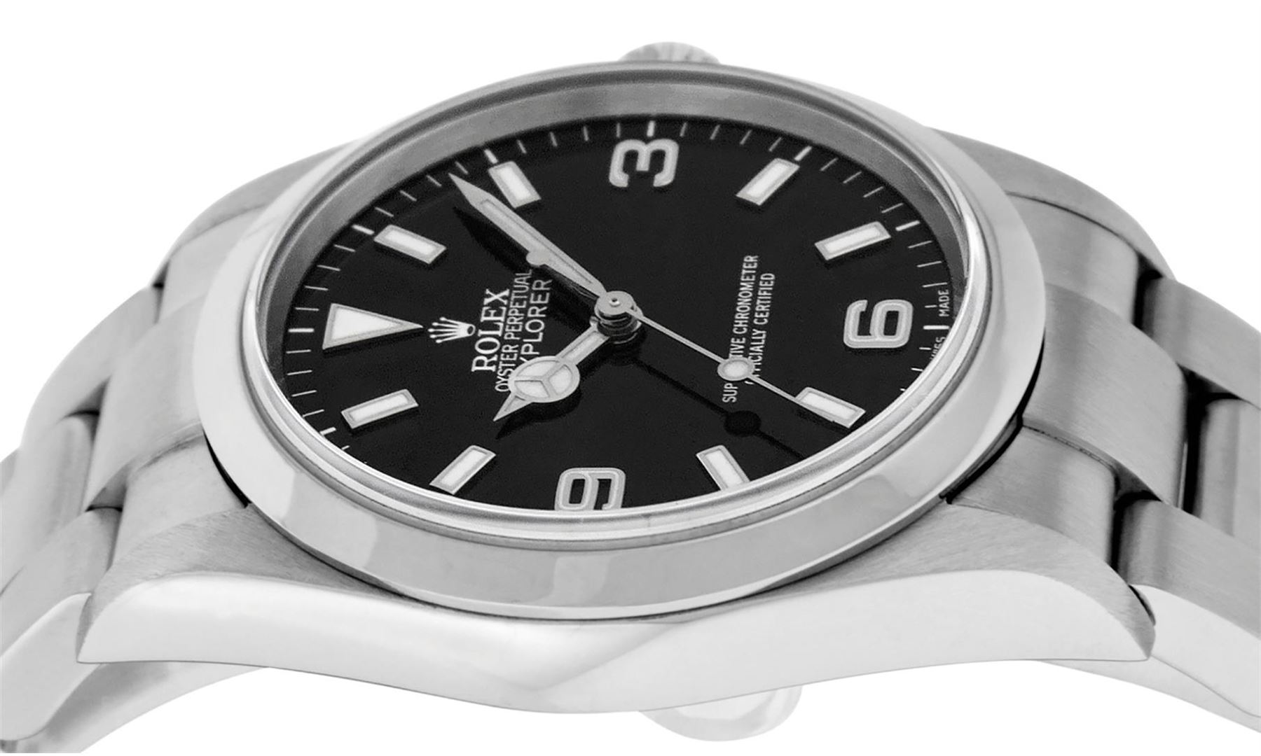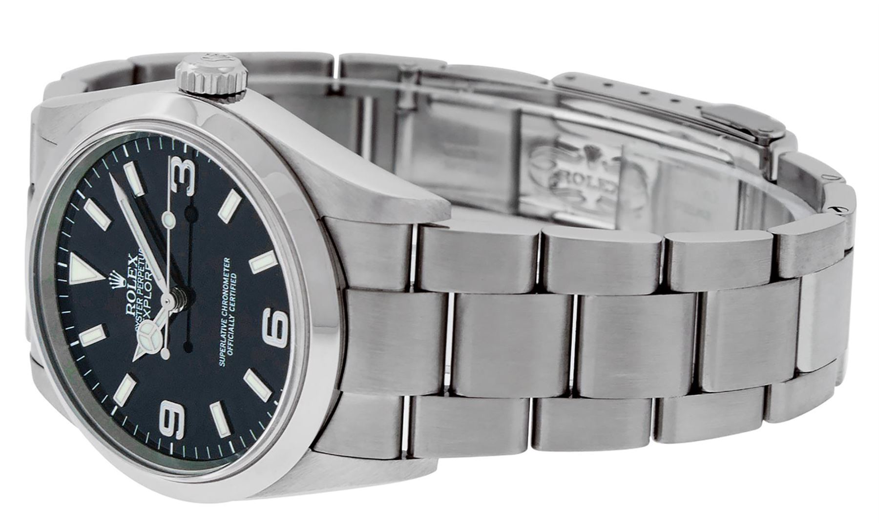 One Mens Pre Owned Rolex Stainless Steel Explorer Polished, Serviced & Electronically Tested, Rolex Stainless Steel Case: 36mm, Rolex Stainless Steel Crown, Rolex Bezel: Rolex Stainless Steel Smooth Domed Bezel. Rolex Crystal: Sapphire With Magnified Date Window. Rolex Movement: Automatic Winding Movement Caliber 3130. Rolex Dial: Rolex Black Dial With Raised Arabic Numerals. Date Window: 3 O'Clock Position Date Display, Model: Explorer, Condition: G-6 Extra Fine. Rolex Bracelet: Rolex Stainless Steel Oyster Bracelet, Bright Polish & Satin Finish. 7 Inch Length, Adjustable. Flip Lock Clasp with Rolex Logo. This Watch Has Been Serviced Time Tested And Is In Excellent Condition It Is Free Of All Scratches And Dents.