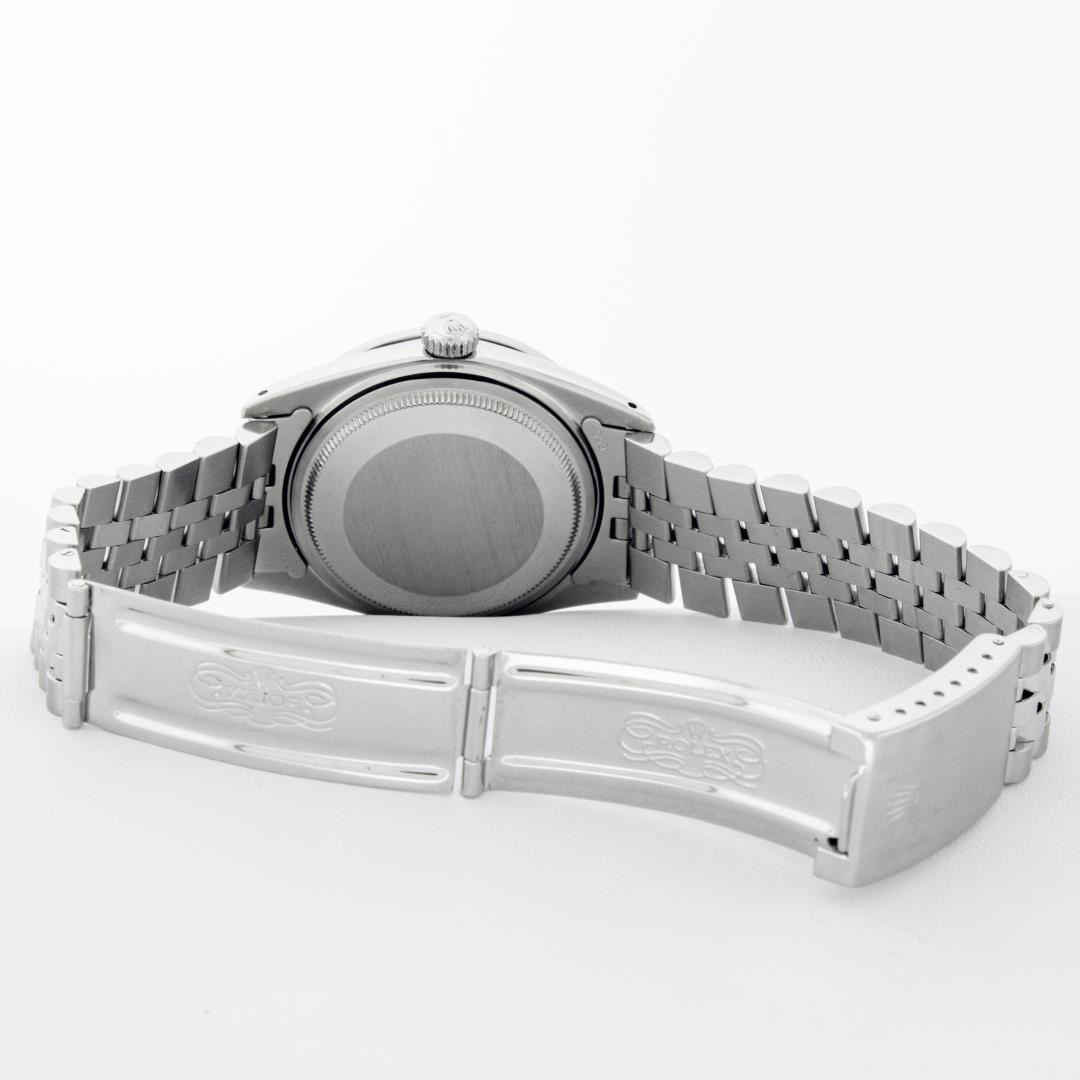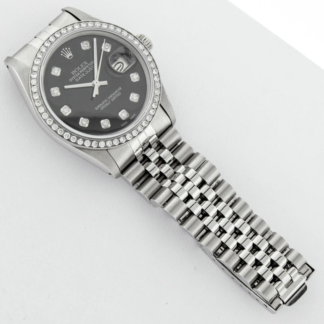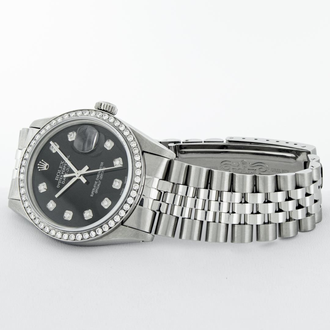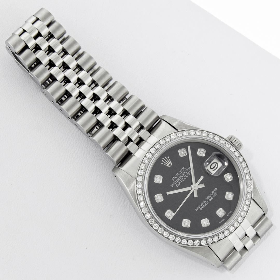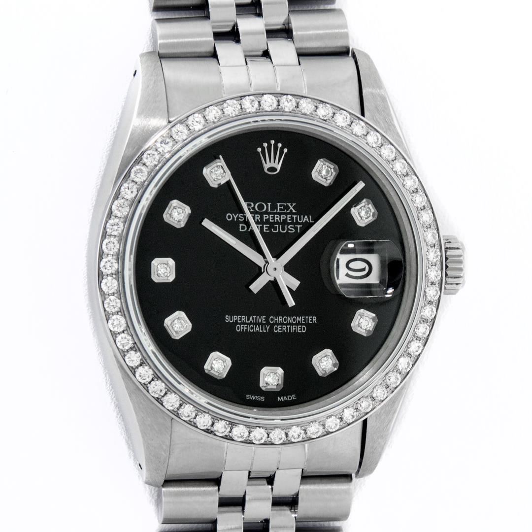 One 36MM Pre Owned Rolex Stainless Steel Datejust Polished Bright with Satin Finish, This Watch Has Been Serviced & Electronically Tested, Rolex Stainless Steel Case: 36mm, Rolex Stainless Steel Crown, Custom Bezel: New Stainless Steel Beadset Diamond Bezel, Diamond Count: 54 Diamonds On Bezel. Custom Crystal: New Sapphire With Date Window. Custom Hands: New Luminescent Hands. Rolex Movement: Automatic Winding Movement 3035. Custom Dial: Custom Black Dial With Added Diamonds, Diamond Count: 10 Diamonds On Dial. Date Window: 3 O'Clock Position Date Display, Quickset, Model: Datejust. Condition: G-6 Extra Fine. Rolex Bracelet: Stainless Steel Jubilee Band. Bright Polish & Satin Finish. 7.0 Inch Length, Adjustable. Fold Clasp, With Rolex Logo. This Watch Has Been Serviced Time Tested And Is In Excellent Condition It Is Free Of All Scratches And Dents.