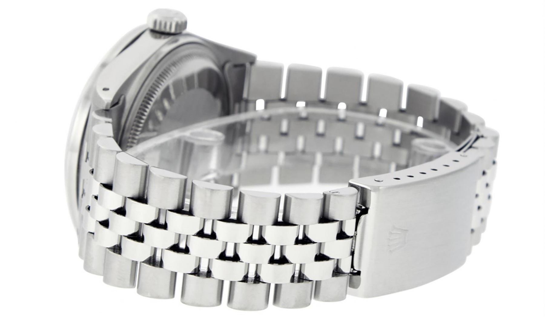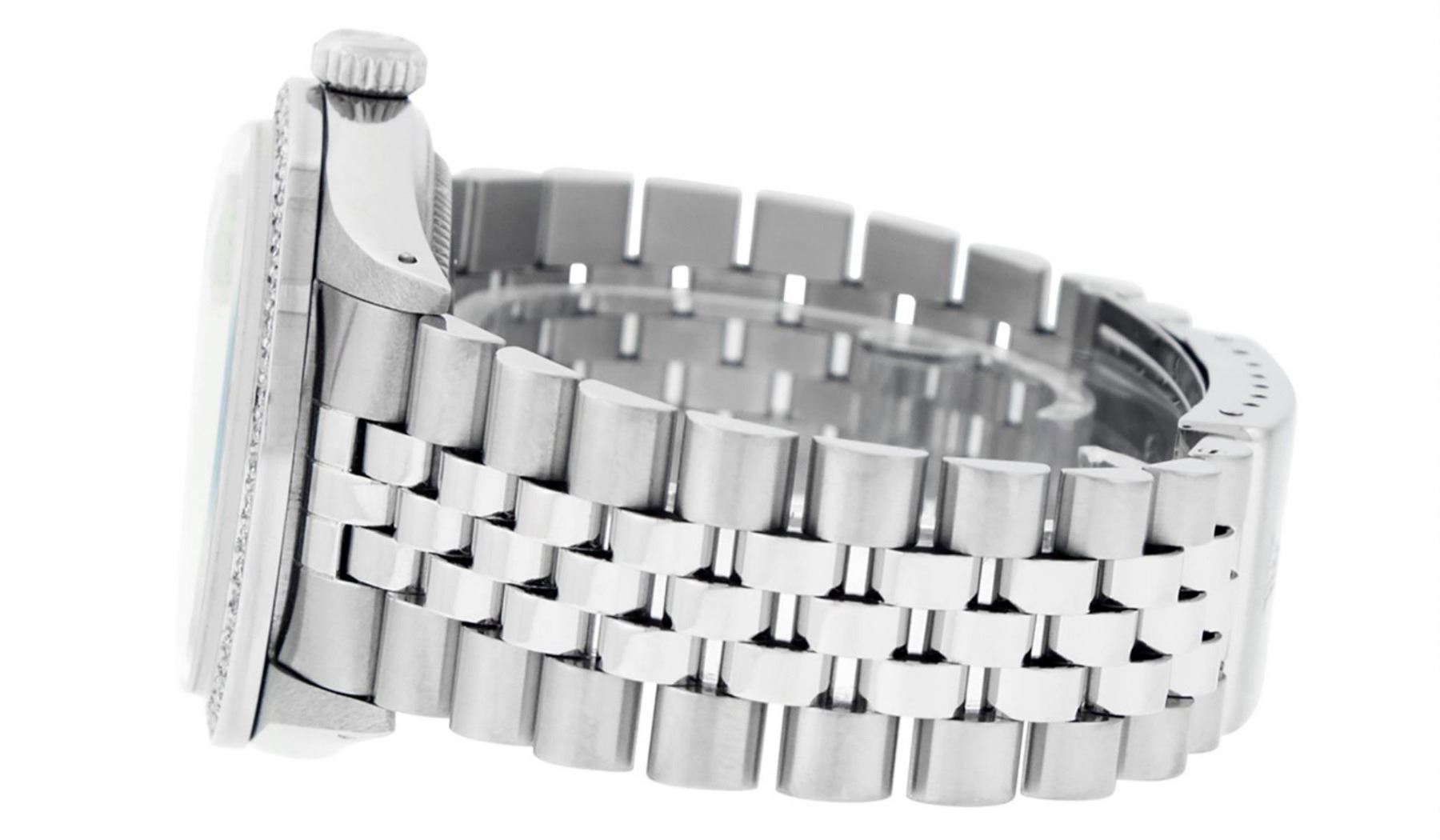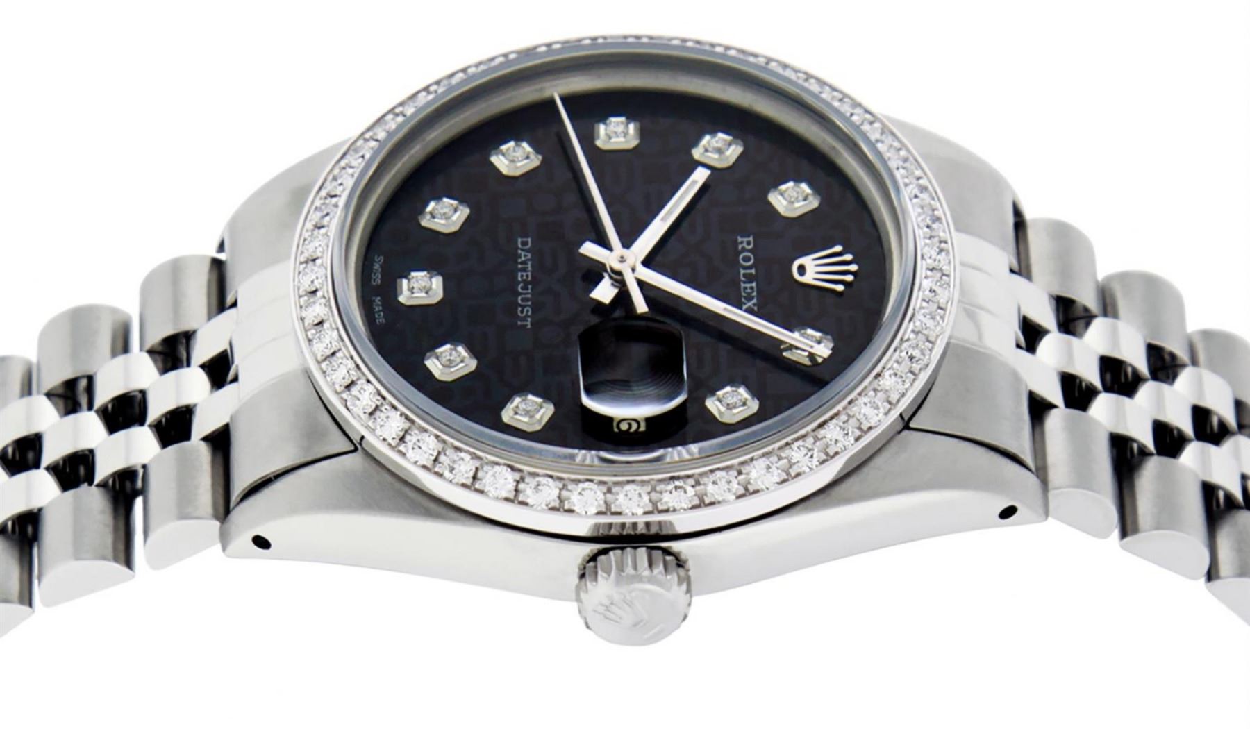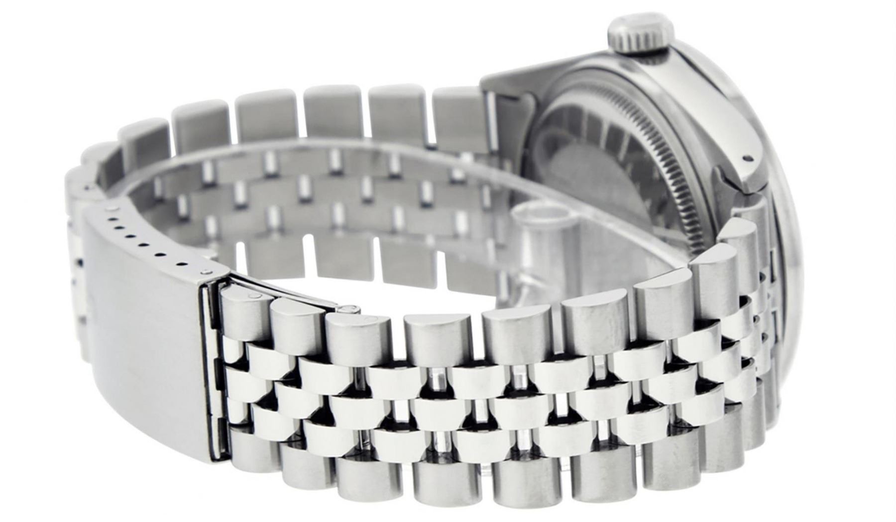 One Mens Stainless Steel Rolex Datejust Polished, Serviced & Electronically Tested, Stainless Steel Case: 36mm, Stainless Steel Crown, New Custom Bezel: 18K White Gold Beadset Diamond Bezel, Diamond Count: 44 Diamonds. Total Bezel Weight 1.00 Carat, Clarity: SI-VS, Color: G to H. Custom Crystal: New Scratch Resistant Synthetic Sapphire Cyclops Lens. Custom Hands: New Luminescent Hands. Movement: Automatic Winding Movement. Custom Refinished Dial: Black Jubilee With Diamond Hour Markers, Stone Count: 10 Diamond In Dial. G To H In Color, Clarity: SI-VS. Date Window: 3 O'Clock Position Date Display, Quickset, Model: Datejust. Condition: G-6 Extra Fine. Bracelet: Stainless Steel Jubilee. Bright Polish & Satin Finish. 7.0 Inch Length, Adjustable. Standard Clasp, With Rolex Logo. This Watch Has Been Serviced Time Tested And Is In Excellent Condition It Is Free Of All Scratches And Dents.