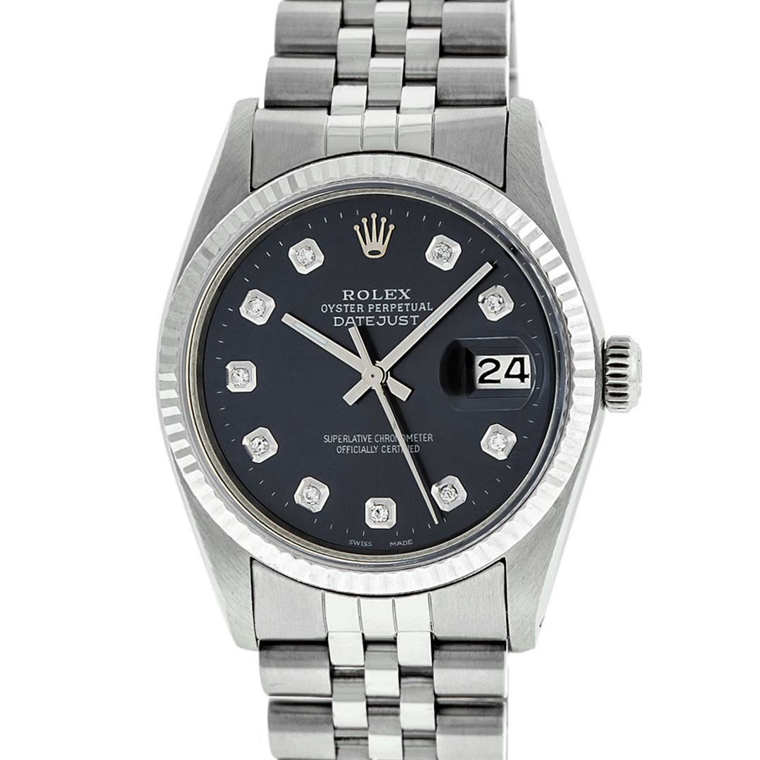 One Mens Stainless Steel Rolex Datejust Polished Bright with Satin Finish, This Watch Has Been Serviced & Electronically Tested, Stainless Steel Case: 36mm, Stainless Steel Crown, Bezel: 14K White Gold Fluted Bezel. Custom Crystal: New Acrylic Cyclops Lens. Custom Hands: New Luminescent Hands. Movement: Automatic Winding Movement. Custom Dial: Black Diamond Dial With Diamond Hour Markers, Diamond Count: 10 Diamonds in Dial G To H In Color, SI-VS Clarity. Date Window: 3 O'Clock Position Date Display, Quickset, Model: Datejust, Condition: G-6 Extra Fine. Bracelet: Stainless Steel Jubilee. Bright Polish & Satin Finish. 7.0 Inch Length, Adjustable. Standard Clasp, With Rolex Logo. This Watch Has Been Serviced Time Tested And Is In Excellent Condition It Is Free Of All Scratches And Dents.
