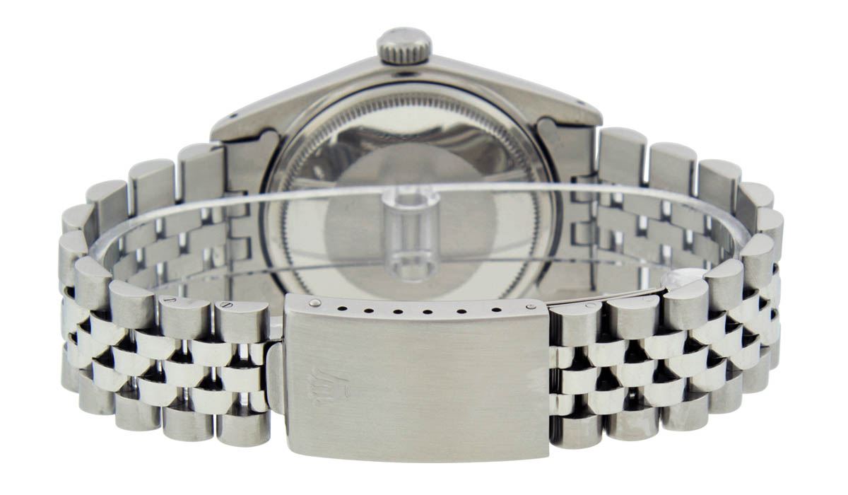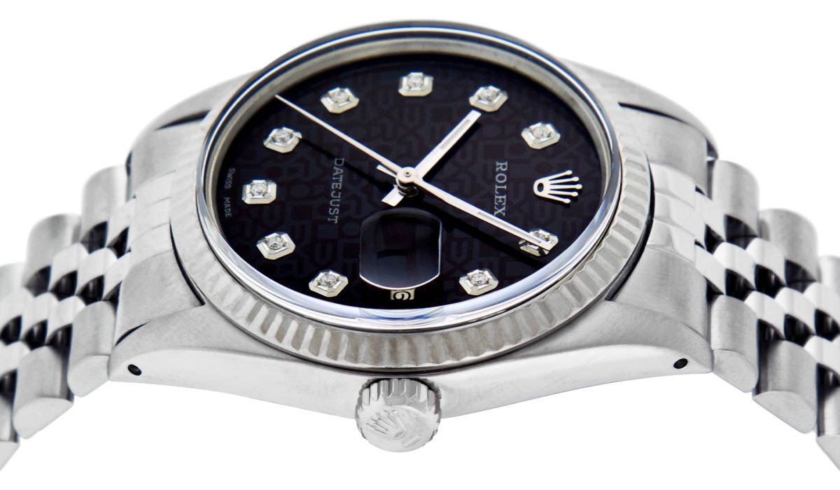 One Mens Rolex Datejust Polished Bright with Satin Finish, Serviced & Electronically Tested, Stainless Steel Case:36mm, Stainless Steel Crown, Bezel: 14K White Gold Fluted Bezel. Custom Crystal: Acrylic Cyclops Lens. Movement: Automatic Winding Movement Caliber 3035. Custom Dial: Black Diamond Dial, Diamond Count: 10 Diamonds In Dial, Diamond Color: G To H In Color, Clarity: SI-VS. Date Window: 3 O'Clock Position Date Display, Quickset, Model: Datejust Condition: G-6 Extra Fine. Bracelet: Stainless Steel Jubilee Band. Bright Polish & Satin Finish. 7.0 Inch Length, Adjustable. Standard Clasp, With Rolex Logo. This Watch Has Been Serviced and Polished And It Is Free Of All Dents And Scratches And Has Been Time Tested.