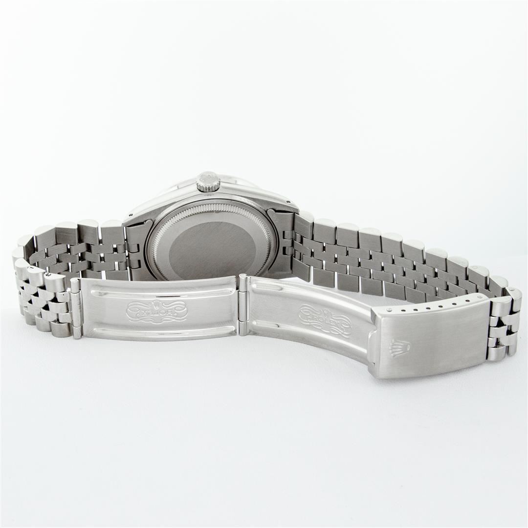 One Mens Stainless Steel Rolex Datejust Polished Bright with Satin Finish, Serviced & Electronically Tested, Stainless Steel Case: 36mm, Custom Diamonds On Lugs: 28 Diamonds On Lugs, Color: G to H, Clarity: SI-VS. Stainless Steel Crown, New Custom Bezel: 18K White Gold Pyramid Diamond Bezel, Diamond Count: 24 Diamonds On Bezel, Total Weight .75 Carat, Clarity: SI-VS, Color: G to H. Custom Crystal: New Scratch Resistant Synthetic Sapphire Cyclops Lens. Custom Hands: New Luminecent Hands. Movement: Automatic Winding Movement. Custom Dial: Black String Single Cut Diamond Dial, Diamond Count: 58 Diamonds In Dial, Diamond Color: G To H In Color, Clarity: VS. Date Window: 3 O'Clock Position Date Display, Quickset, Model: Datejust Condition: G-6 Extra Fine. Bracelet: Stainless Steel Jubilee Band. Bright Polish & Satin Finish. 7.0 Inch Length, Adjustable. Standard Clasp, With Rolex Logo. This Watch Has Been Serviced And Polished And Its Free Of All Dents And Scratches.