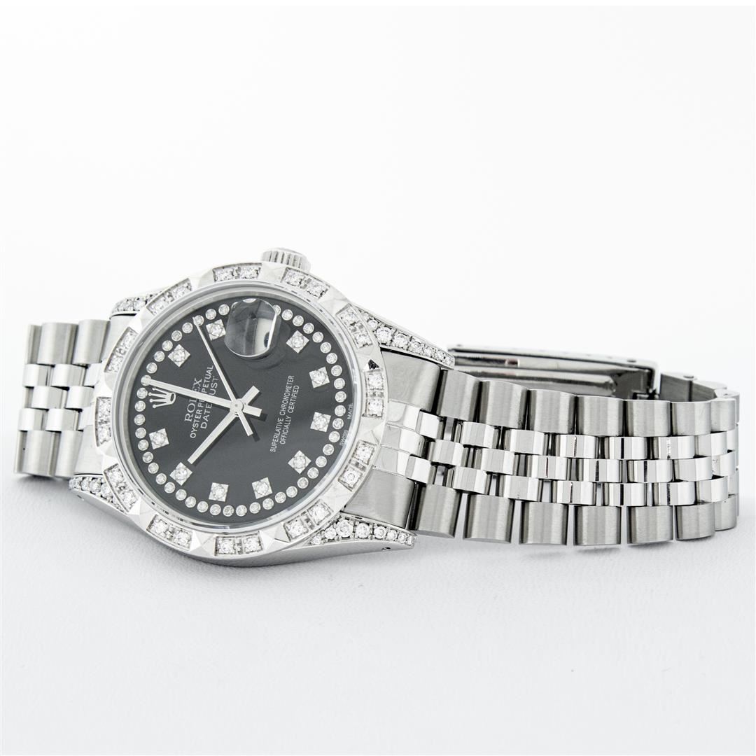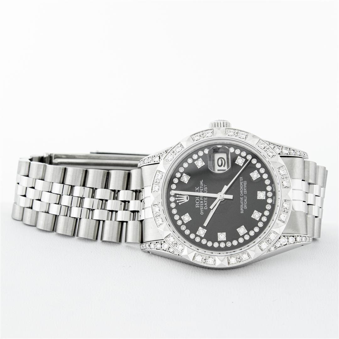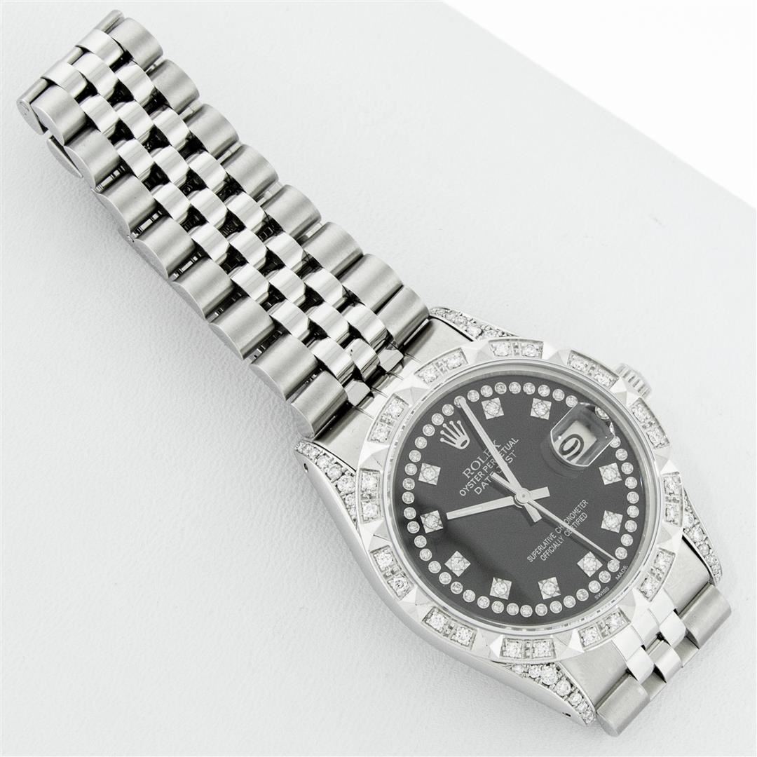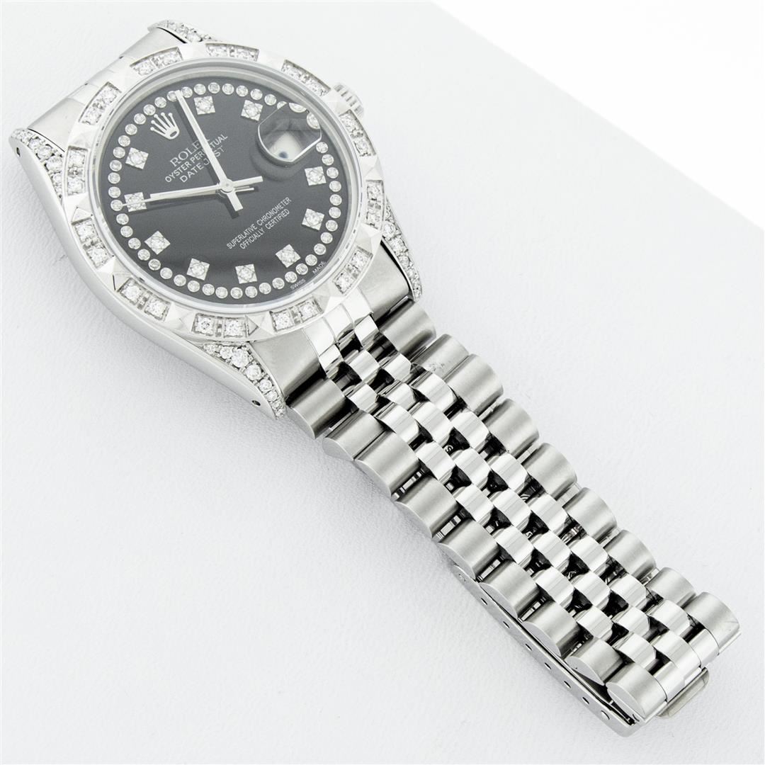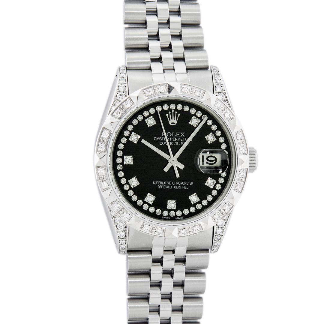 One Mens Stainless Steel Rolex Datejust Polished Bright with Satin Finish, Serviced & Electronically Tested, Stainless Steel Case: 36mm, Custom Diamonds On Lugs: 28 Diamonds On Lugs, Color: G to H, Clarity: SI-VS. Stainless Steel Crown, New Custom Bezel: 18K White Gold Pyramid Diamond Bezel, Diamond Count: 24 Diamonds On Bezel, Total Weight .75 Carat, Clarity: SI-VS, Color: G to H. Custom Crystal: New Scratch Resistant Synthetic Sapphire Cyclops Lens. Custom Hands: New Luminecent Hands. Movement: Automatic Winding Movement. Custom Dial: Black String Single Cut Diamond Dial, Diamond Count: 58 Diamonds In Dial, Diamond Color: G To H In Color, Clarity: VS. Date Window: 3 O'Clock Position Date Display, Quickset, Model: Datejust Condition: G-6 Extra Fine. Bracelet: Stainless Steel Jubilee Band. Bright Polish & Satin Finish. 7.0 Inch Length, Adjustable. Standard Clasp, With Rolex Logo. This Watch Has Been Serviced And Polished And Its Free Of All Dents And Scratches.