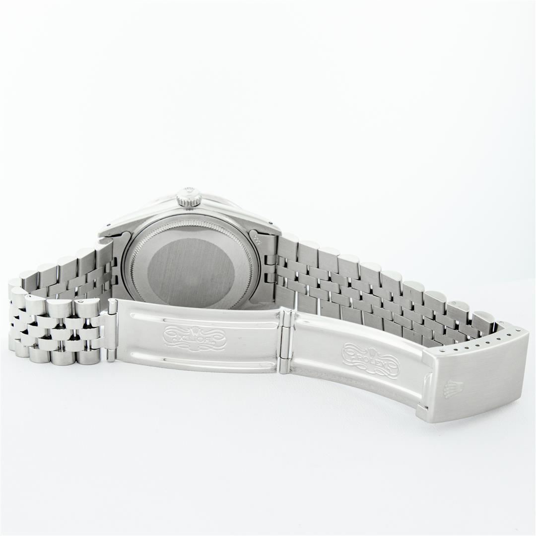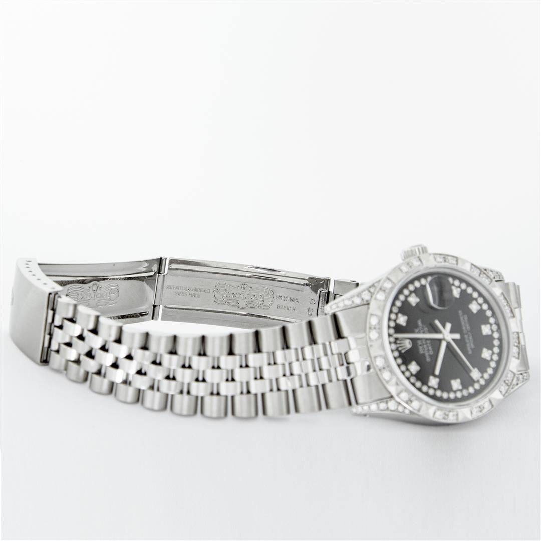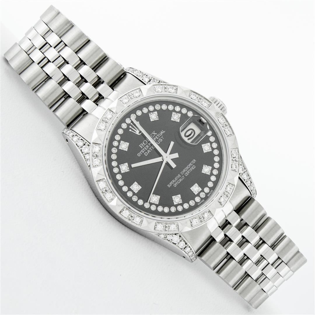 One Mens Stainless Steel Rolex Datejust Polished Bright with Satin Finish, Serviced & Electronically Tested, Stainless Steel Case: 36mm, Custom Diamonds On Lugs: 28 Diamonds On Lugs, Color: G to H, Clarity: SI-VS. Stainless Steel Crown, New Custom Bezel: 18K White Gold Pyramid Diamond Bezel, Diamond Count: 24 Diamonds On Bezel, Total Weight .75 Carat, Clarity: SI-VS, Color: G to H. Custom Crystal: New Scratch Resistant Synthetic Sapphire Cyclops Lens. Custom Hands: New Luminecent Hands. Movement: Automatic Winding Movement. Custom Dial: Black String Single Cut Diamond Dial, Diamond Count: 58 Diamonds In Dial, Diamond Color: G To H In Color, Clarity: VS. Date Window: 3 O'Clock Position Date Display, Quickset, Model: Datejust Condition: G-6 Extra Fine. Bracelet: Stainless Steel Jubilee Band. Bright Polish & Satin Finish. 7.0 Inch Length, Adjustable. Standard Clasp, With Rolex Logo. This Watch Has Been Serviced And Polished And Its Free Of All Dents And Scratches.