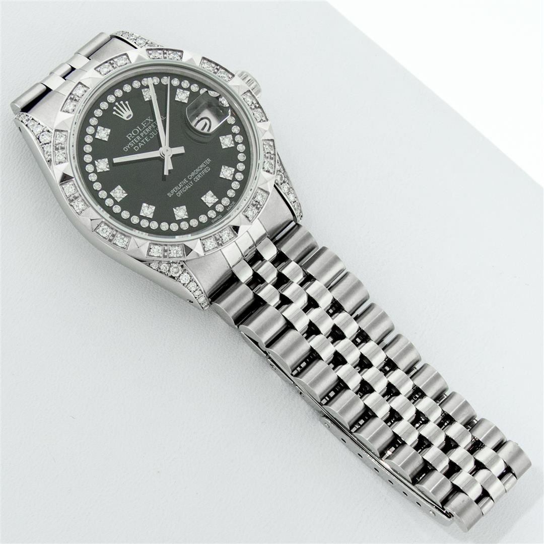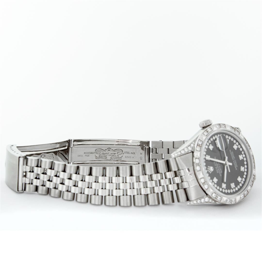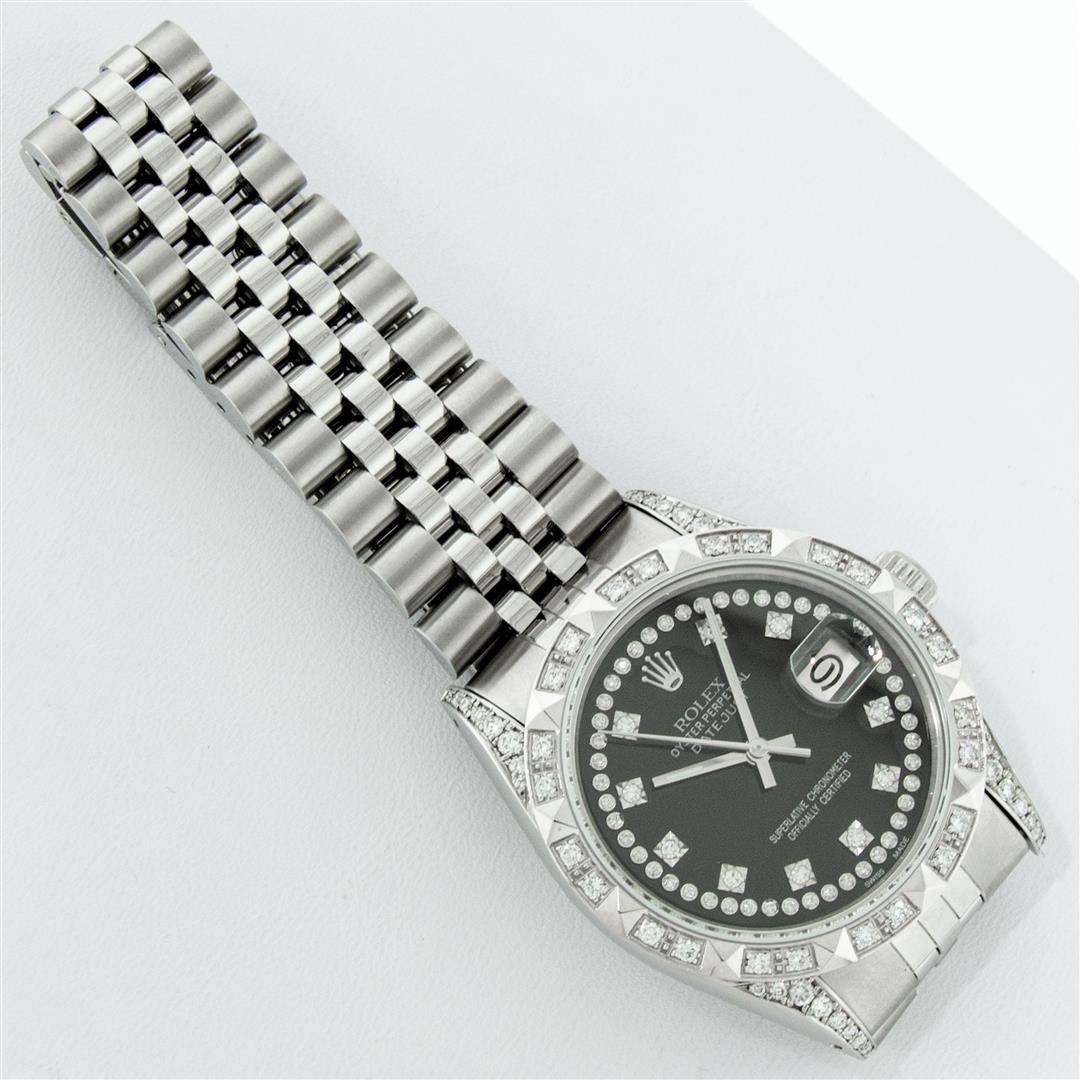 One Mens Pre Owned Stainless Steel Rolex Datejust Polished Bright with Satin Finish, Serviced & Electronically Tested, Rolex Stainless Steel Case: 36mm, Custom Diamonds On Lugs: 28 Diamonds On Lugs, Color: G to H, Clarity: SI-VS. Rolex Stainless Steel Crown, New Custom Bezel: 18K White Gold Pyramid Diamond Bezel, Diamond Count: 24 Diamonds On Bezel, Clarity: SI-VS, Color: G to H. Custom Crystal: New Sapphire With Magnified Date Window. Custom Hands: New Luminescent Hands. Rolex Movement: Automatic Winding Movement. Custom Dial: Refinished Black String With Custom Added Diamonds, Diamond Count: 58 Diamonds In Dial, Diamond Color: G To H In Color, Clarity: VS. Date Window: 3 O'clock Position Date Display, Quickset, Model: Datejust Condition: G-6 Extra Fine. Rolex Bracelet: Stainless Steel Jubilee Band. Bright Polish & Satin Finish. 7.0 Inch Length, Adjustable. Standard Clasp, With Rolex Logo. This Watch Has Been Serviced And Polished And Its Free Of All Dents And Scratches.