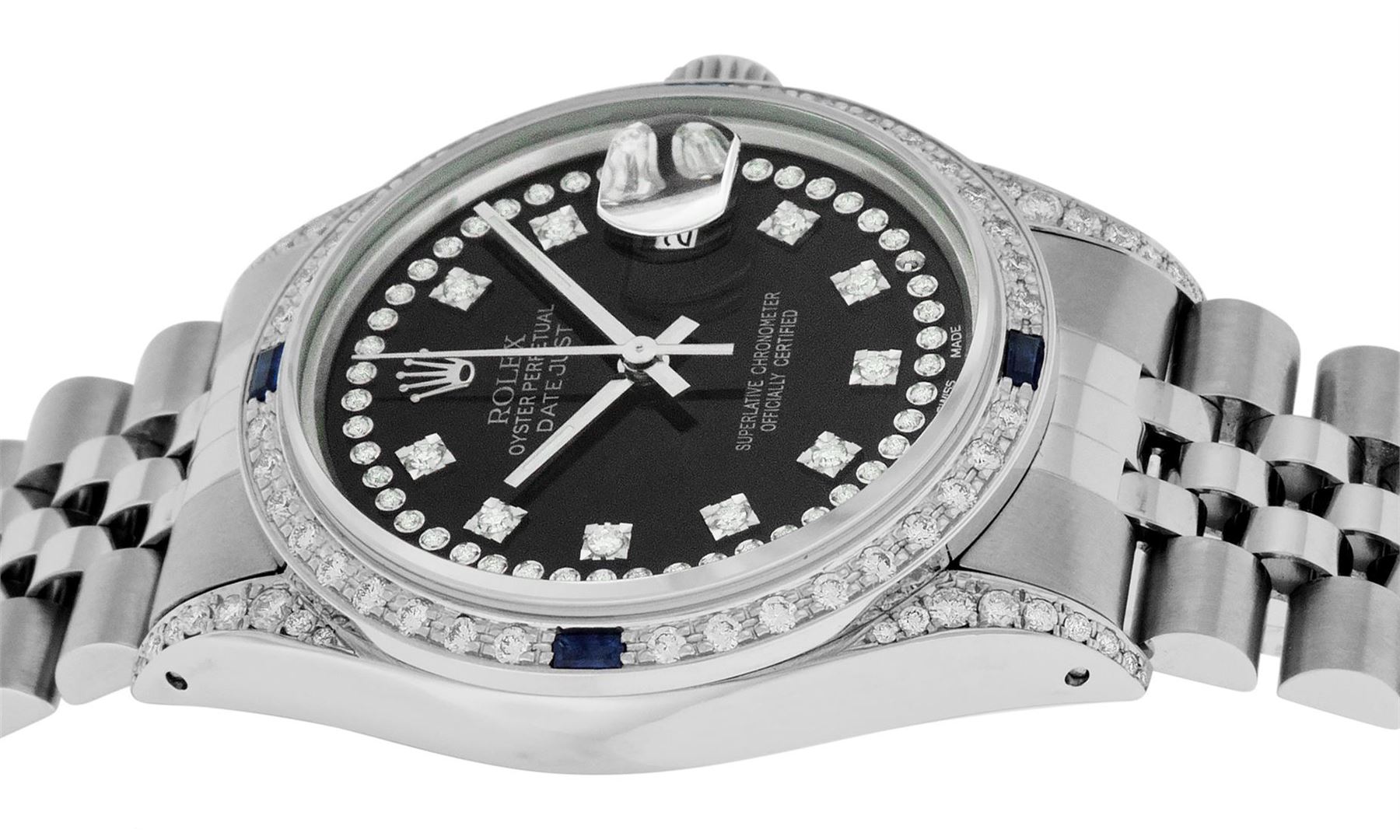 One Mens Pre Owned Rolex Datejust Polished Bright with Satin Finish, Serviced & Electronically Tested, Rolex Stainless Steel Case: 36mm, Custom Diamond Lugs: 28 Diamonds On Lugs, Color: G to H, Clarity: SI-VS. Stainless Steel Crown, Custom Bezel: New 18K White Gold Diamond + Sapphire Bead set, Diamond Count: 36 Diamonds + 4 Sapphires, Clarity: SI-VS, Color: G to H. Custom Crystal: New Sapphire With Date Window. Custom Hands: New Luminescent Hands. Rolex Movement: Automatic Winding Movement. Custom Dial: Refinished To Black With Custom Added Diamonds, Stone Count: 43 Diamonds On Dial, Diamond Color: G To H In Color, Clarity: VS. Date Window: 3 O'clock Position Date Display, Quickset, Model: Datejust Condition: G-6 Extra Fine. Rolex Bracelet: Stainless Steel Jubilee Band. Bright Polish & Satin Finish. 7.0 Inch Length, Adjustable. Standard Clasp, With Rolex Logo. This Watch Has Been Serviced And Polished And Its Free Of All Dents And Scratches.