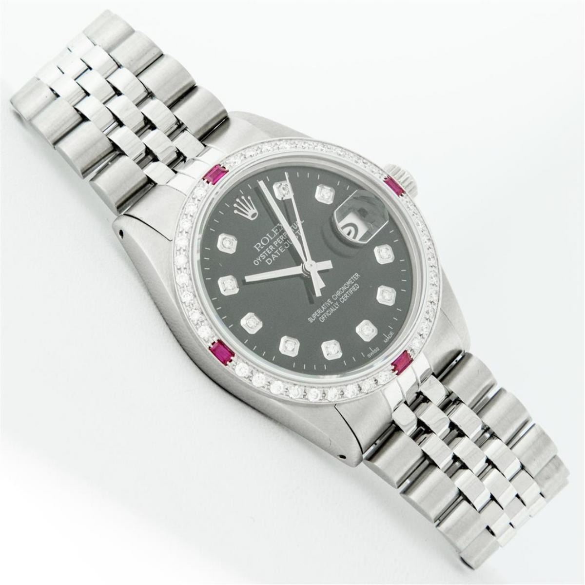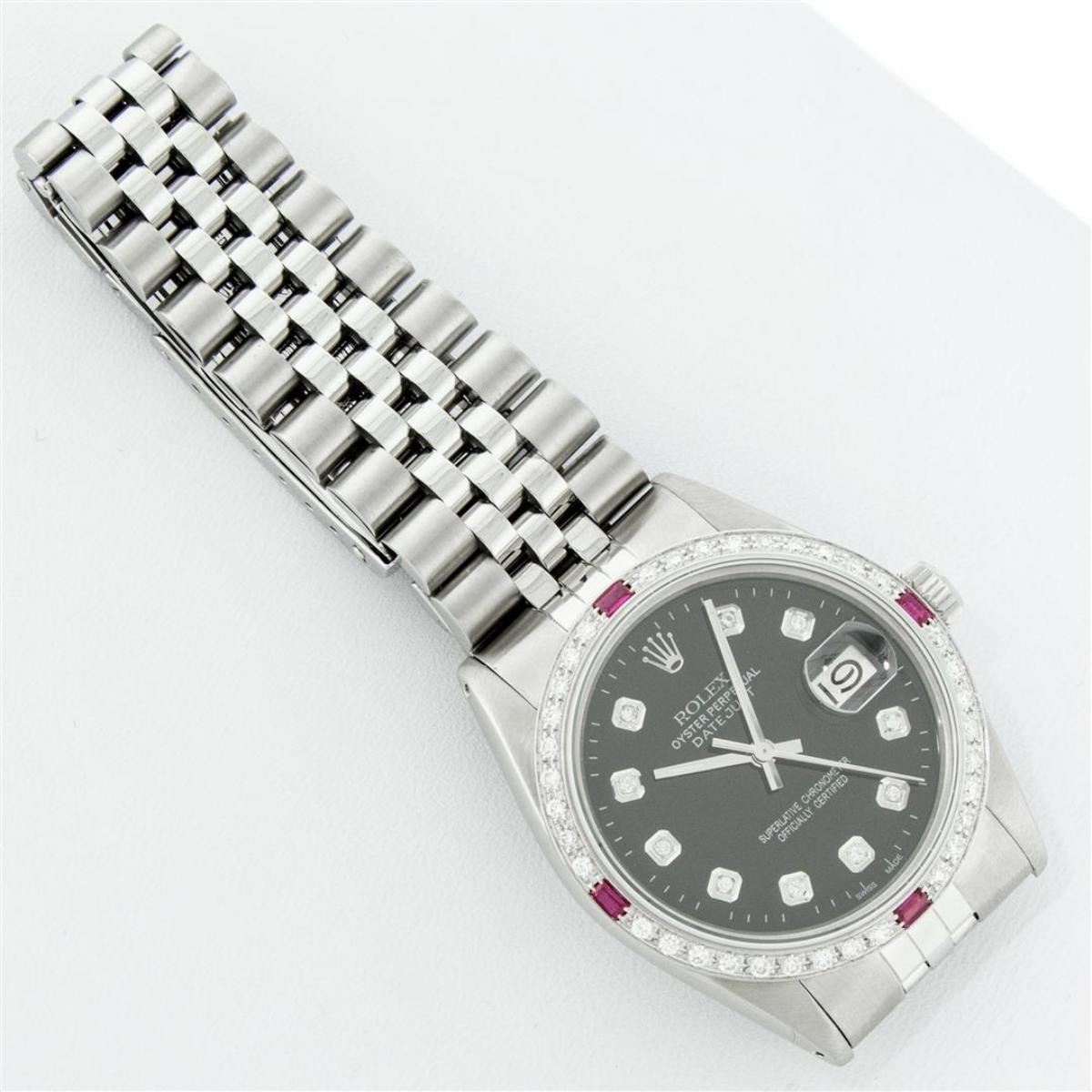 One Mens Stainless Steel Rolex Datejust Polished, Serviced & Electronically Tested, Stainless Steel Case: 36mm, Stainless Steel Crown, Custom Bezel: New 18K White Gold Ruby Beadset Diamond Bezel, Diamond + Gem Count: 36 Diamonds + 4 Rubies, Total Weight 1.00 Carat, Clarity: SI-VS, Color: G to H. Custom Crystal: New Scratch Resistant Synthetic Sapphire Cyclops Lens. Custom Hands: New Luminescent Hands. Movement: Automatic Winding Movement. Custom Dial: Black Diamond Dial With Dash Track, 10 Diamonds in Dial, G To H In Color, Clarity: SI-VS. Date Window: 3 O'Clock Position Date Display, Quickset, Model: Datejust. Condition: G-6 Extra Fine. Bracelet: Stainless Steel Jubilee Band. Bright Polish & Satin Finish. 7.0 Inch Length, Adjustable. Standard Clasp, With Rolex Logo. This Watch Has Been Serviced Time Tested And Is In Excellent Condition It Is Free Of All Scratches And Dents.