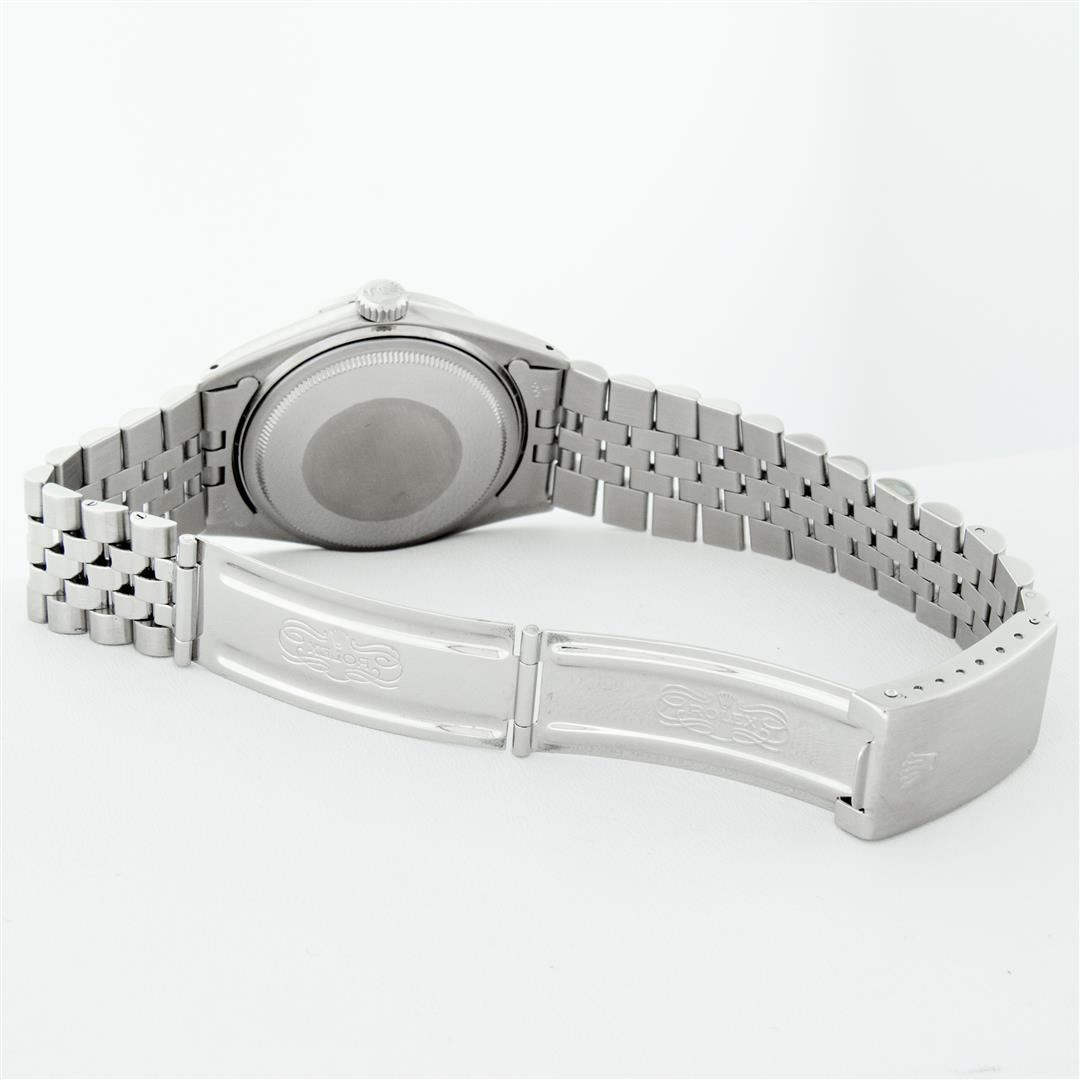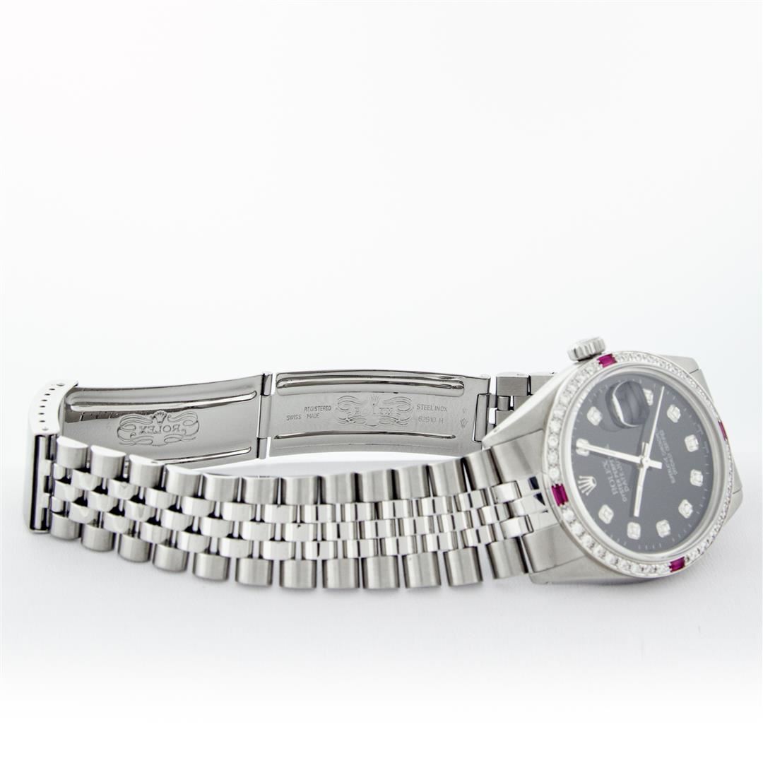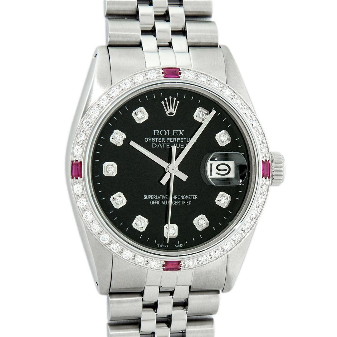 One Mens Stainless Steel Rolex Datejust Polished, Serviced & Electronically Tested, Stainless Steel Case: 36mm, Stainless Steel Crown, Custom Bezel: New 18K White Gold Ruby Beadset Diamond Bezel, Diamond + Gem Count: 36 Diamonds + 4 Rubies, Total Weight 1.00 Carat, Clarity: SI-VS, Color: G to H. Custom Crystal: New Scratch Resistant Synthetic Sapphire Cyclops Lens. Custom Hands: New Luminescent Hands. Movement: Automatic Winding Movement. Custom Dial: Black Diamond Dial With Dash Track, 10 Diamonds in Dial, G To H In Color, Clarity: SI-VS. Date Window: 3 O'Clock Position Date Display, Quickset, Model: Datejust. Condition: G-6 Extra Fine. Bracelet: Stainless Steel Jubilee Band. Bright Polish & Satin Finish. 7.0 Inch Length, Adjustable. Standard Clasp, With Rolex Logo. This Watch Has Been Serviced Time Tested And Is In Excellent Condition It Is Free Of All Scratches And Dents.