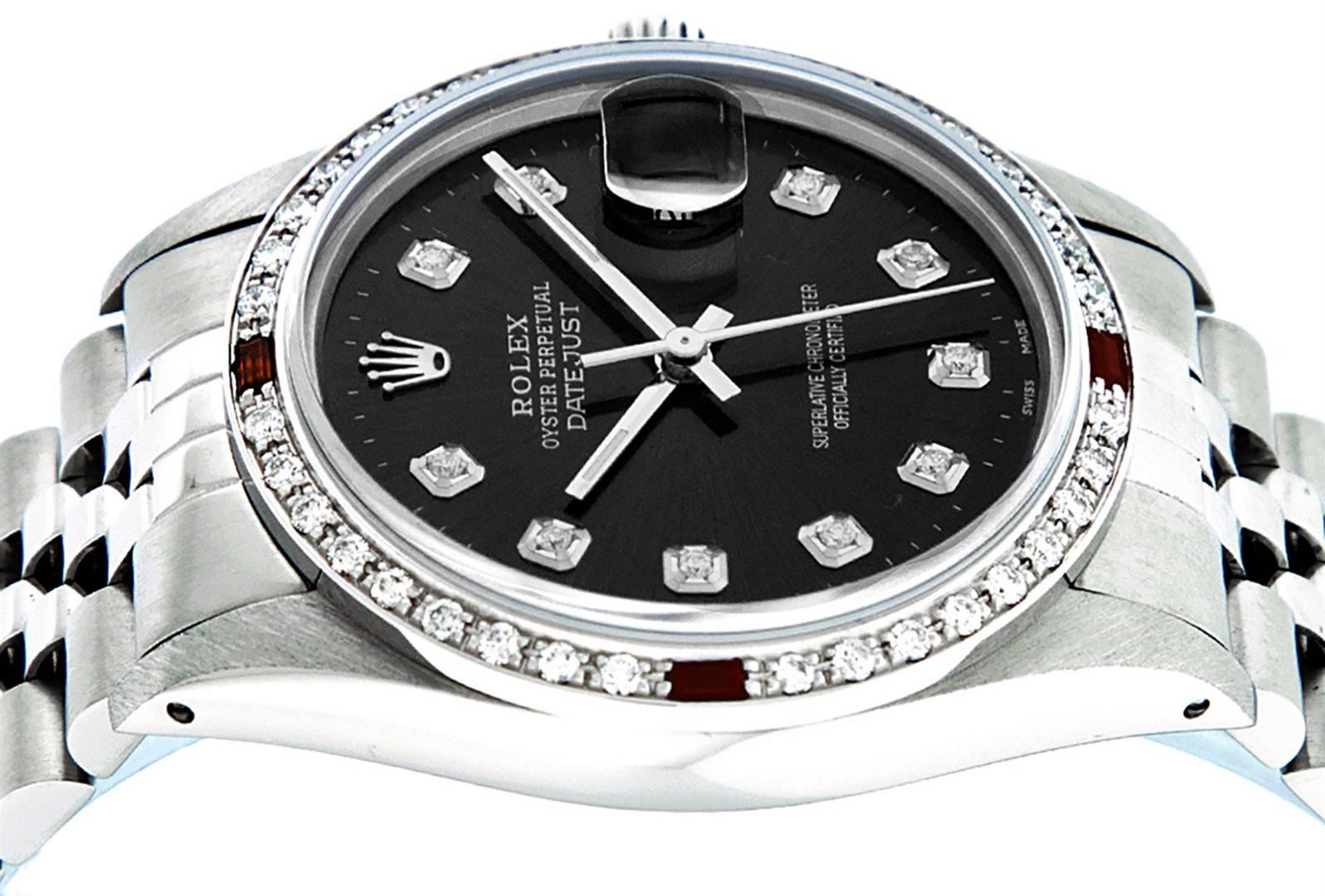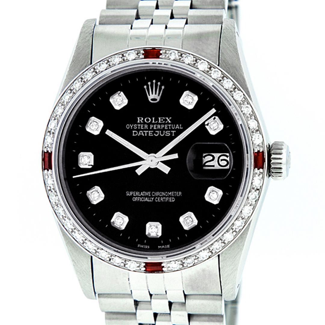 One Mens Pre Owned Stainless Steel Rolex Datejust Polished, Serviced & Electronically Tested, Rolex Stainless Steel Case: 36mm, Rolex Stainless Steel Crown, Custom Bezel: New 18K White Gold Ruby Bead set Diamond Bezel, Diamond + Gem Count: 36 Diamonds + 4