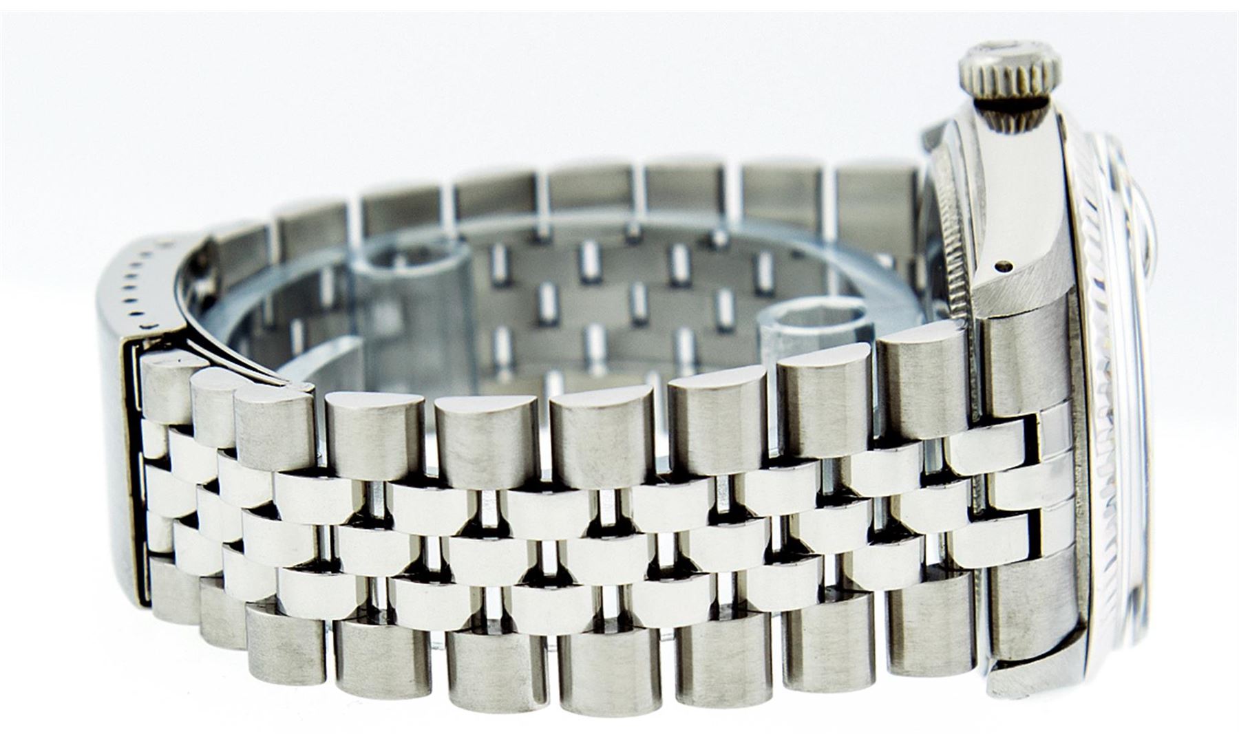 One Mens Rolex Datejust Polished, Serviced & Electronically Tested, Stainless Steel Case:36mm, Stainless Steel Crown, Original Bezel: 18K White Gold Fluted Bezel. Custom Crystal: Sapphire Cyclops Lens. Movement: Automatic Winding Movement Caliber 3135. Custom Dial: Black Diamond Dial With Track, Diamond Count: 10 Diamonds, Clarity: SI-VS, Color: G to H. Date Window: 3 O'Clock Position Date Display, Quickset, Model: 16234 Sapphire Datejust. Condition: G-6 Extra Fine. Bracelet: Stainless Steel Rolex Jubilee Band. Bright Polish & Satin Finish. 7.0 Inch Length, Adjustable. Standard Clasp, With Rolex Logo.