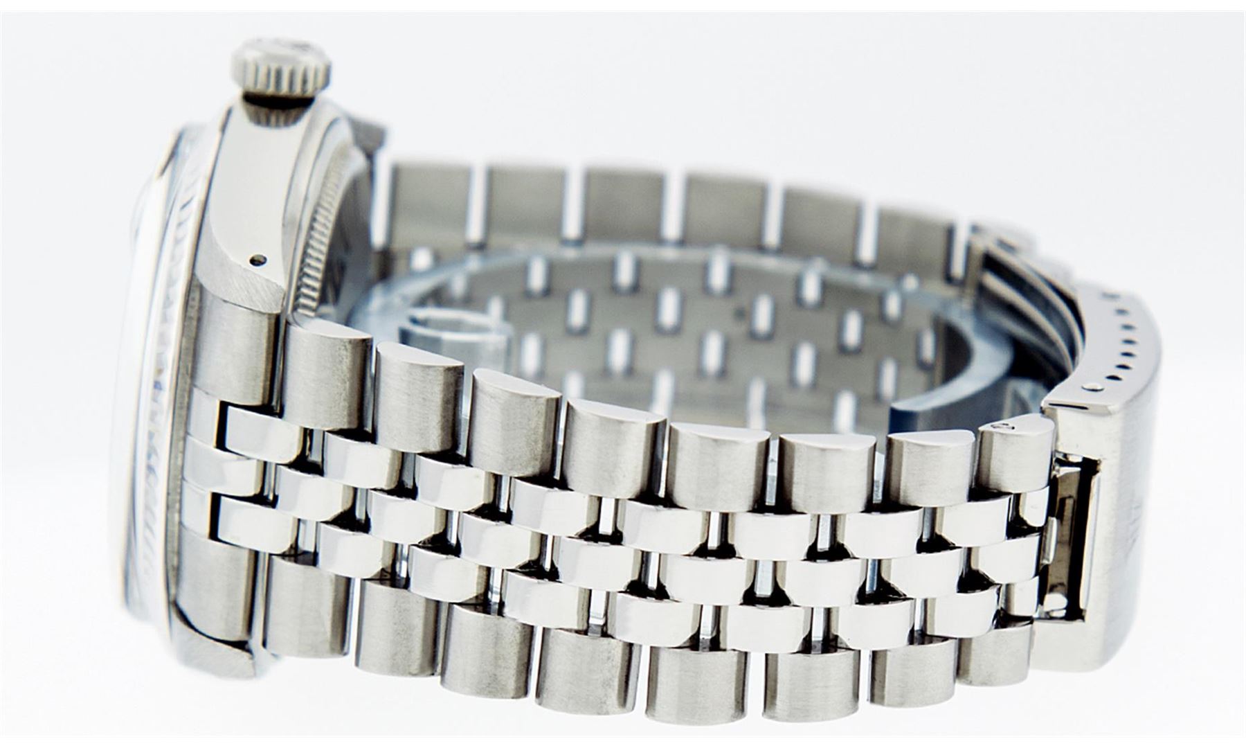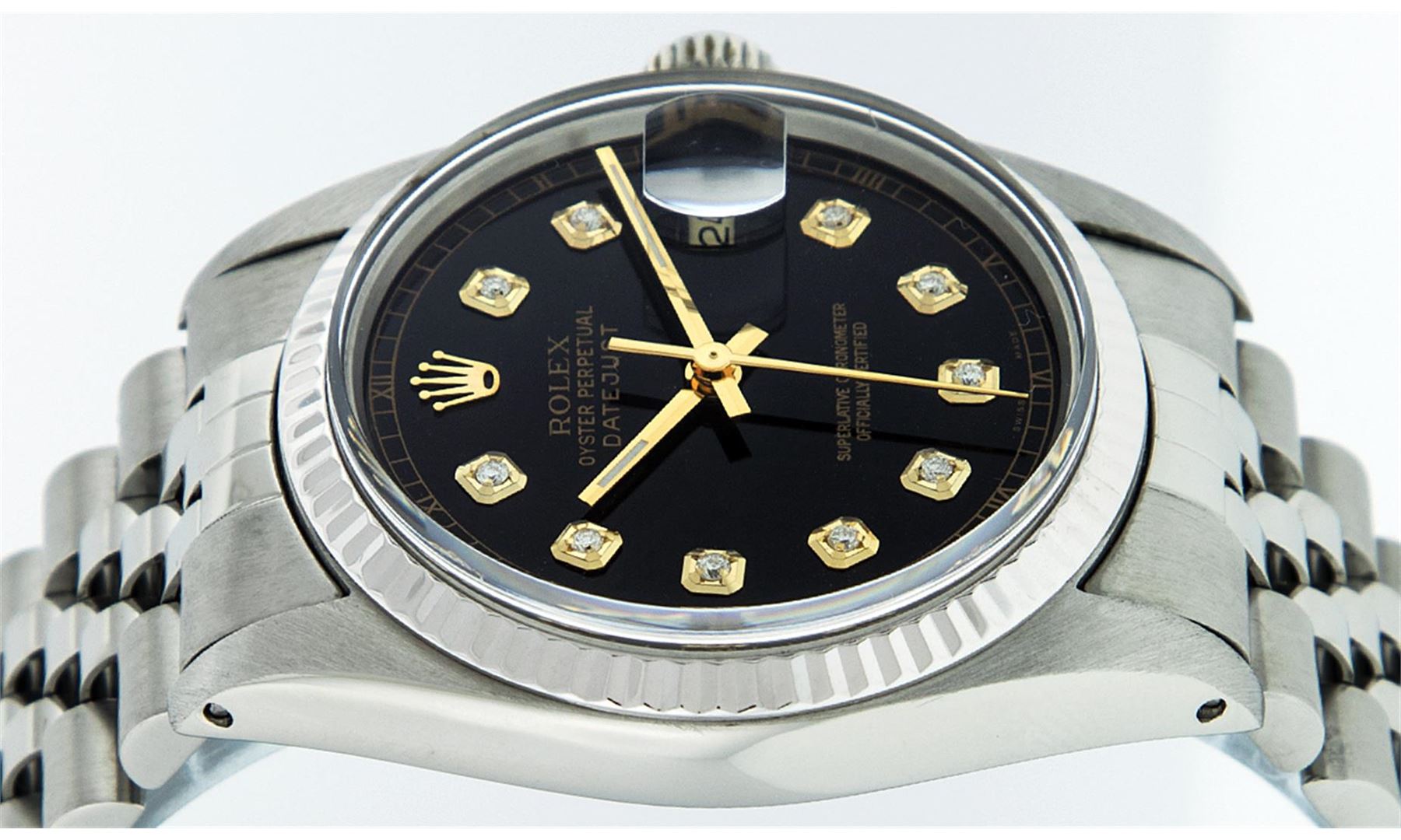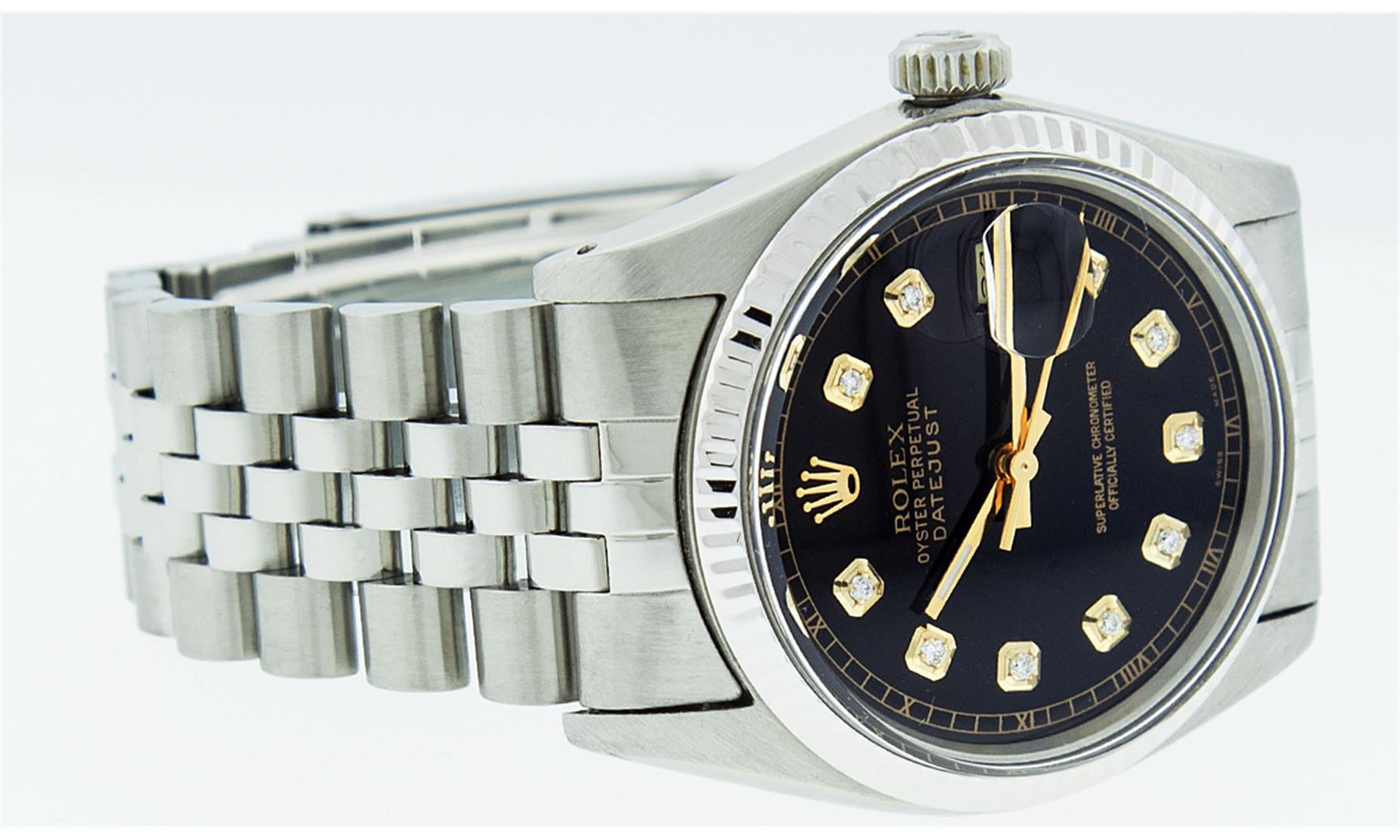 One Mens Rolex Datejust Polished, Serviced & Electronically Tested, Stainless Steel Case:36mm, Stainless Steel Crown, Original Bezel: 18K White Gold Fluted Bezel. Custom Crystal: Sapphire Cyclops Lens. Movement: Automatic Winding Movement Caliber 3135. Custom Dial: Black Diamond Dial With Track, Diamond Count: 10 Diamonds, Clarity: SI-VS, Color: G to H. Date Window: 3 O'Clock Position Date Display, Quickset, Model: 16234 Sapphire Datejust. Condition: G-6 Extra Fine. Bracelet: Stainless Steel Rolex Jubilee Band. Bright Polish & Satin Finish. 7.0 Inch Length, Adjustable. Standard Clasp, With Rolex Logo.