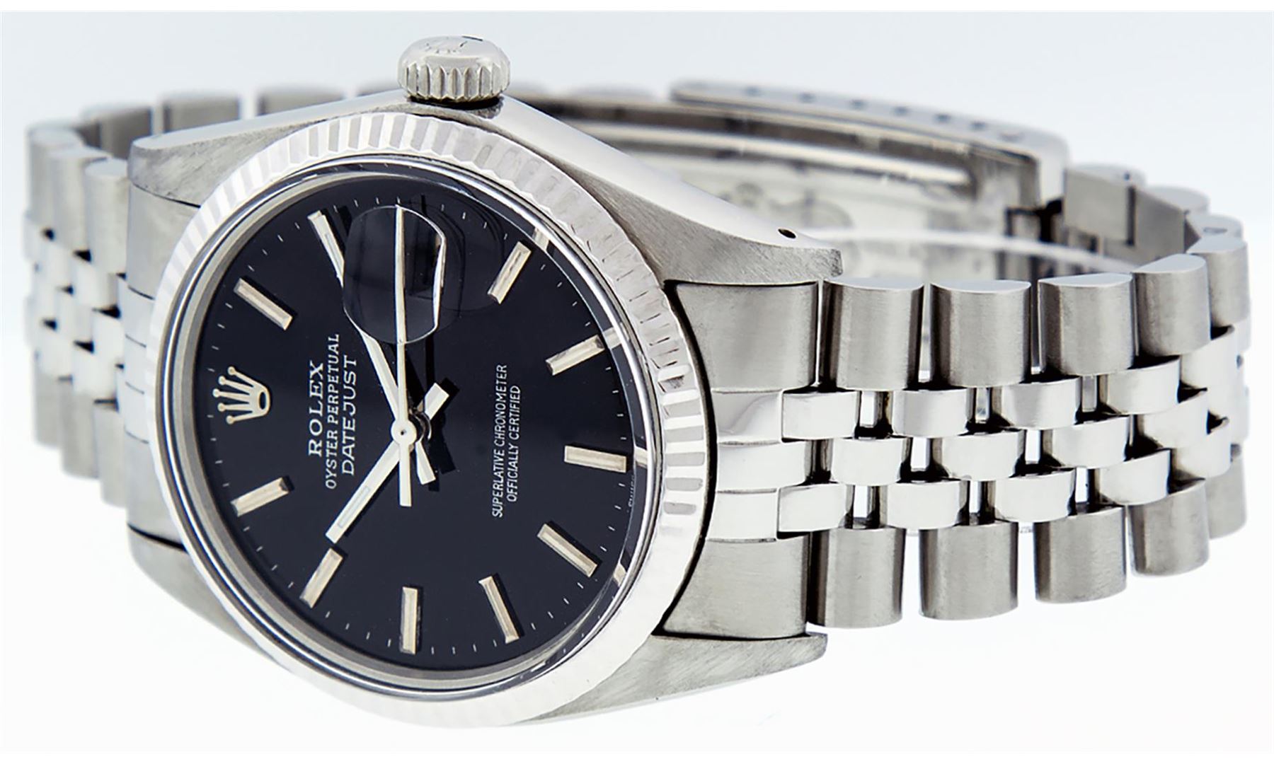 One Mens Pre Owned Rolex Datejust Polished, Serviced & Electronically Tested, Rolex Stainless Steel Case: 36mm, Rolex Stainless Steel Crown, Rolex Bezel: 14K White Gold Fluted Bezel. Custom Crystal: Acrylic With Magnified Date Window. Custom Hands: New Luminescent Hands. Rolex Movement: Automatic Winding Movement 3035. Custom Dial: Refinished To Black Dial With Index Hour Markers With Line Track. Date Window: 3 O'Clock Position Date Display, Quickset, Model: Datejust, Condition: G-6 Extra Fine. Rolex Bracelet: Stainless Steel Jubilee Band. Bright Polish & Satin Finish. 7.0 Inch Length, Adjustable. Standard Clasp, With Rolex Logo. This Watch Has Been Serviced And Polished It Is Free Of All Scratches And Dents.