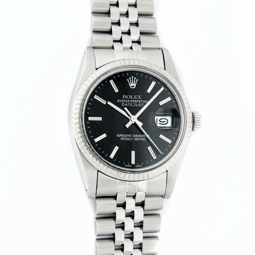One Mens Pre Owned Rolex Datejust Polished, Serviced & Electronically Tested, Rolex Stainless Steel Case: 36mm, Rolex Stainless Steel Crown, Rolex Bezel: 14K White Gold Fluted Bezel. Custom Crystal: Acrylic With Magnified Date Window. Custom Hands: New Luminescent Hands. Rolex Movement: Automatic Winding Movement 3035. Custom Dial: Refinished To Black Dial With Index Hour Markers With Line Track. Date Window: 3 O'Clock Position Date Display, Quickset, Model: Datejust, Condition: G-6 Extra Fine. Rolex Bracelet: Stainless Steel Jubilee Band. Bright Polish & Satin Finish. 7.0 Inch Length, Adjustable. Standard Clasp, With Rolex Logo. This Watch Has Been Serviced And Polished It Is Free Of All Scratches And Dents.