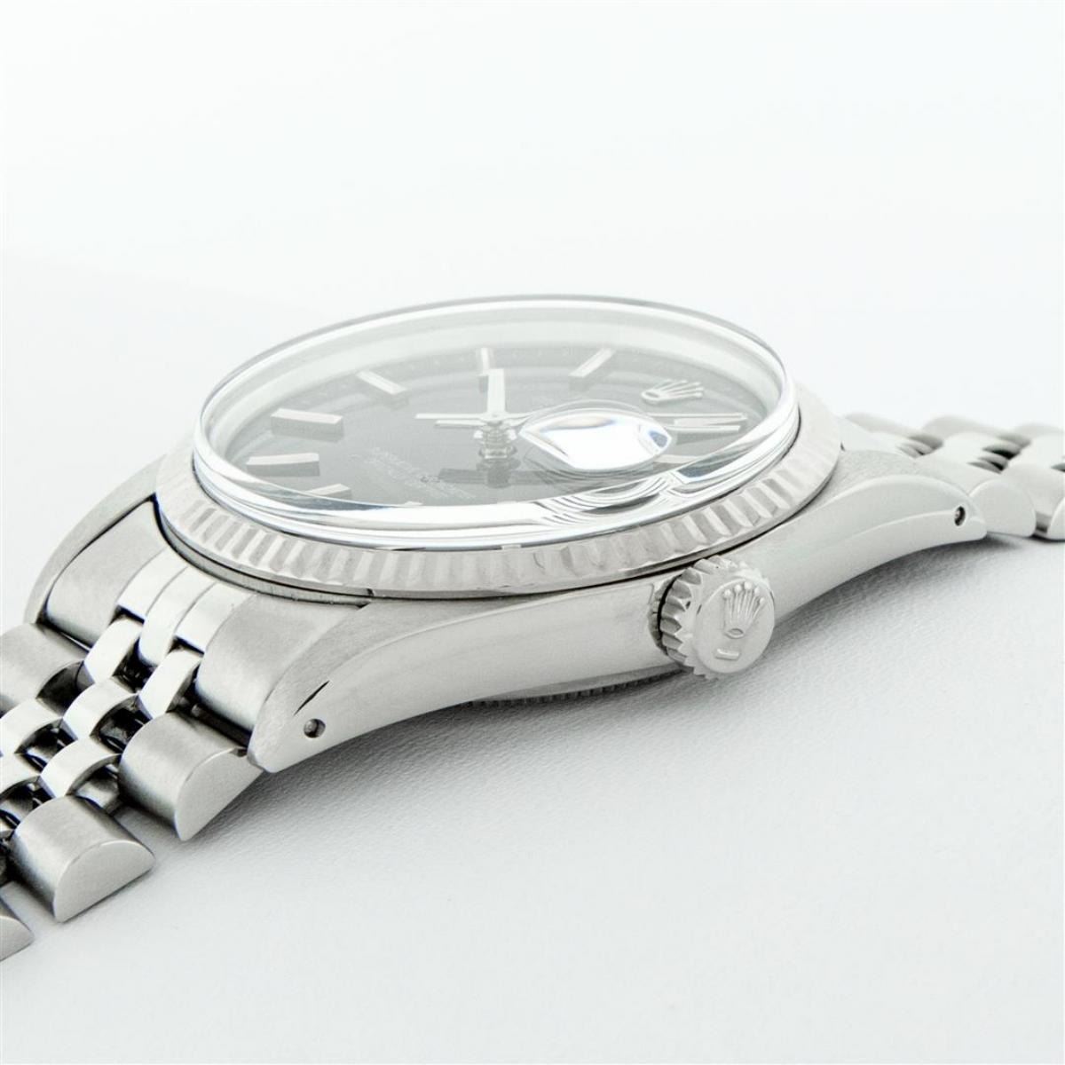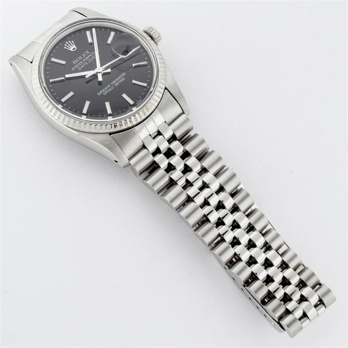 One Mens Rolex Datejust Polished, Serviced & Electronically Tested, Stainless Steel Case: 36mm, Stainless Steel Crown, Bezel: 14K White Gold Fluted Bezel. Custom Crystal: Acrylic Cyclops Lens. Custom Hands: New Luminescent Hands. Movement: Automatic Winding Movement. Custom Dial: Black Dial With Index Hour Markers With Line Track. Date Window: 3 O'Clock Position Date Display, Quickset, Model: Datejust, Condition: G-6 Extra Fine. Bracelet: Stainless Steel Jubilee. Bright Polish & Satin Finish. 7.0 Inch Length, Adjustable. Standard Clasp, With Rolex Logo. Watch Has Been Serviced And Polished It Is Free Of All Scratches And Dents.