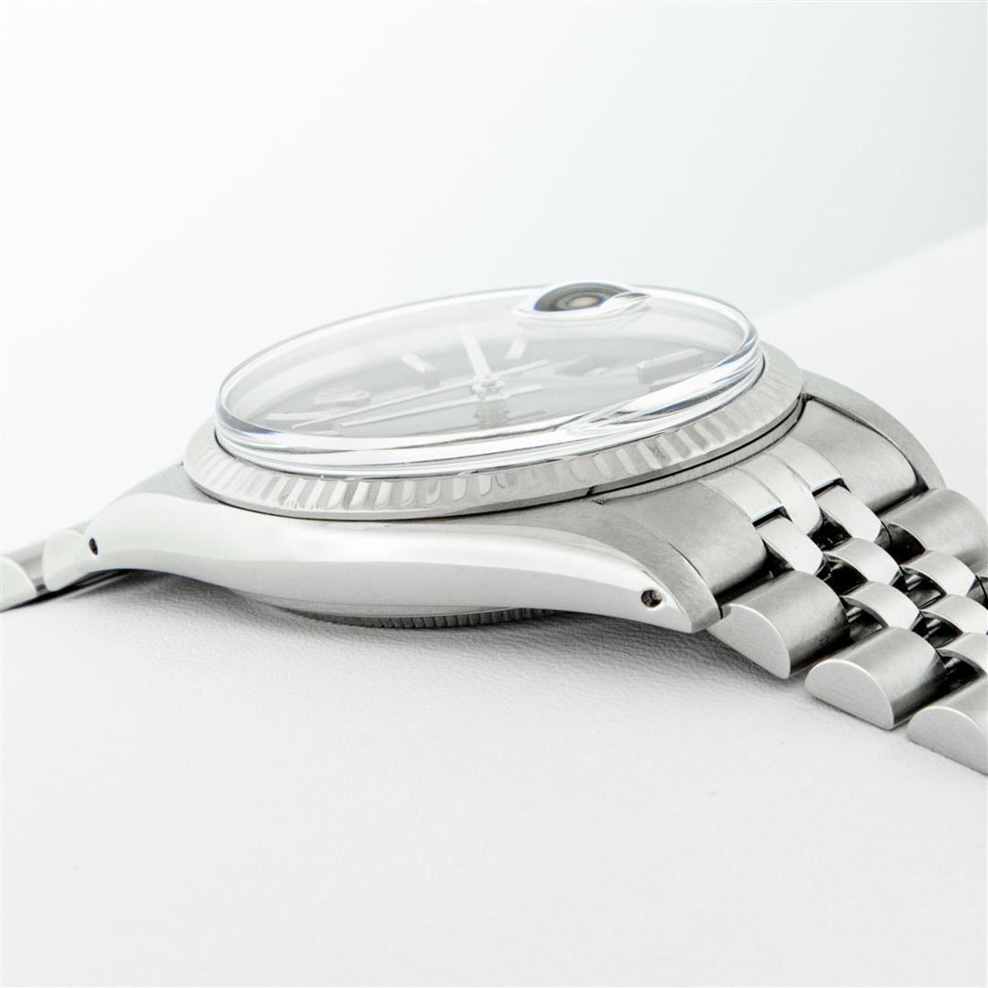 One Mens Pre Owned Rolex Datejust Polished, Serviced & Electronically Tested, Rolex Stainless Steel Case: 36mm, Rolex Stainless Steel Crown, Rolex Bezel: 14K White Gold Fluted Bezel. Custom Crystal: Acrylic Cyclops Lens. Custom Hands: New Luminescent Hands. Rolex Movement: Automatic Winding Movement. Custom Dial: Refinished Black Dial With Index Hour Markers With Line Track. Date Window: 3 O'Clock Position Date Display, Quickset, Model: Datejust, Condition: G-6 Extra Fine. Bracelet: Stainless Steel Jubilee Band. Bright Polish & Satin Finish. 7.0 Inch Length, Adjustable. Standard Clasp, With Rolex Logo. Watch Has Been Serviced And Polished It Is Free Of All Scratches And Dents.