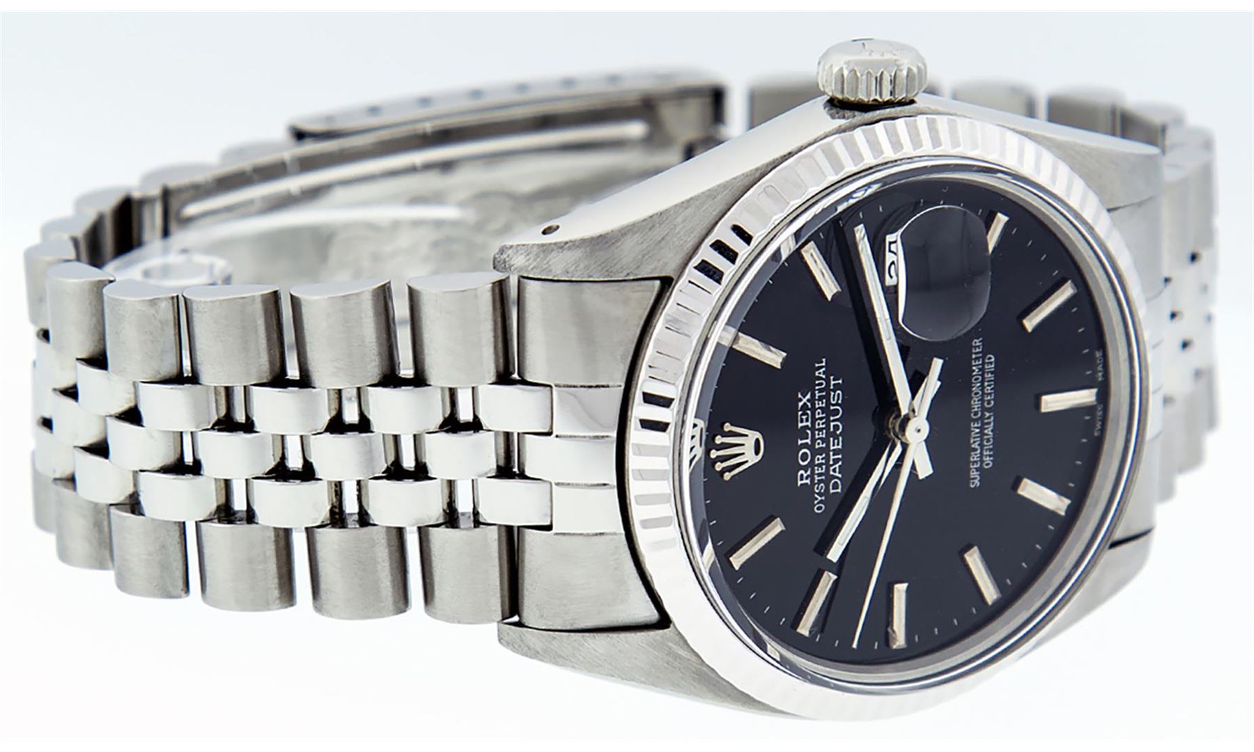 One Mens Rolex Datejust Polished, Serviced & Electronically Tested, Stainless Steel Case: 36mm, Stainless Steel Crown, Bezel: 14K White Gold Fluted Bezel. Custom Crystal: Acrylic Cyclops Lens. Custom Hands: New Luminescent Hands. Movement: Automatic Winding Movement. Custom Dial: Black Dial With Index Hour Markers With Line Track. Date Window: 3 O'Clock Position Date Display, Quickset, Model: Datejust, Condition: G-6 Extra Fine. Bracelet: Stainless Steel Jubilee. Bright Polish & Satin Finish. 7.0 Inch Length, Adjustable. Standard Clasp, With Rolex Logo. Watch Has Been Serviced And Polished It Is Free Of All Scratches And Dents.