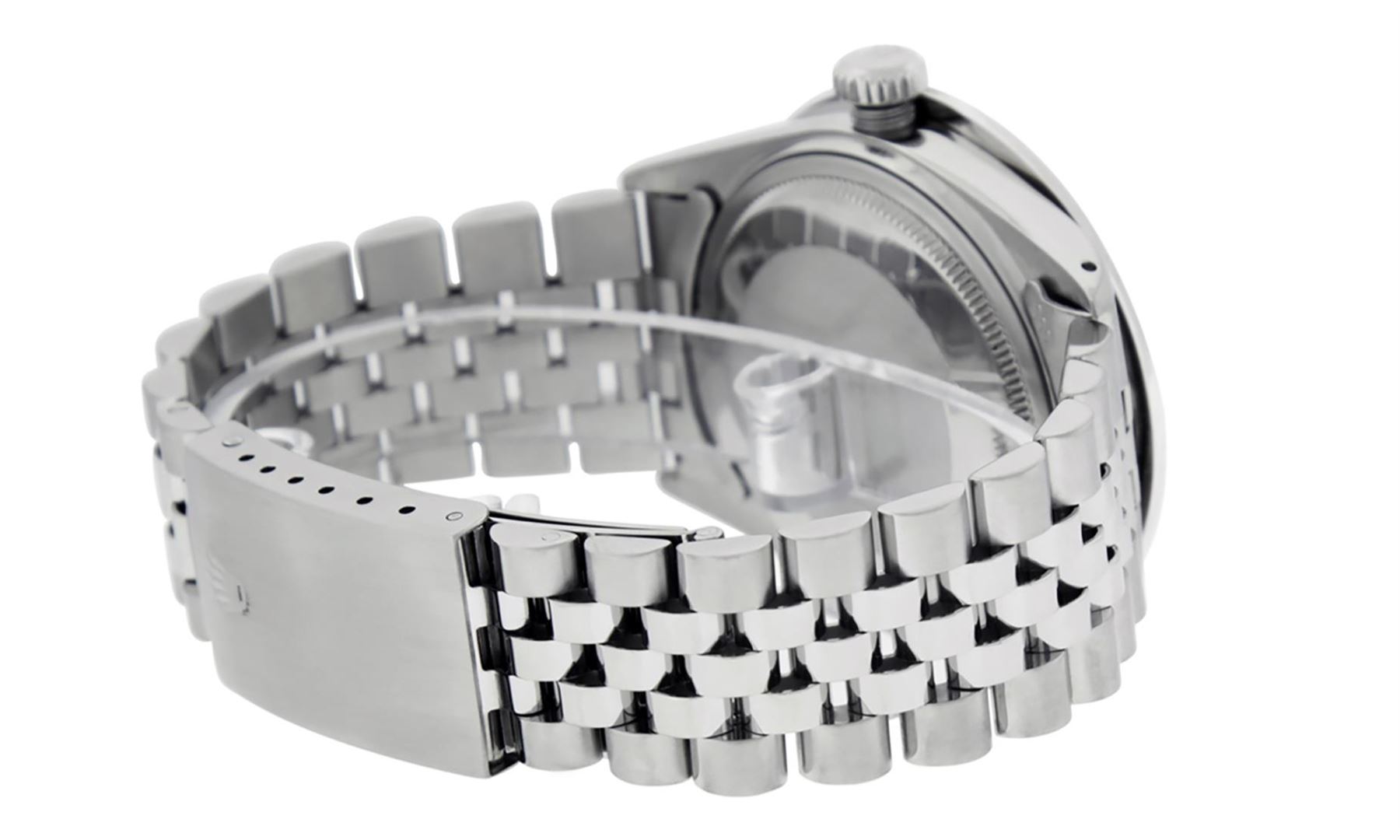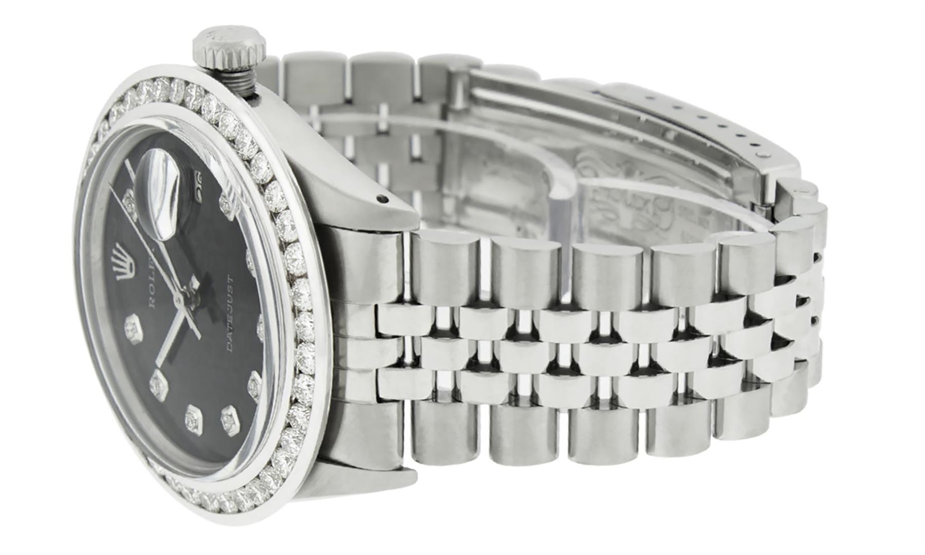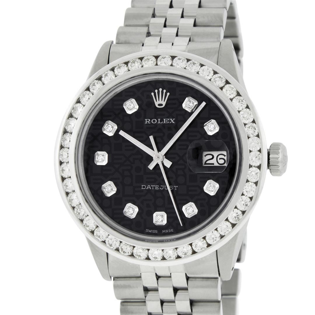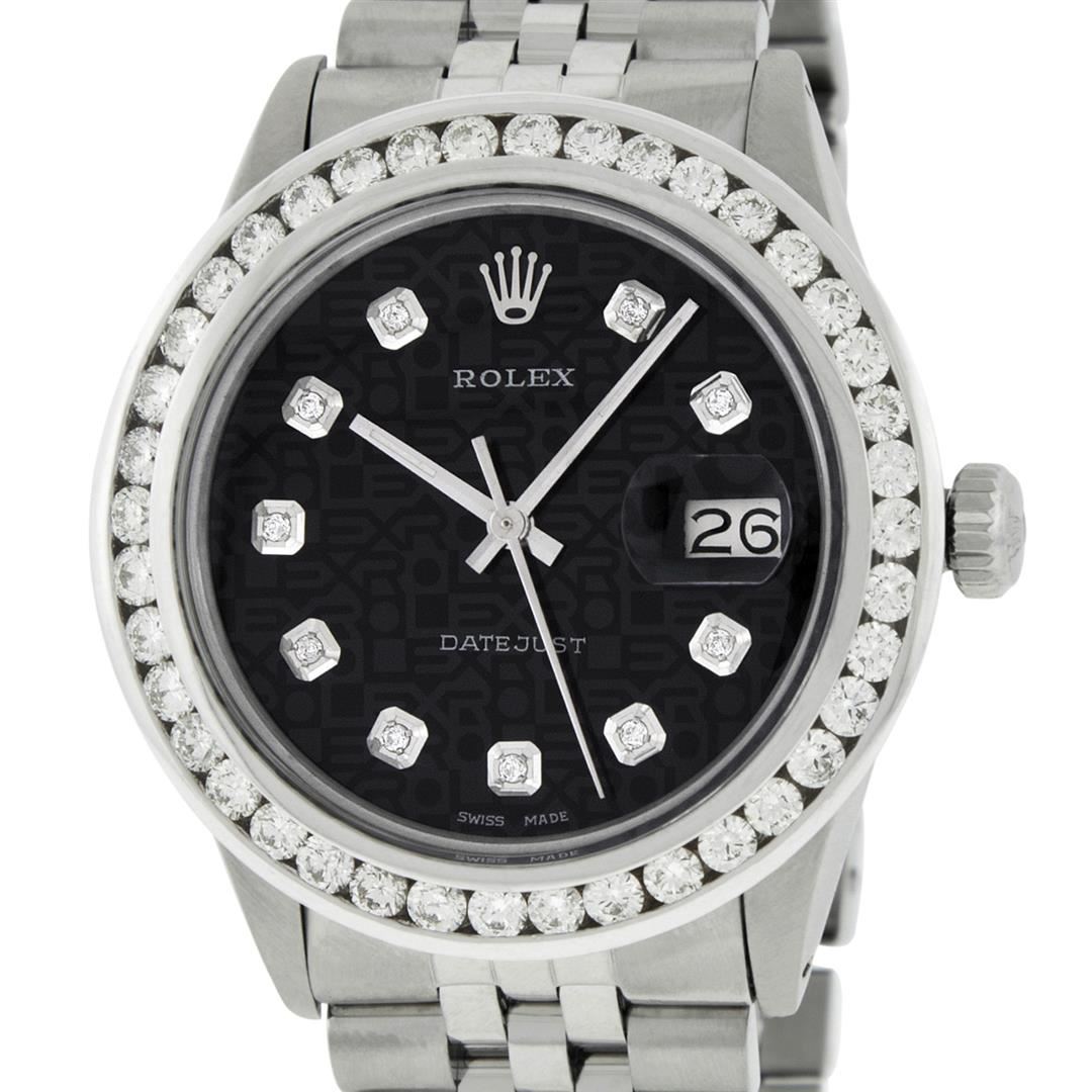 One Mens Stainless Steel Rolex Datejust Polished Bright with Satin Finish, Fully Serviced & Electronically Tested, Stainless Steel Case: 36mm, Stainless Steel Crown, Custom Bezel: New 18K White Gold 3.00 Ctw Channel Set Diamond Bezel, Diamond Count: 40 Diamonds In Bezel, Total Bezel Weight 3.0 Carat, Clarity: SI-VS, Color: G to H. Custom Crystal: New Scratch Resistant Synthetic Sapphire Cyclops Lens. Custom Hands: New Luminecent Hands. Movement: Automatic Winding Movement. Custom Refinshed Dial: Black Diamond Jubilee Dial, Stone Count: 10 Diamonds in Dial, G To H In Color, Clarity: SI-VS. Date Window: 3 O'Clock Position Date Display, Quickset, Model: Datejust 36mm, Condition: G-6 Extra Fine. Bracelet: Rolex Stainless Steel Jubilee Band. Bright Polish & Satin Finish. 7.0 Inch Length, Adjustable. Standard Clasp, With Rolex Logo. Watch Has Been Serviced And Polished It Is Free Of All Scratches And Dents. This Watch Comes With A Rolex Box.
