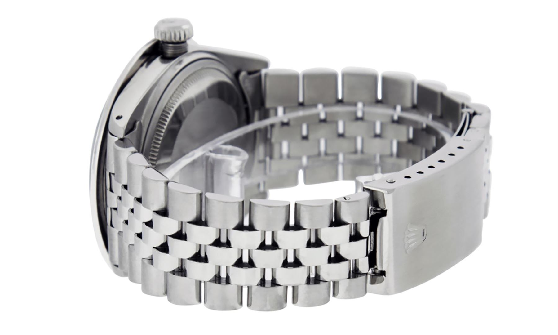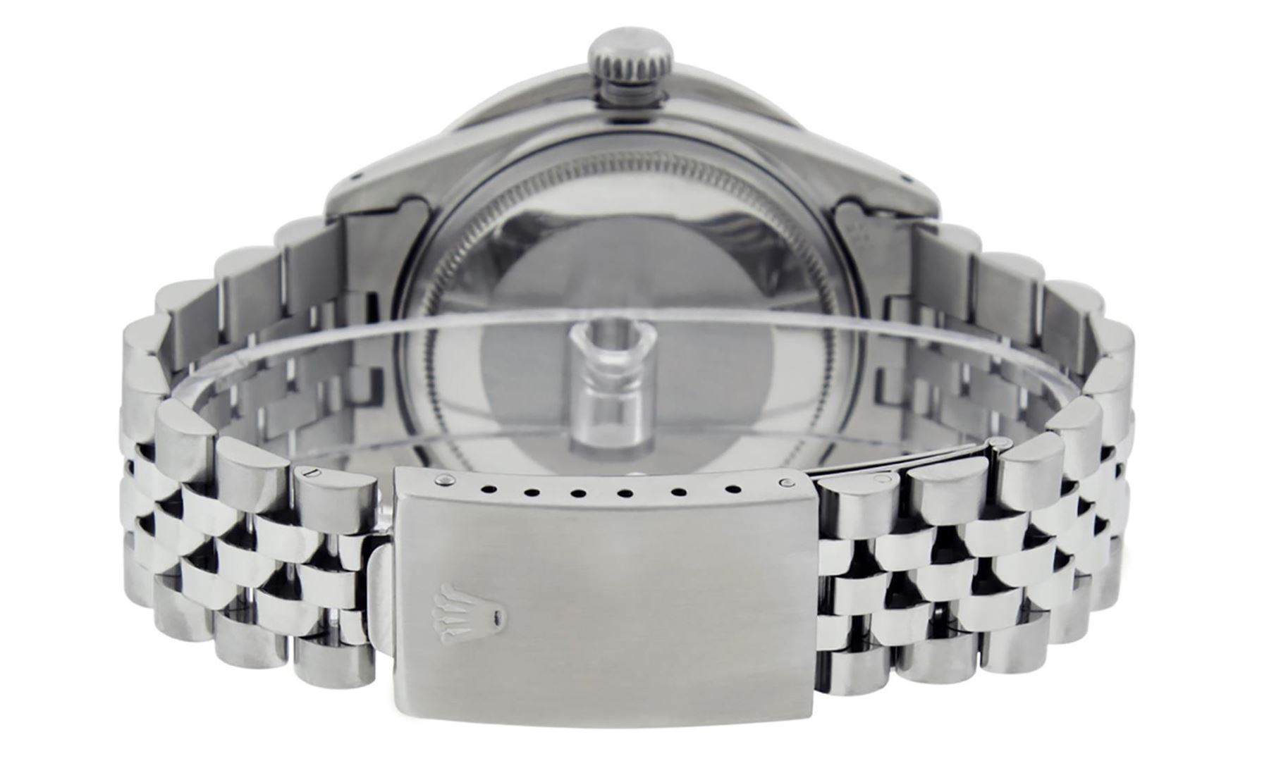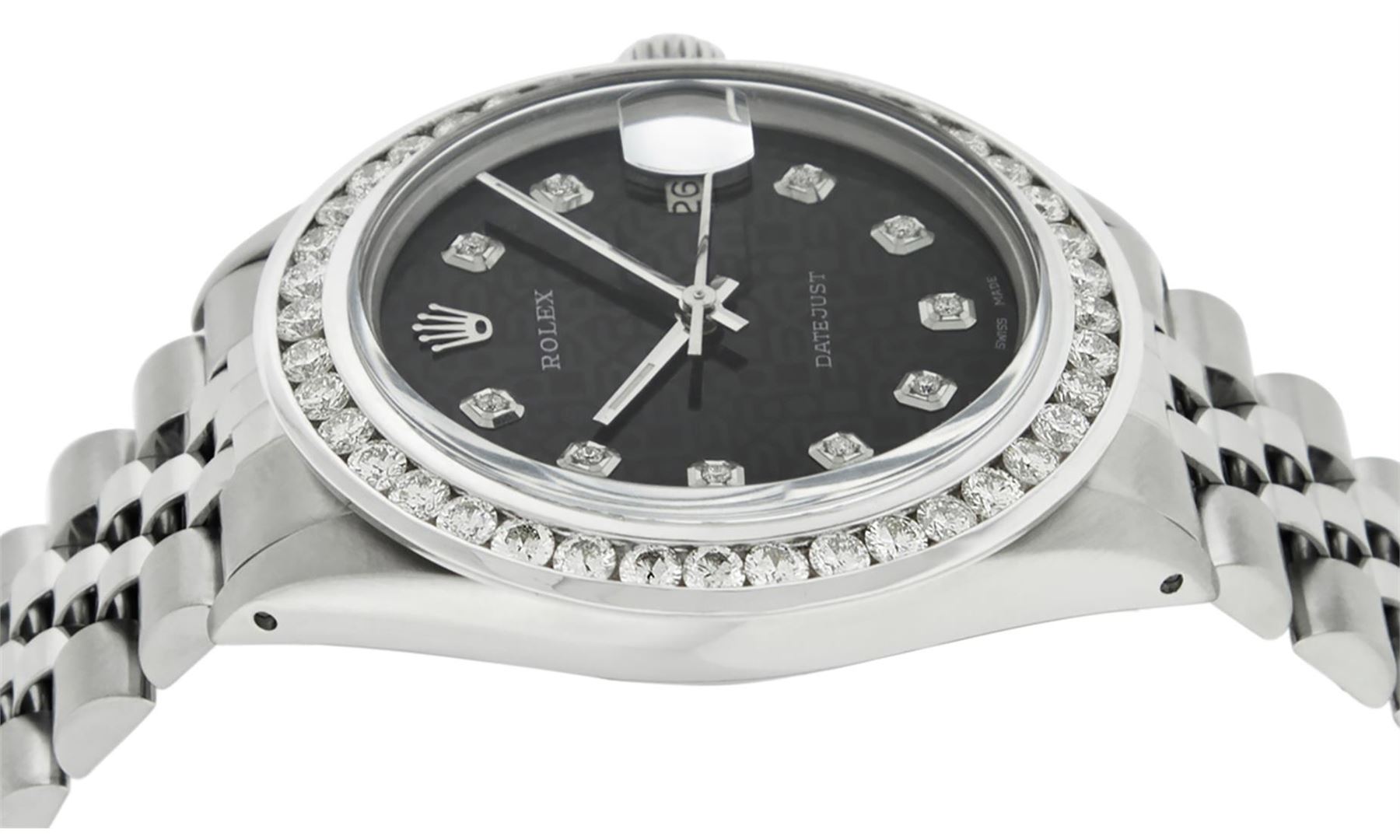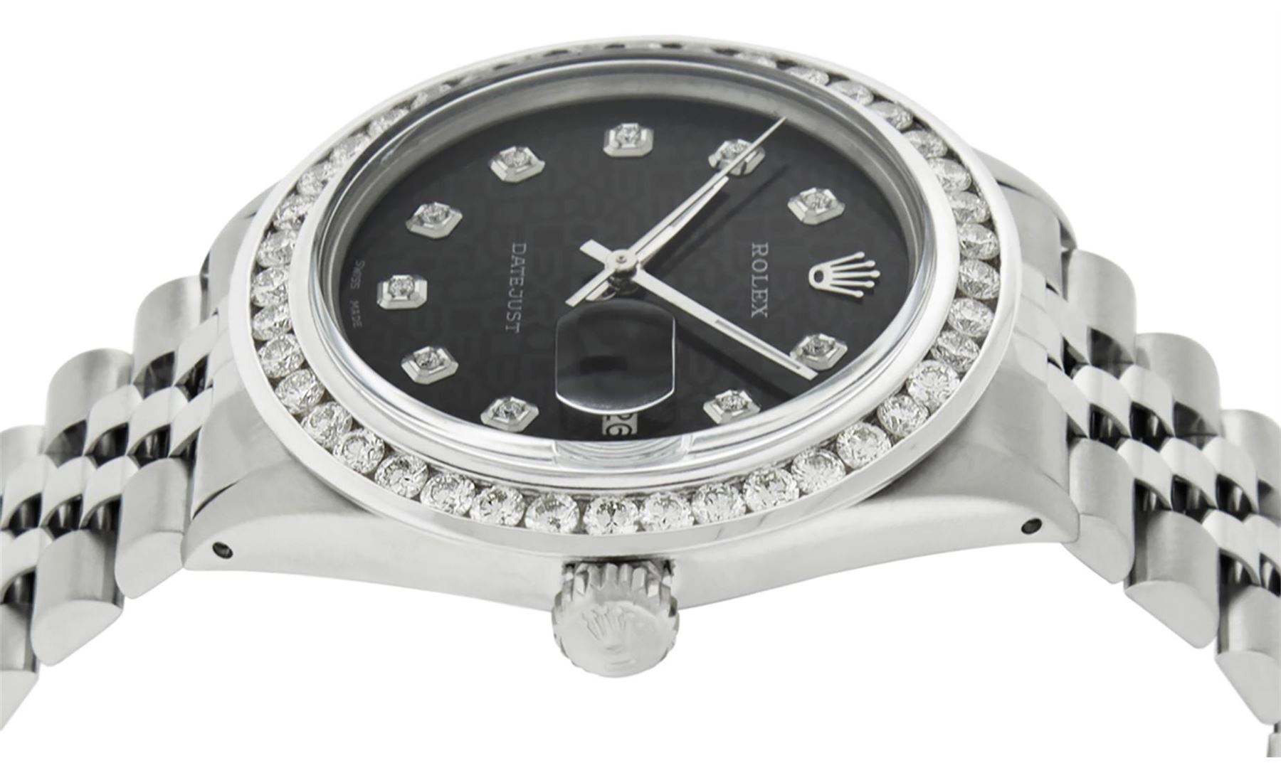 One Mens Stainless Steel Rolex Datejust Polished Bright with Satin Finish, Fully Serviced & Electronically Tested, Stainless Steel Case: 36mm, Stainless Steel Crown, Custom Bezel: New 18K White Gold 3.00 Ctw Channel Set Diamond Bezel, Diamond Count: 40 Diamonds In Bezel, Total Bezel Weight 3.0 Carat, Clarity: SI-VS, Color: G to H. Custom Crystal: New Scratch Resistant Synthetic Sapphire Cyclops Lens. Custom Hands: New Luminecent Hands. Movement: Automatic Winding Movement. Custom Refinshed Dial: Black Diamond Jubilee Dial, Stone Count: 10 Diamonds in Dial, G To H In Color, Clarity: SI-VS. Date Window: 3 O'Clock Position Date Display, Quickset, Model: Datejust 36mm, Condition: G-6 Extra Fine. Bracelet: Rolex Stainless Steel Jubilee Band. Bright Polish & Satin Finish. 7.0 Inch Length, Adjustable. Standard Clasp, With Rolex Logo. Watch Has Been Serviced And Polished It Is Free Of All Scratches And Dents. This Watch Comes With A Rolex Box.
