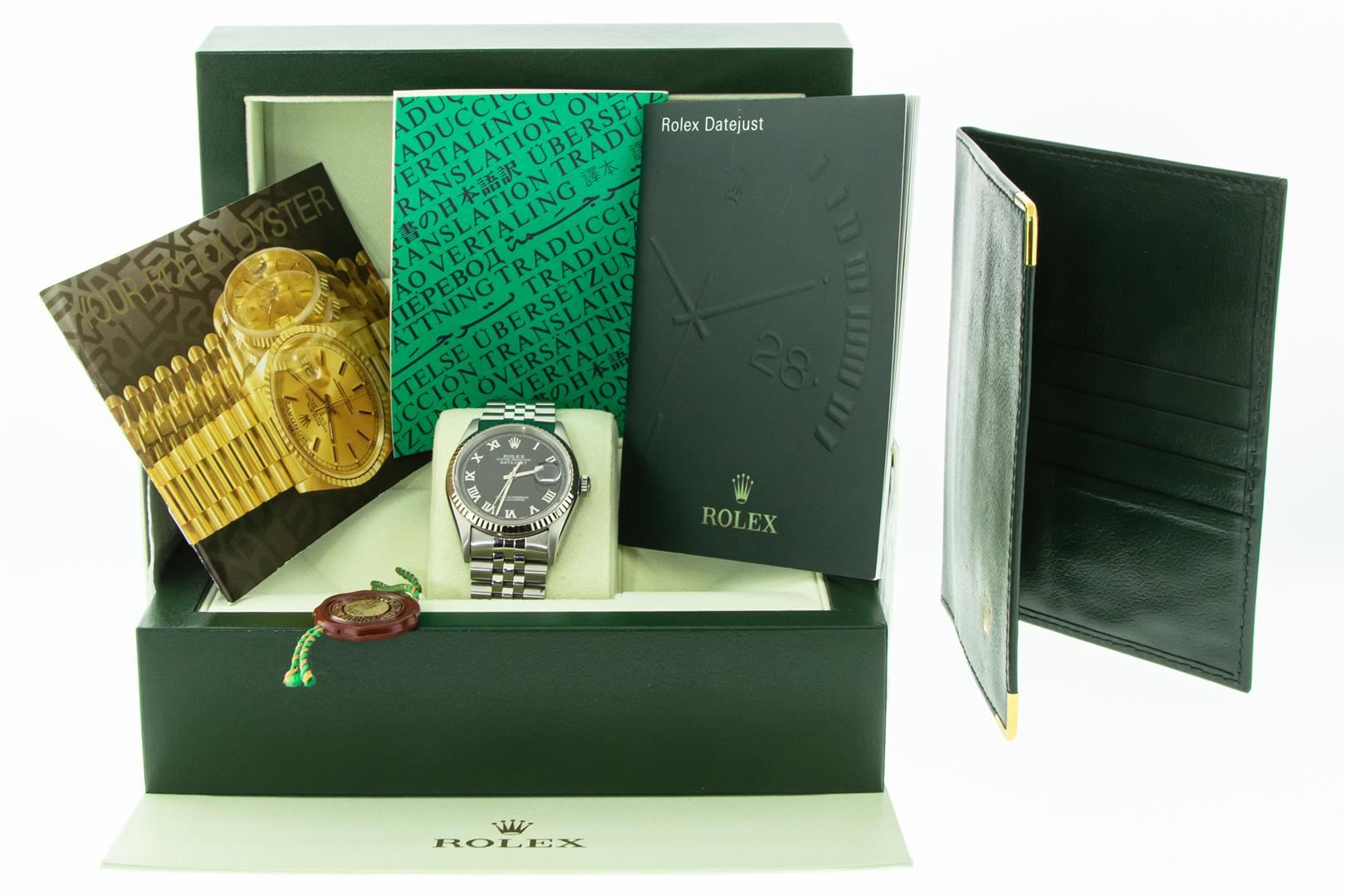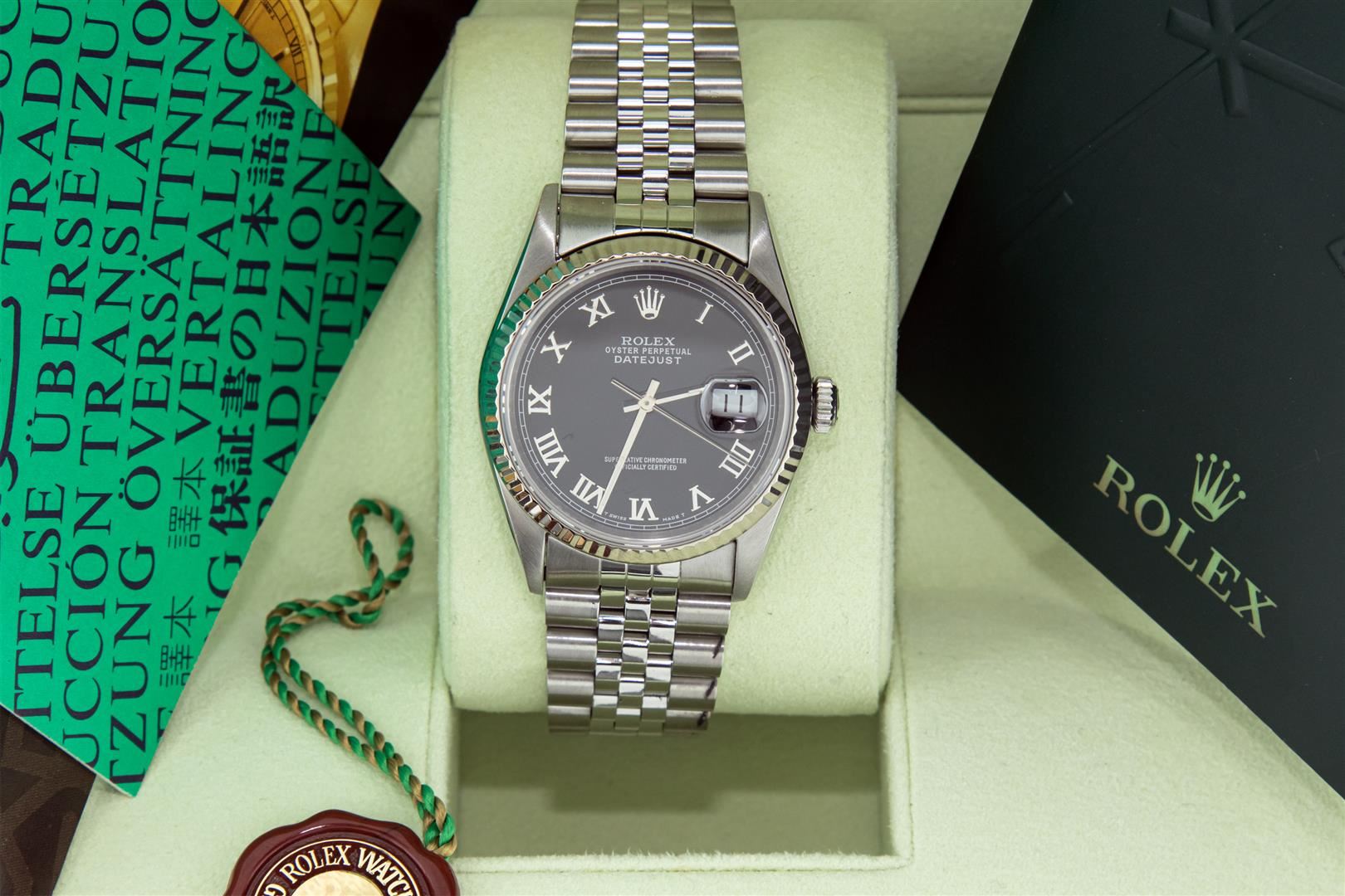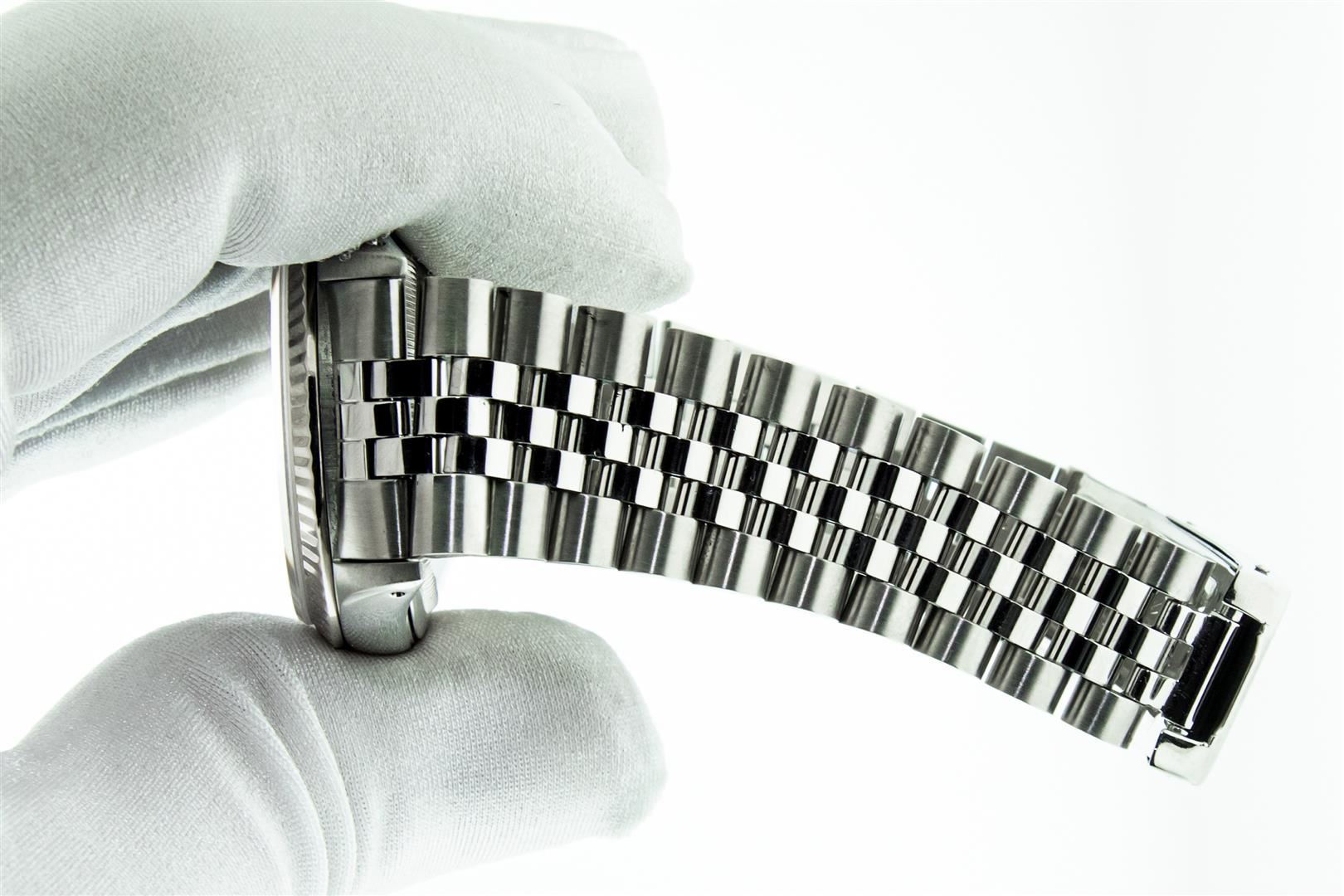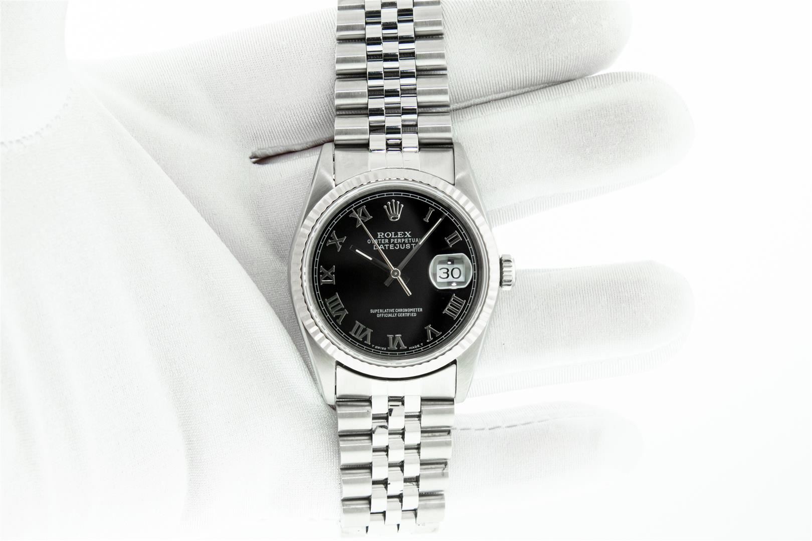 One Mens Pre Owned Stainless Steel Rolex Datejust Polished Bright with Satin Finish, This Watch Has Been Serviced & Electronically Tested, Stainless Steel Case: 36mm, Stainless Steel Crown, Original Bezel: 18K White Gold Fluted Bezel. Custom Crystal: New Scratch Resistant Sapphire Cyclops Crystal. Custom Hands: New Luminescent Hands. Rolex Movement: Automatic Winding Movement Caliber 3135. Original Dial: Rolex Black Dial With Roman Numerical Hour Markers Date Window: 3 O'Clock Position Date Display, Quickset, Model: Sapphire Datejust, Condition: G-6 Extra Fine. Rolex Bracelet: Stainless Steel Jubilee Band. Bright Polish & Satin Finish. 7.0 Inch Length, Adjustable. Standard Clasp, With Rolex Logo. This Watch Has Been Serviced Time Tested And Is In Excellent Condition It Is Free Of All Scratches And Dents. This Watch Comes With Rolex Box, 3 Rolex Booklets, Green Rolex Wallets, & Rolex Hang Tag.