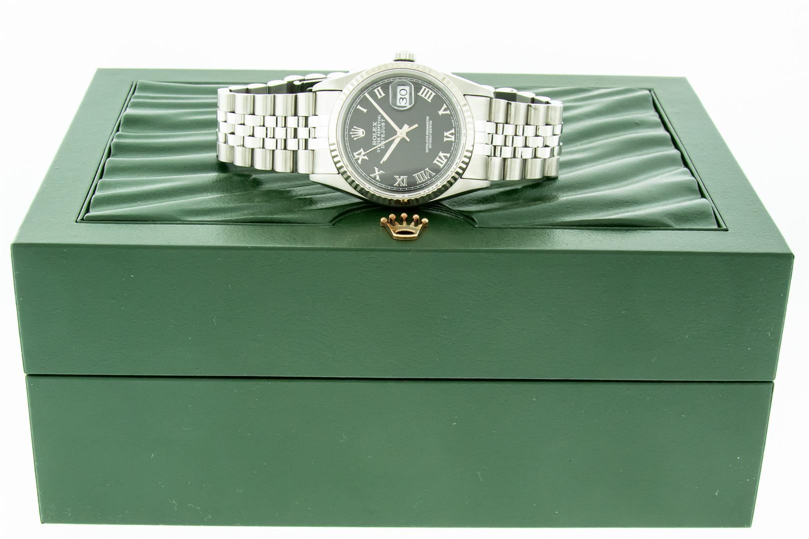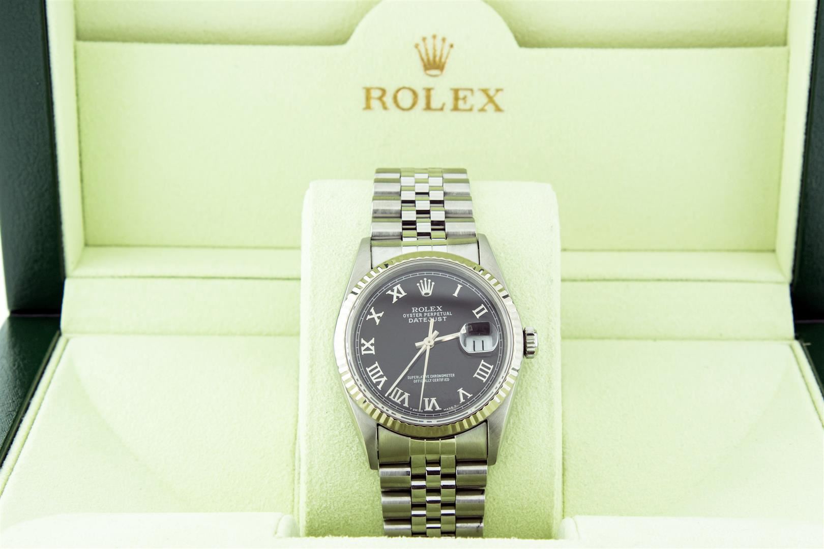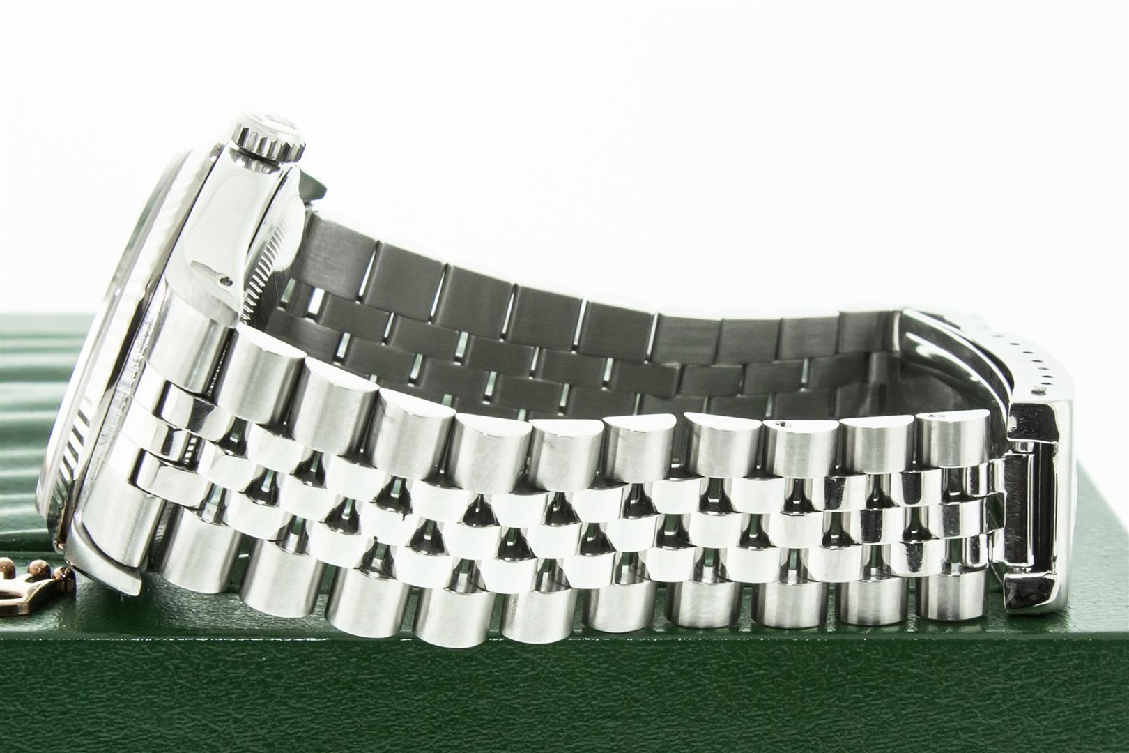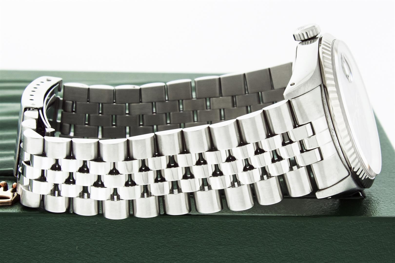 One Mens Pre Owned Stainless Steel Rolex Datejust Polished Bright with Satin Finish, This Watch Has Been Serviced & Electronically Tested, Stainless Steel Case: 36mm, Stainless Steel Crown, Original Bezel: 18K White Gold Fluted Bezel. Custom Crystal: New Scratch Resistant Sapphire Cyclops Crystal. Custom Hands: New Luminescent Hands. Rolex Movement: Automatic Winding Movement Caliber 3135. Original Dial: Rolex Black Dial With Roman Numerical Hour Markers Date Window: 3 O'Clock Position Date Display, Quickset, Model: Sapphire Datejust, Condition: G-6 Extra Fine. Rolex Bracelet: Stainless Steel Jubilee Band. Bright Polish & Satin Finish. 7.0 Inch Length, Adjustable. Standard Clasp, With Rolex Logo. This Watch Has Been Serviced Time Tested And Is In Excellent Condition It Is Free Of All Scratches And Dents. This Watch Comes With Rolex Box, 3 Rolex Booklets, Green Rolex Wallets, & Rolex Hang Tag.