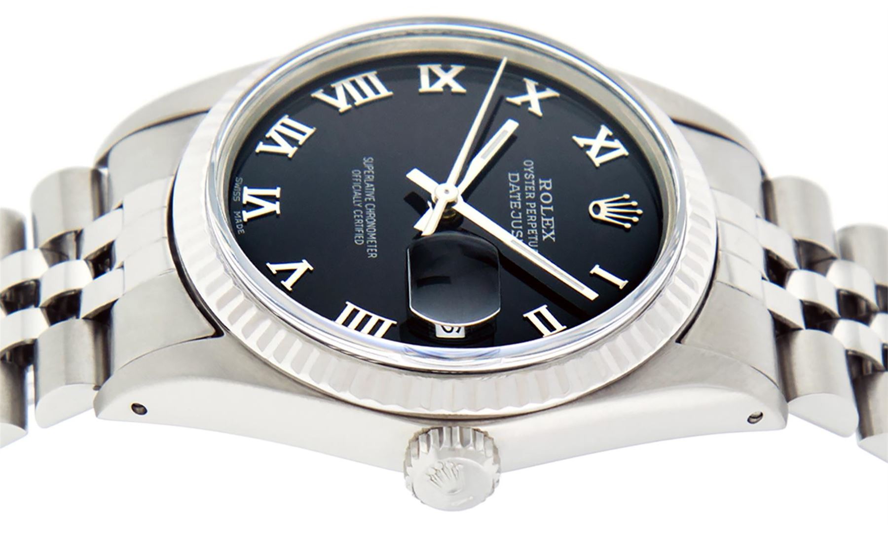 One Mens Stainless Steel Rolex Datejust Polished Bright with Satin Finish, Serviced & Electronically Tested, Stainless Steel Case: 36mm, Stainless Steel Crown, Bezel: 14K White Gold Fluted Bezel. Custom Crystal: New Acrylic Cyclops Lens. Custom Hands: New Hands. Movement: Automatic Winding Movement. Custom Dial: Black Roman. Date Window: 3 O'Clock Position Date Display, Quickset, Model: Datejust, Condition: G-6 Extra Fine. Bracelet:Stainless Steel Jubilee. Bright Polish & Satin Finish. 7.0 Inch Length, Adjustable. Standard Clasp, With Rolex Logo. Watch Has Been Serviced And Polished It Is Free Of All Scratches And Dents.