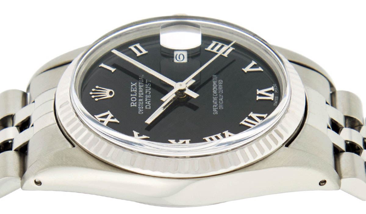 One Mens Rolex Datejust Polished Bright with Satin Finish, Serviced & Electronically Tested, Stainless Steel Case:36mm, Stainless Steel Crown, Bezel: 14K White Gold Fluted Bezel. Custom Crystal: Acrylic Cyclops Lens. Movement: Automatic Winding Movement Caliber 3035. Custom Dial: Black Roman Dial. Date Window: 3 O'Clock Position Date Display, Quickset, Model: Datejust Condition: G-6 Extra Fine. Bracelet: Stainless Steel Jubilee Band. Bright Polish & Satin Finish. 7.0 Inch Length, Adjustable. Standard Clasp, With Rolex Logo. This Watch Has Been Serviced and Polished And It Is Free Of All Dents And Scratches And Has Been Time Tested.