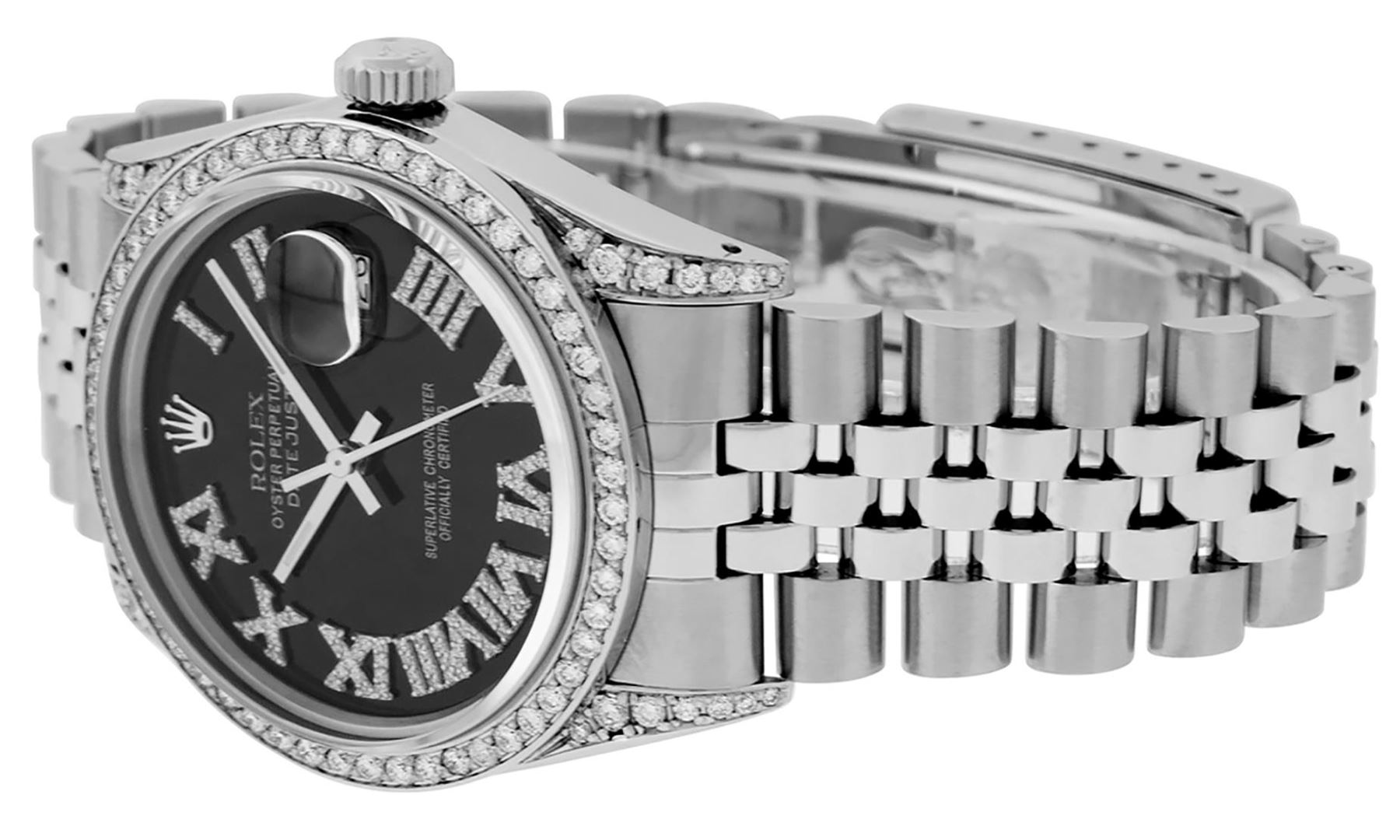 One Mens Pre Owned Stainless Steel Rolex Datejust Polished Bright with Satin Finish, Serviced And Electronically Tested, Rolex Stainless Steel Case: 36mm, Custom Diamond Lugs: 24 Diamonds On Lugs. Stainless Steel Crown, New Custom Bezel: Stainless Steel Set Diamond Bezel, Diamond Count: 54 Diamonds On Bezel. Custom Crystal: New Sapphire With Magnified Date Window. Rolex Movement: Automatic Winding Movement 3035. Custom Dial: Custom Black Dial With Added Roman Diamond Hour Markers. Date Window: 3 O'Clock Position Date Display, Quickset, Model: Quickset Datejust, Condition: G-6 Extra Fine. Rolex Bracelet: Stainless Steel Jubilee Band. Bright Polish And Satin Finish. 7.0 Inch Length, Adjustable. Standard Clasp, With Rolex Logo. This Watch Has Been Serviced Time Tested And Is In Excellent Condition It Is Free Of All Scratches And Dents.
