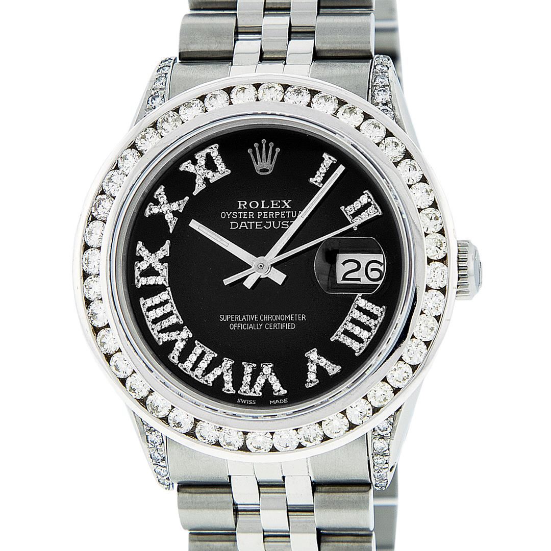 One Mens Stainless Steel Rolex Datejust Polished Bright with Satin Finish, Serviced & Electronically Tested, Stainless Steel Case: 36mm, Diamond Lugs: 24 Diamonds On Lugs, Color: G to H, Clarity: SI-VS. Stainless Steel Crown, New Custom Bezel: 18K White Gold 3.00 Ctw Diamond Bezel, Diamond Count: 40 Diamonds, Total Weight 3.0 Carat, Clarity: SI-VS, Color: G to H. Custom Crystal: New Scratch Resistant Synthetic Sapphire Cyclops Lens. Movement: Automatic Winding Movement. Custom Dial: Black Roman Diamond Dial, Diamond Color: G To H In Color, Clarity: SI-VS. Date Window: 3 O'Clock Position Date Display, Quickset, Model: Quickset Datejust, Condition: G-6 Extra Fine. Bracelet: Stainless Steel Jubilee Band. Bright Polish & Satin Finish. 7.0 Inch Length, Adjustable. Standard Clasp, With Rolex Logo. This Watch Has Been Serviced Time Tested And Is In Excellent Condition It Is Free Of All Scratches And Dents. This Watch Also Comes With A Brand New Wooden Watch Winder.